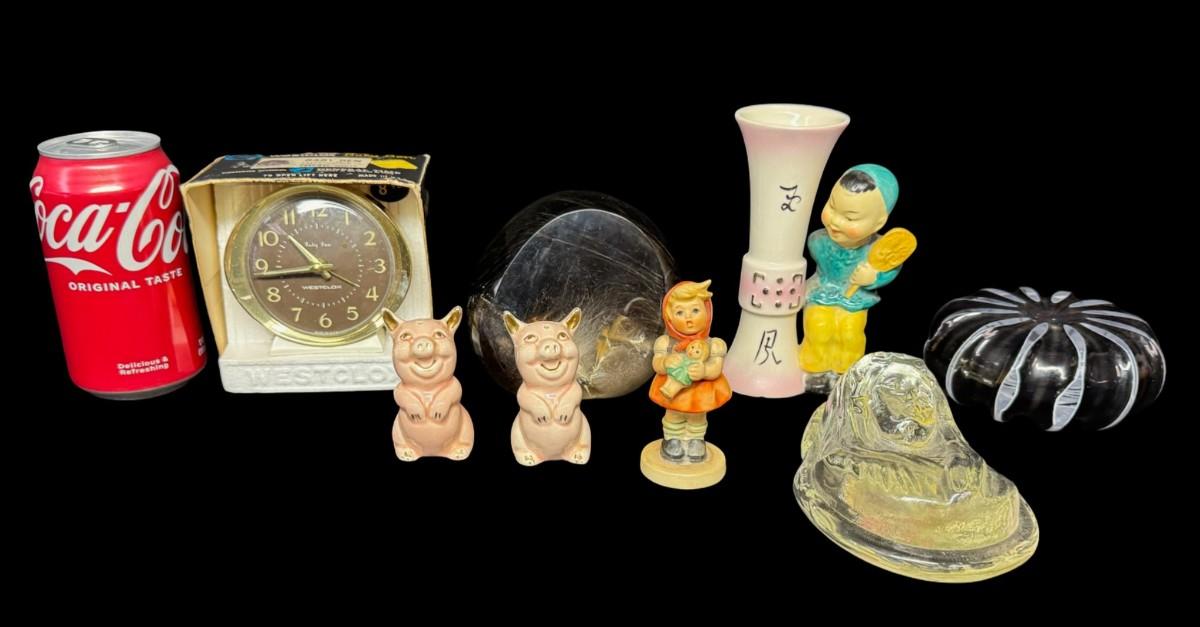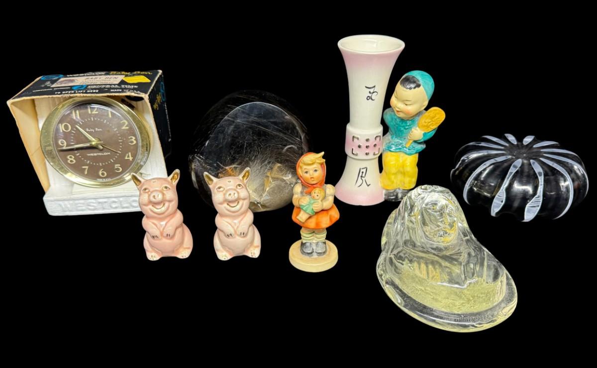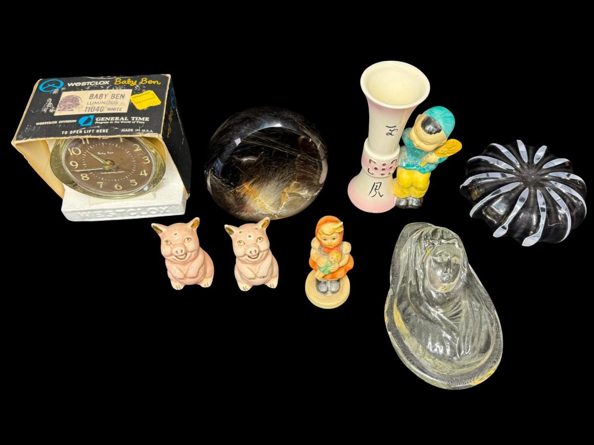 Includes an NOS Baby Ben Westclox alarm clock, a Hummel, pig salt and pepper shakers, a crystal Virgin Mary, a paperweight, and more. Total of eight pieces. The paperweight is chipped (pictured). Measurement of tallest: 5”. [BK]