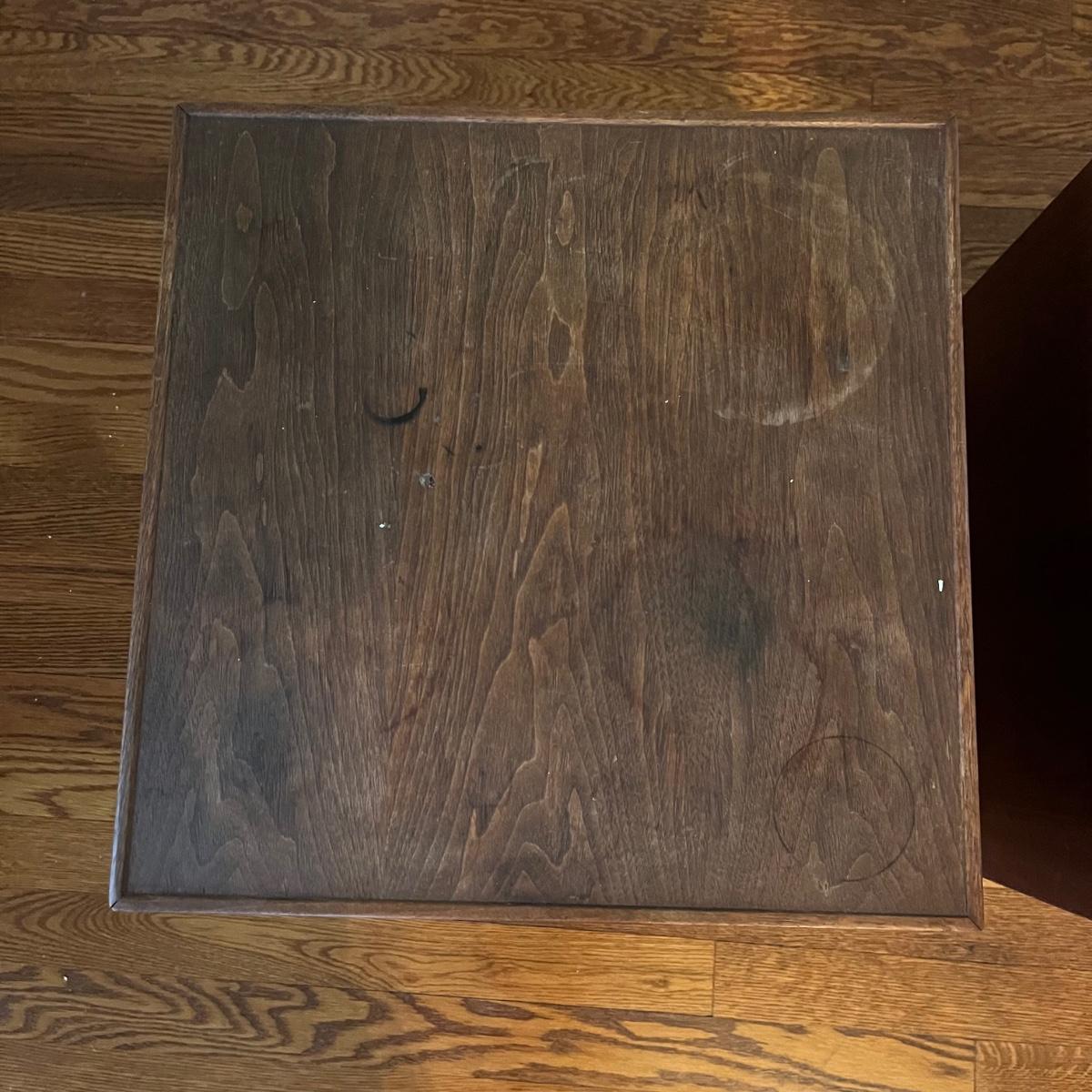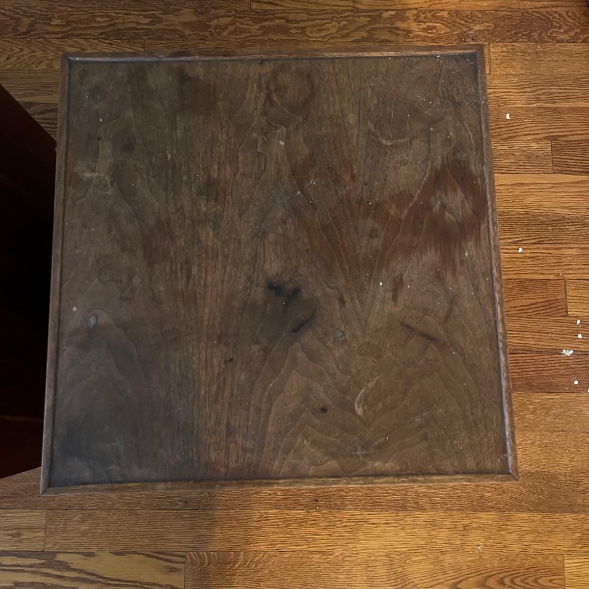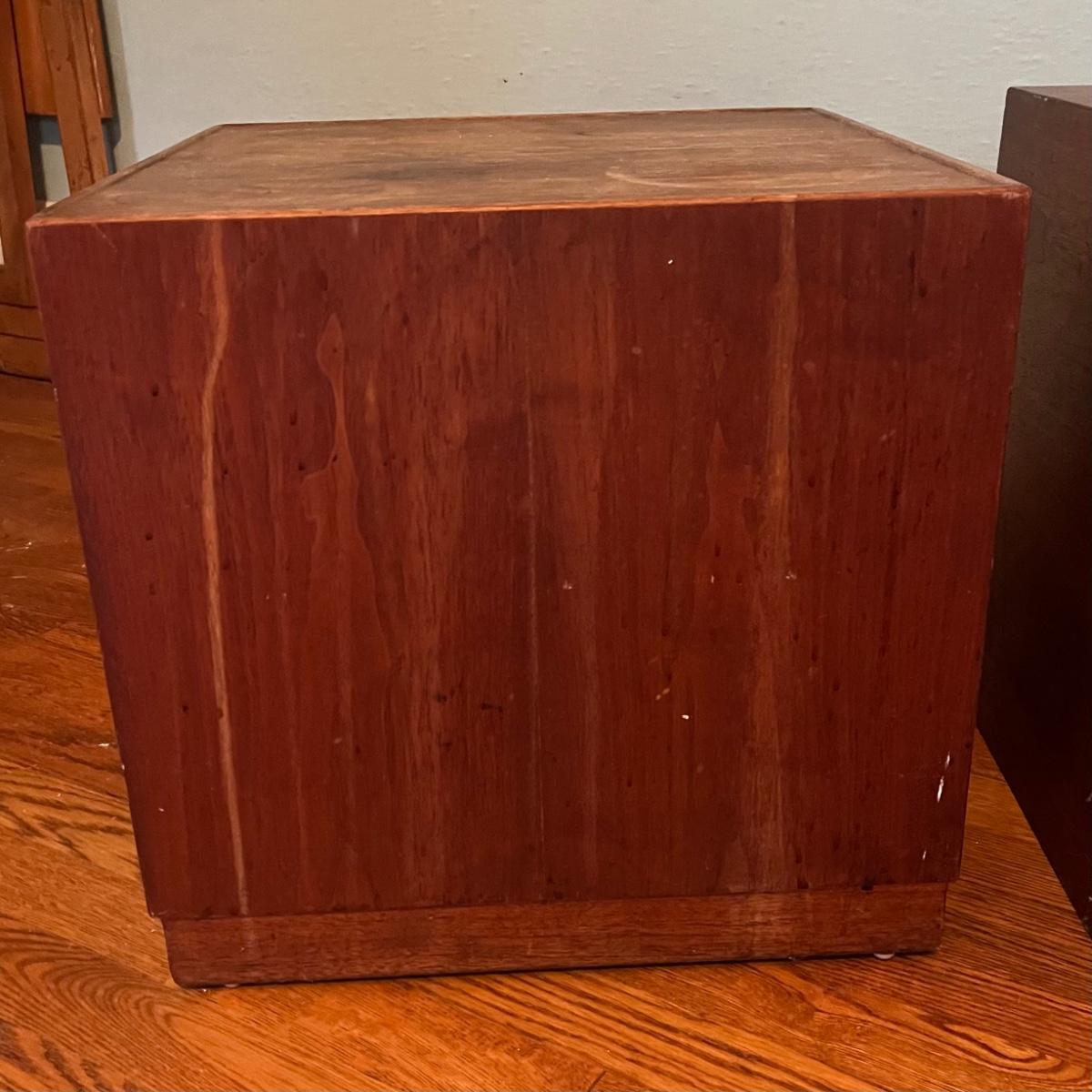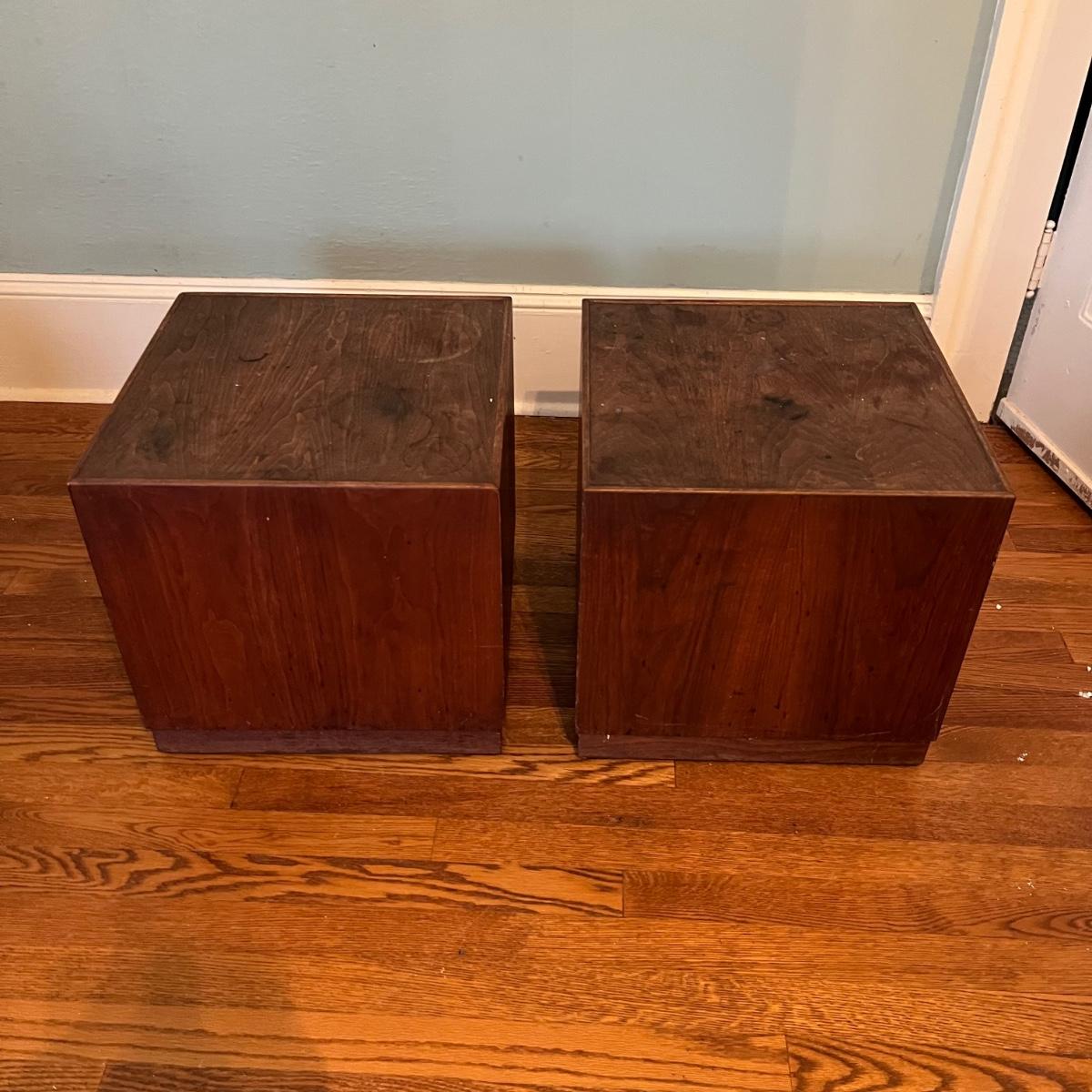 A pair of Mid-Century Modern wooden cube side tables. Measuring 16” x 16” x 15.5H. Hollow in the inside. Much wear.