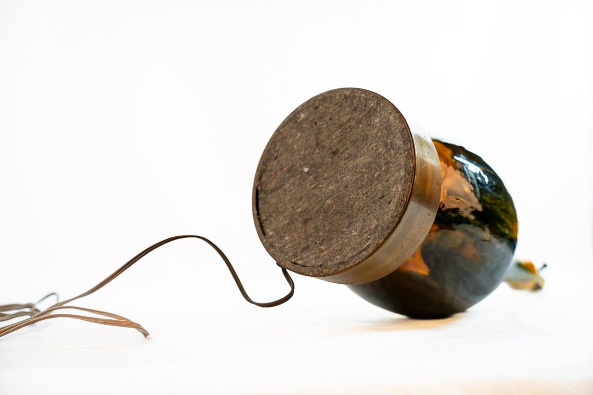 Mid-Century Modern, often associated with the "Etruscan" style. Features a drip or "lava" glaze in shades of green, yellow, and brown. Tested, works as expected, designed for use with a 3-way bulb.