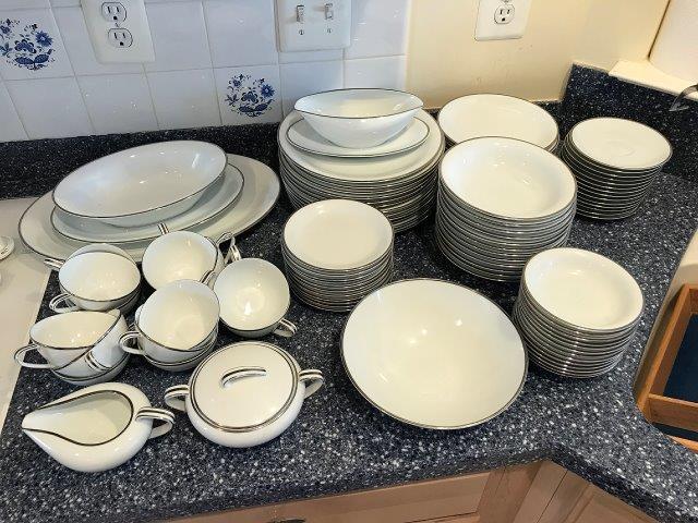 Set is white with silver band edge. Includes 12 dinner plates, 12 salad plates, 11 bread plates, 14 saucers, 14 teacups, 13 berry bowls, 12 soup bowls, cream & covered sugar, gravy with attached underplate, oval vegetable, round vegetables, small platter, medium platter. Small chips on two dinner plates, two soup bowls, and oval vegetable.