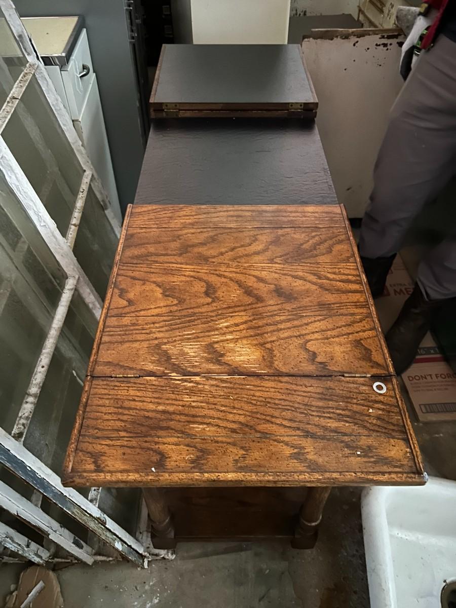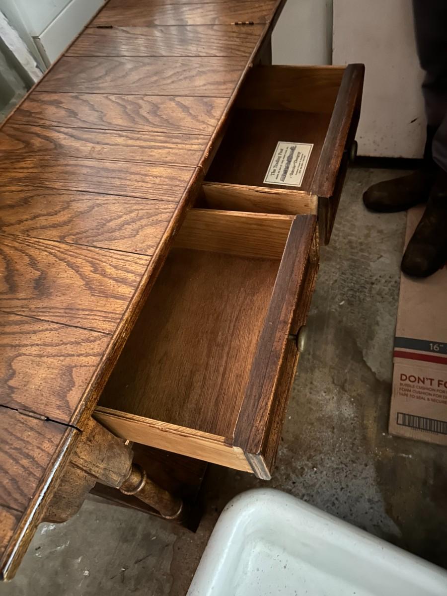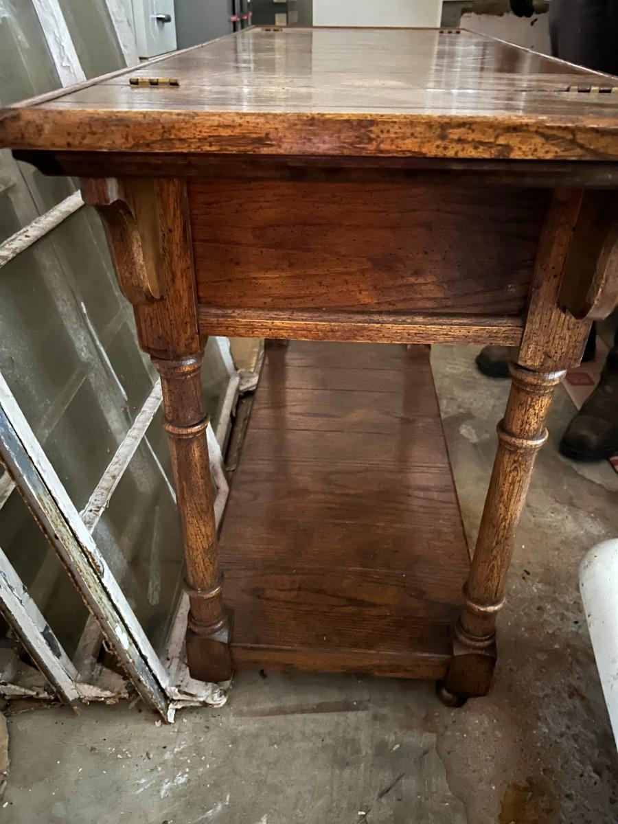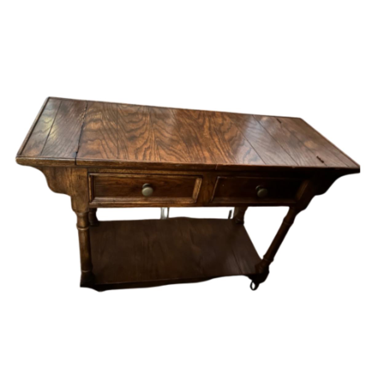 Features - Two smooth opening drawers, hinged extensions, bottom shelf, and working wheels.