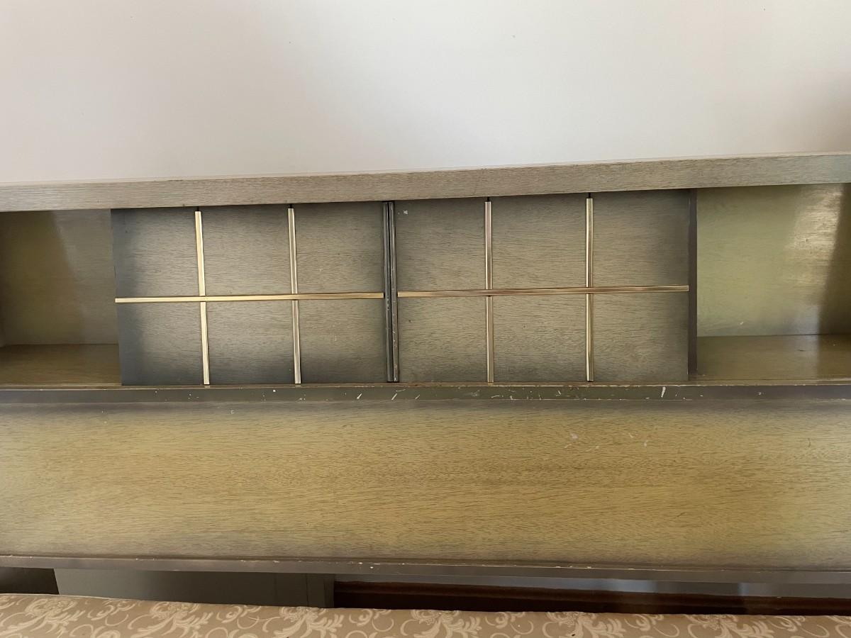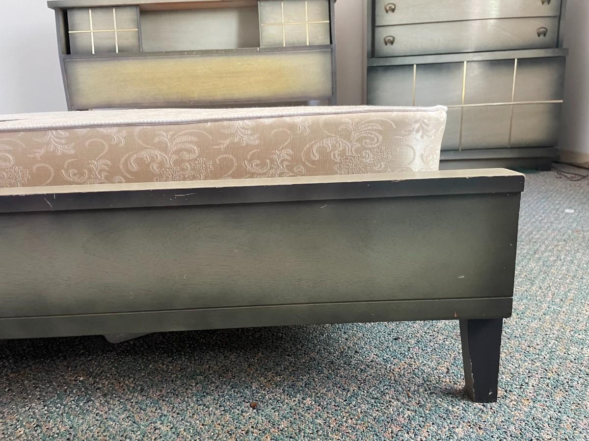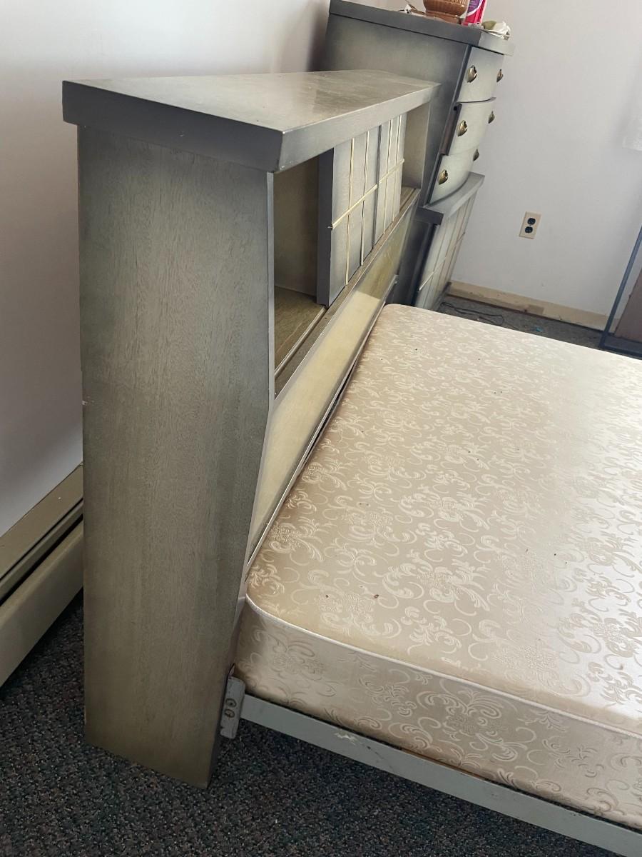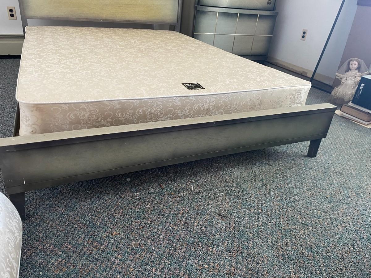 Full-size bed with headboard and footboard. Headboard has storage for decorative items. Matching dressers and nightstands are available in Lot 112 and Lot 113. Mattress not included. 85L x 57 1/2W x 37H.
