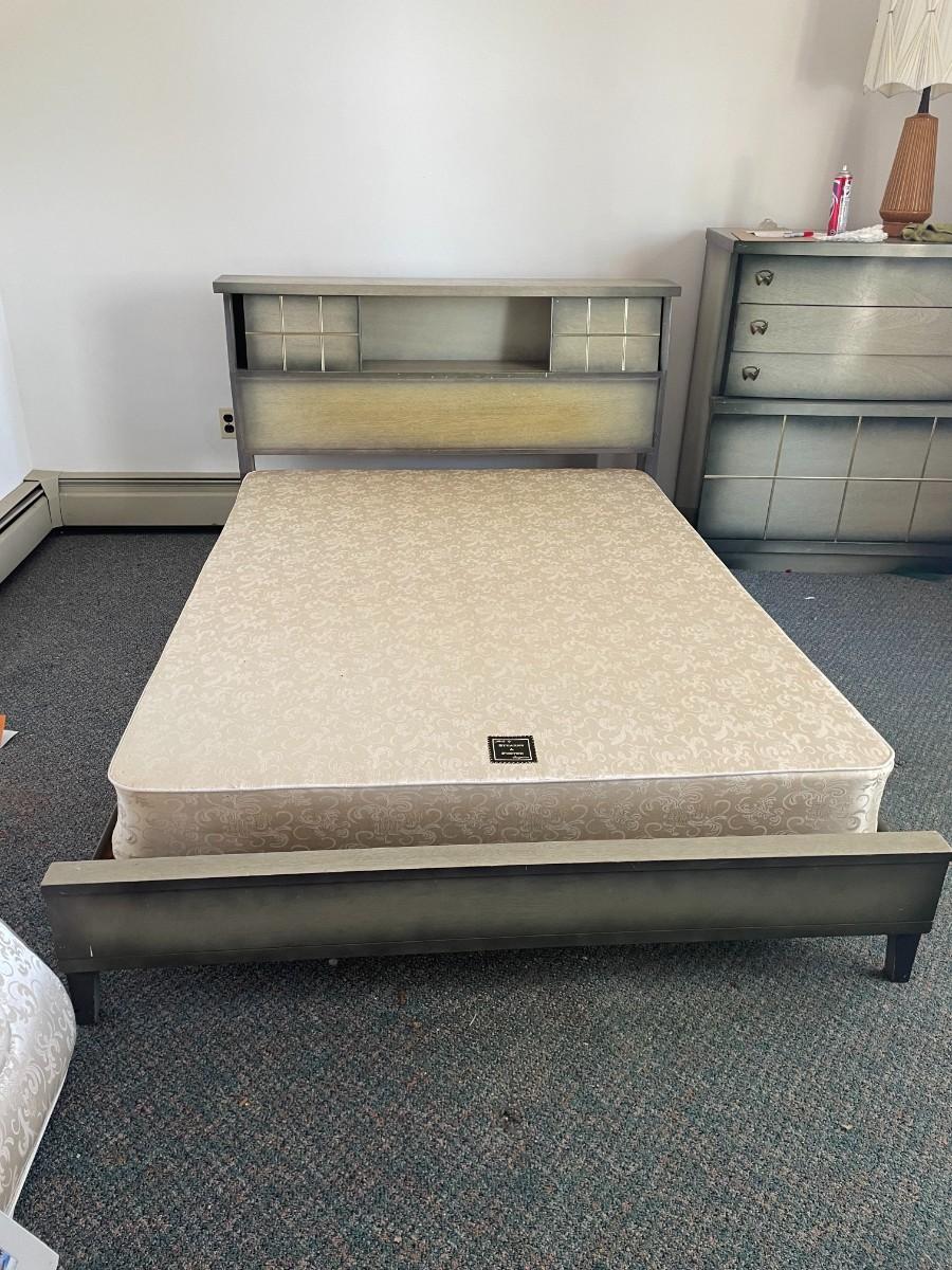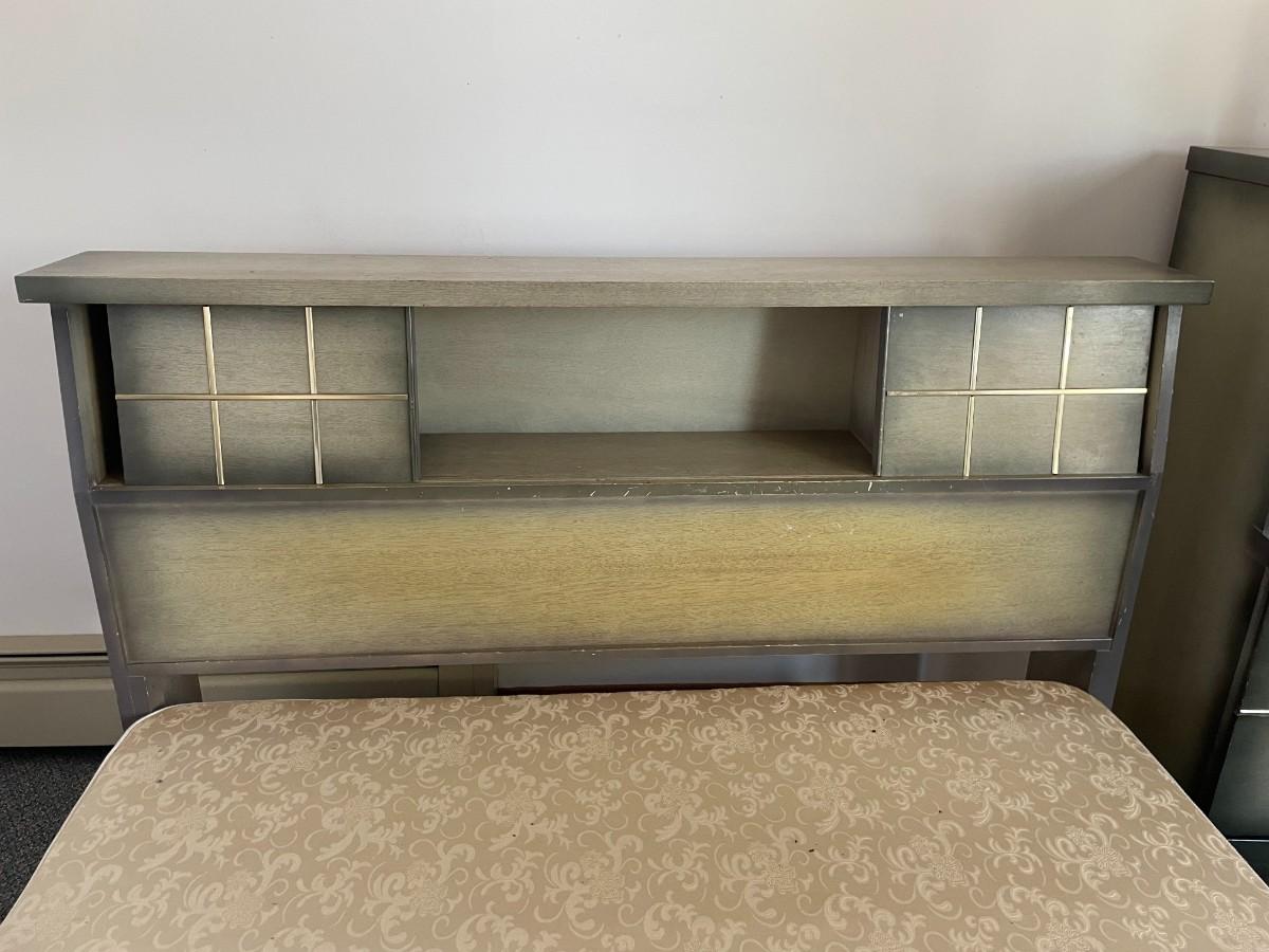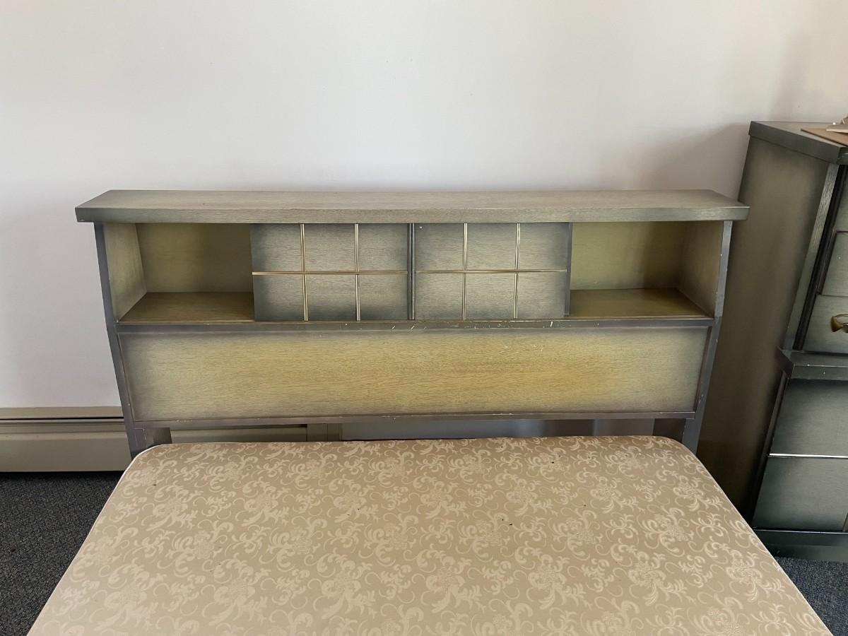Full-size bed with headboard and footboard. Headboard has storage for decorative items. Matching dressers and nightstands are available in Lot 112 and Lot 113. Mattress not included. 85L x 57 1/2W x 37H.