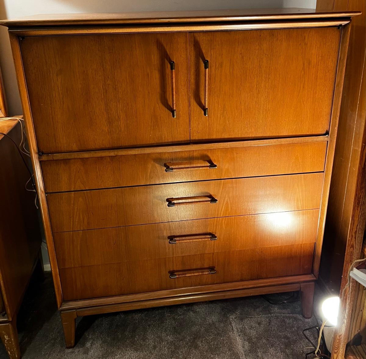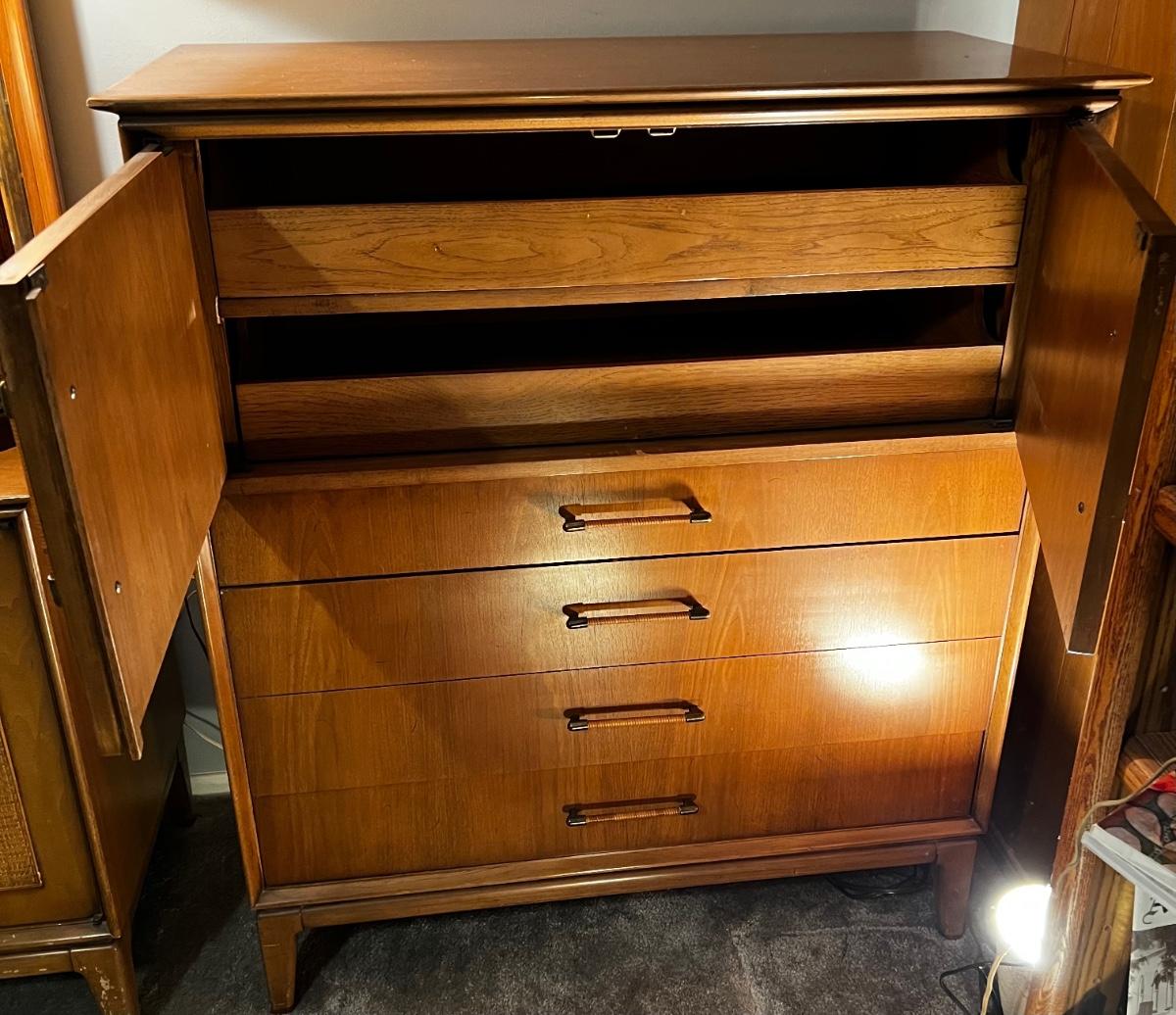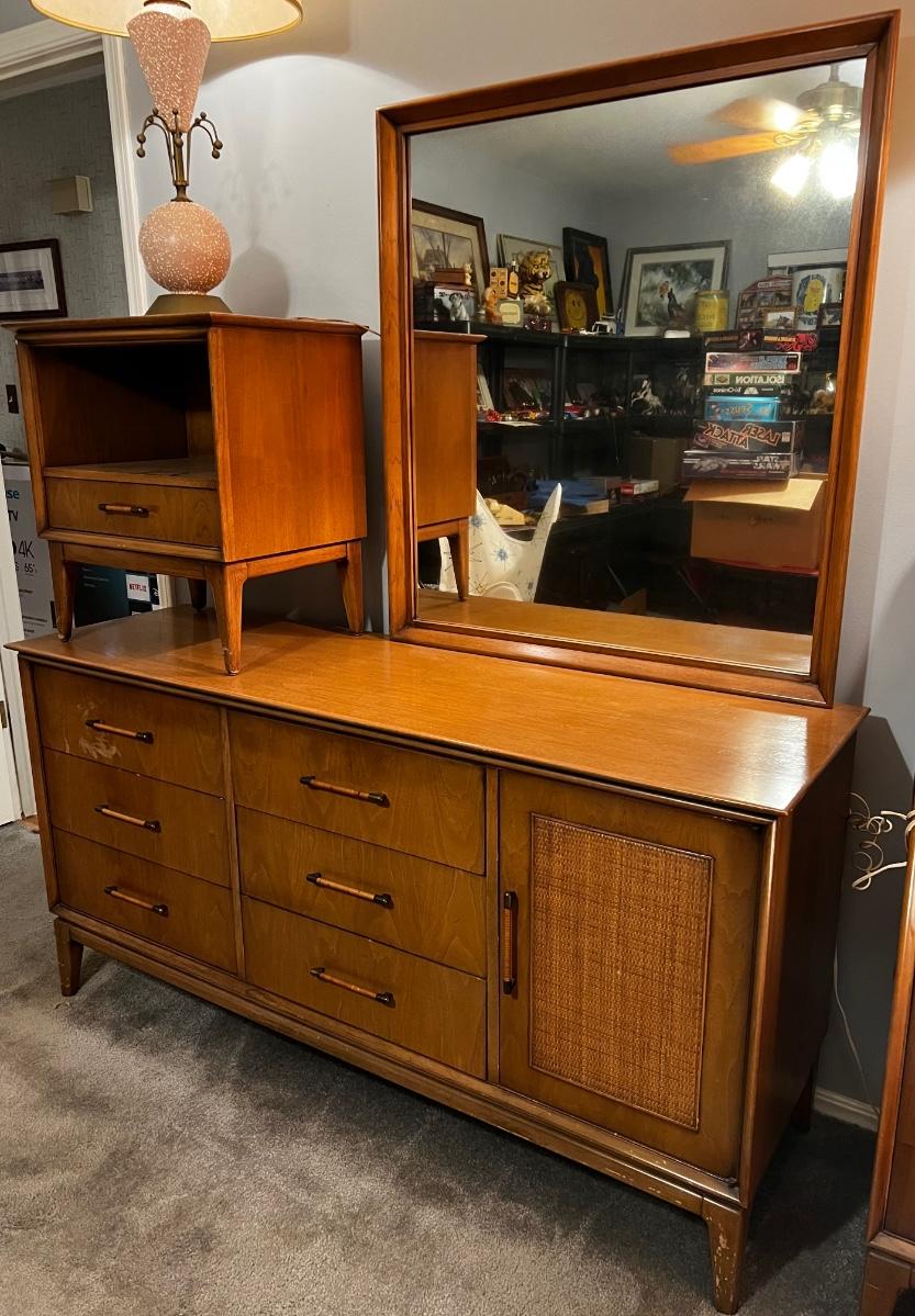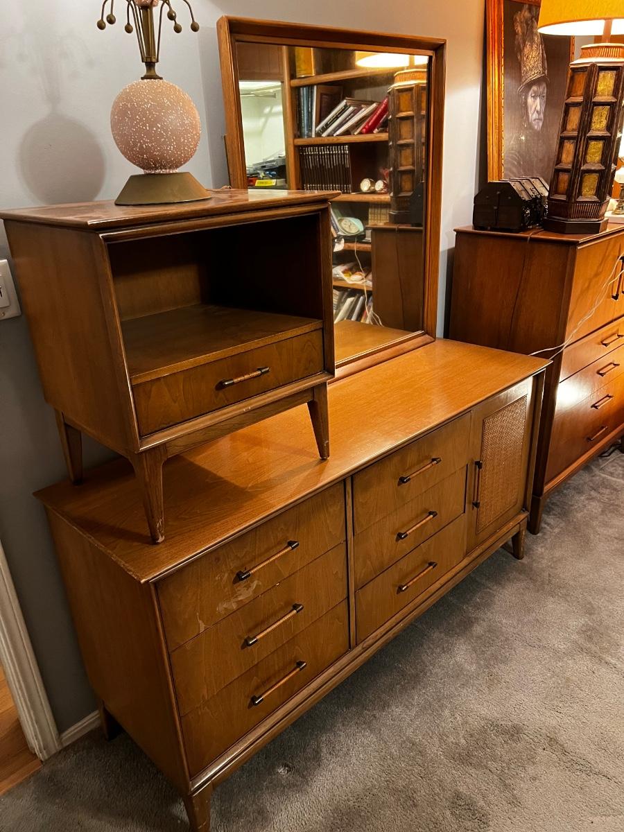 Mid-Century Modern King Size Bed set by Century Furniture Co. Dresser with Mirror, High Boy Dresser, Night Stand, King size Head board.