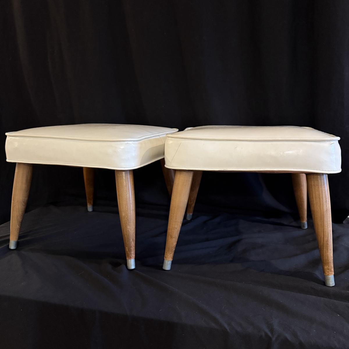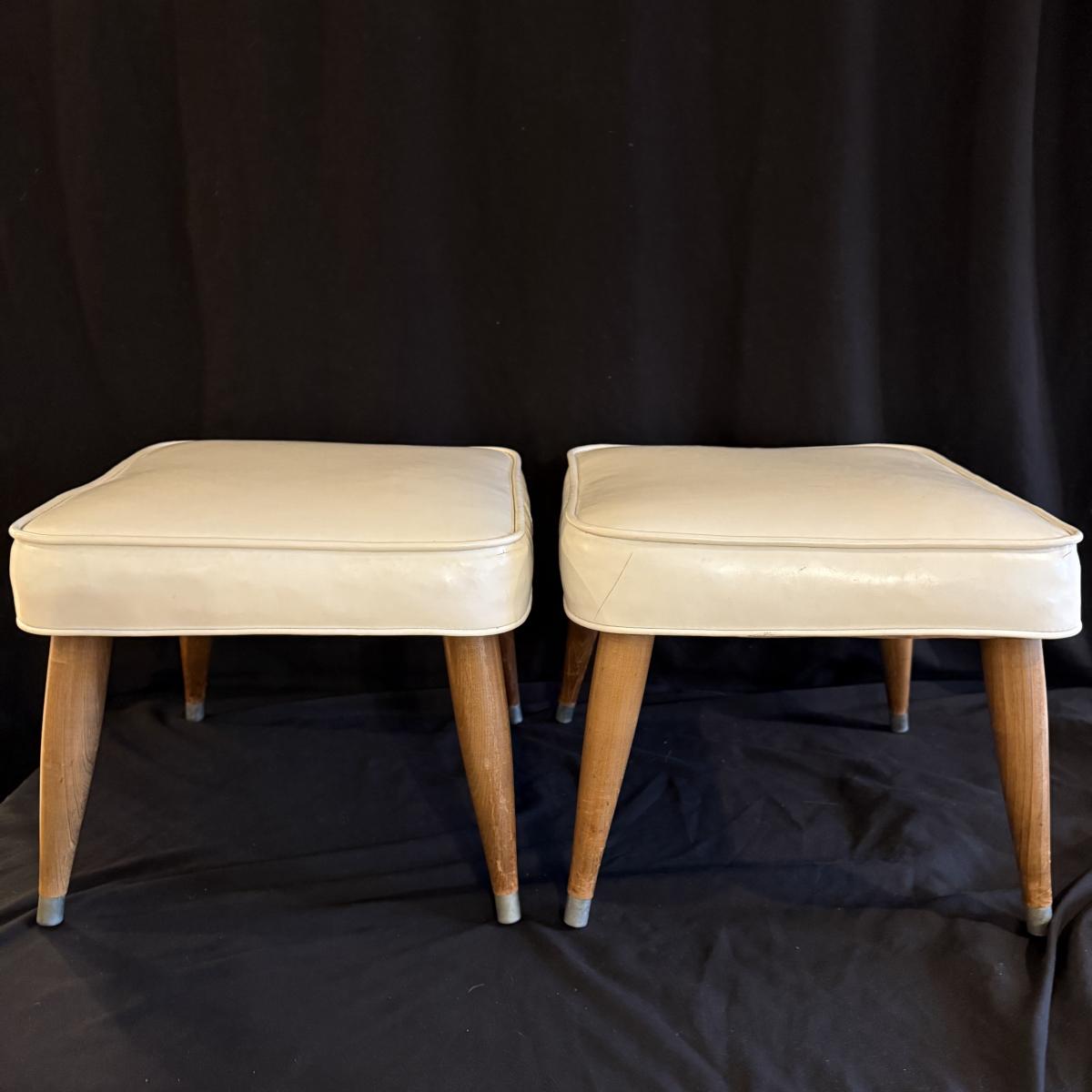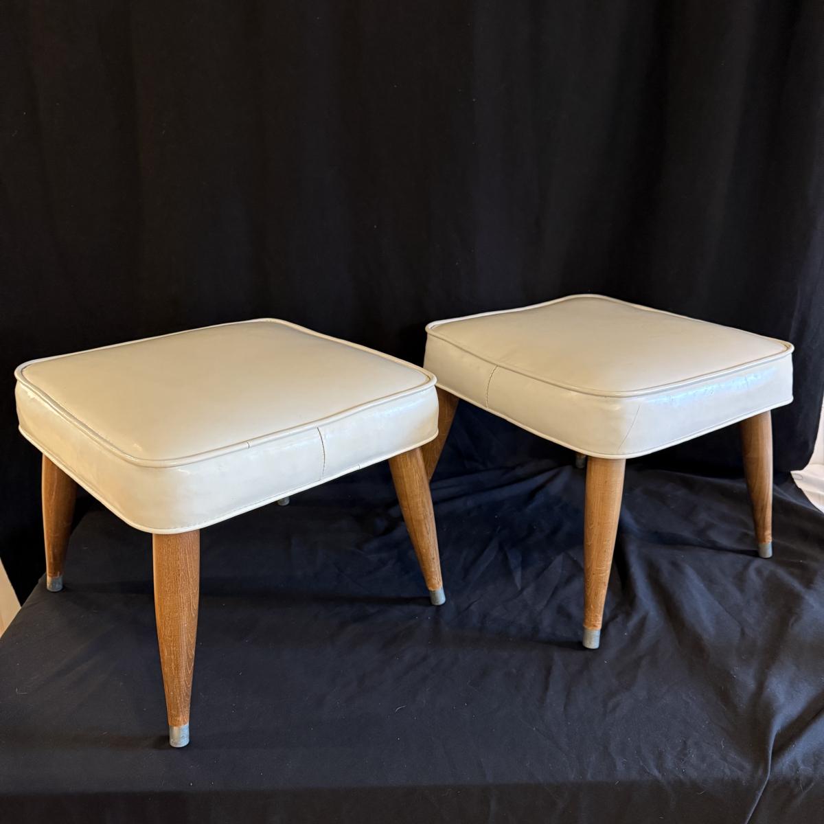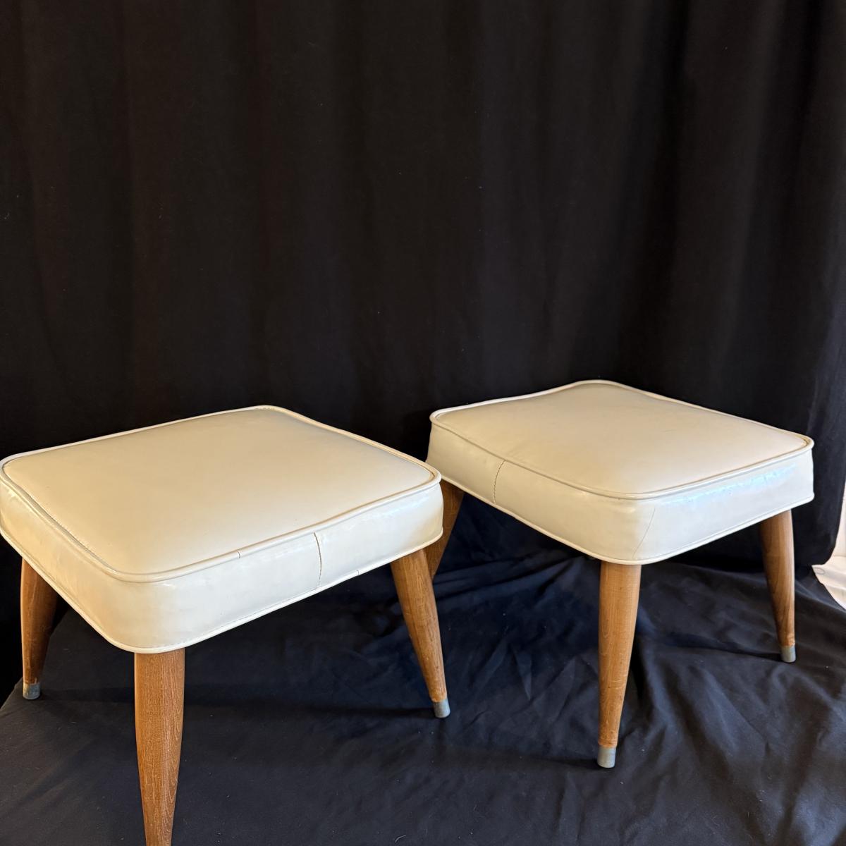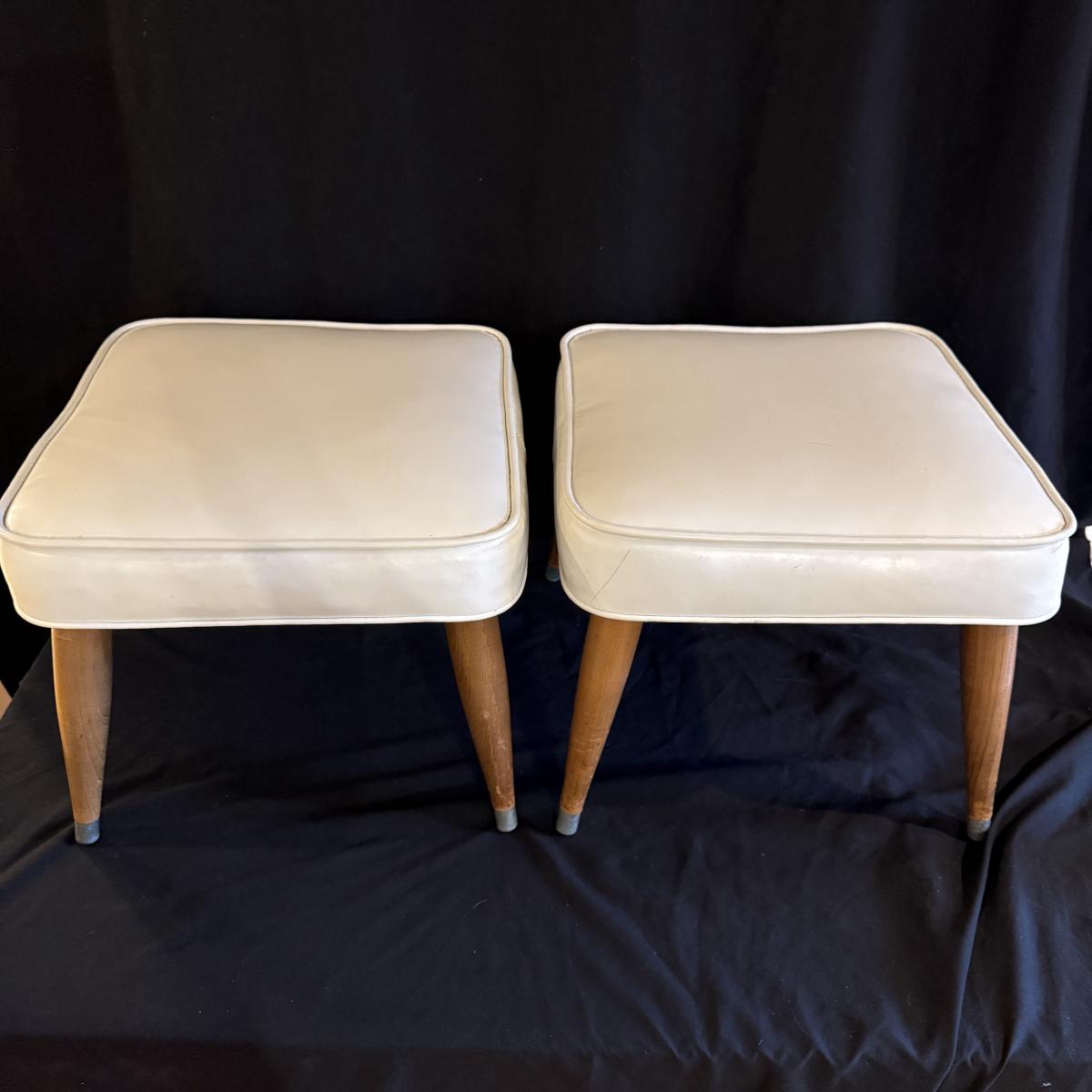 This lot contains a set of matching white stools that appear to be a cream vinyl type upholstery with wooden legs. These groovy guys both measure 16” x 16” x 13”H. The legs attach via screws. There are a few scratches and scuffs in the upholstery. See pictures for details. Neither stool has any identifying marks.