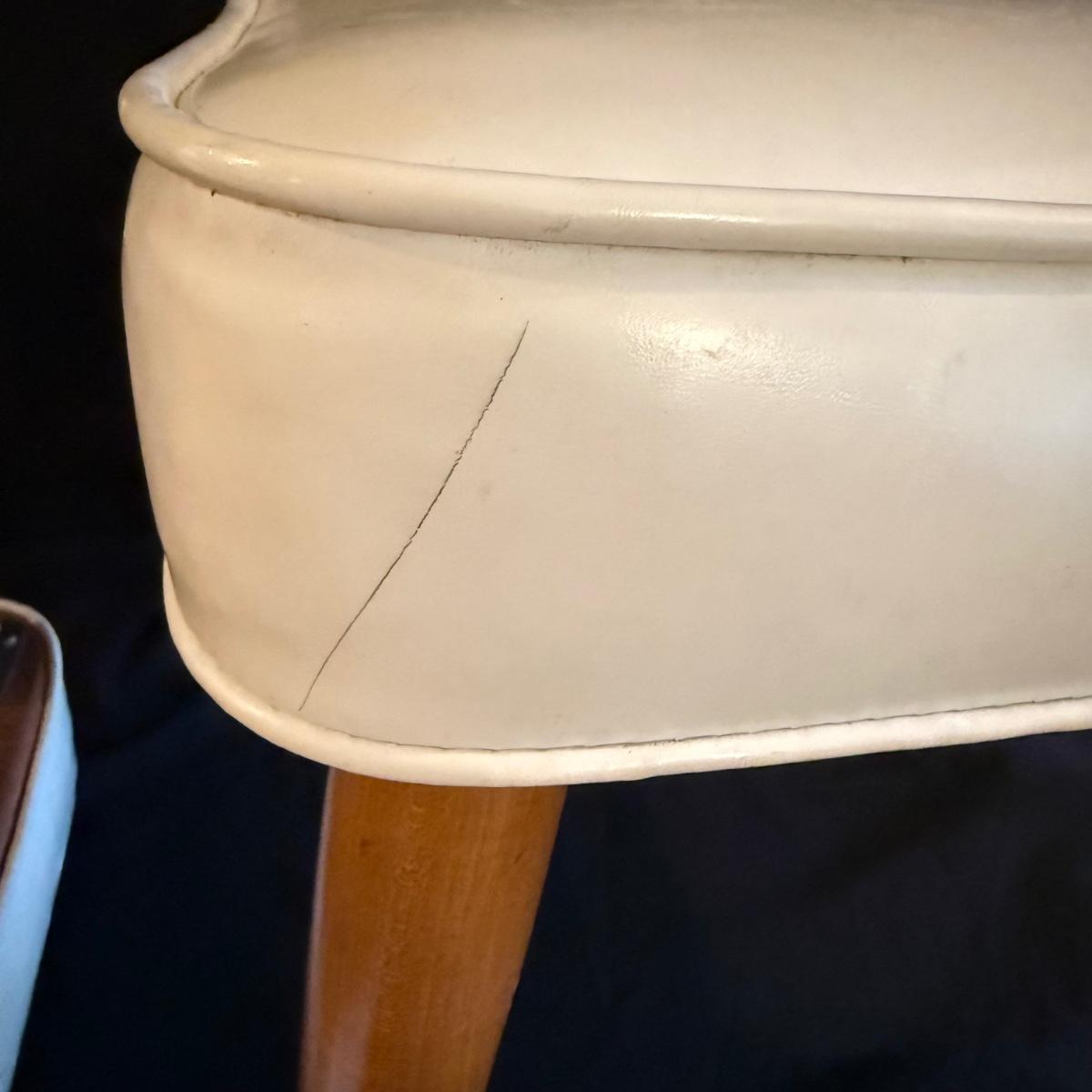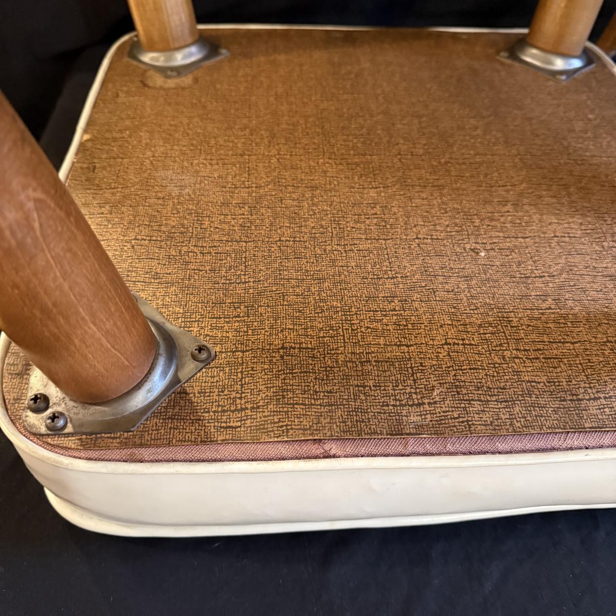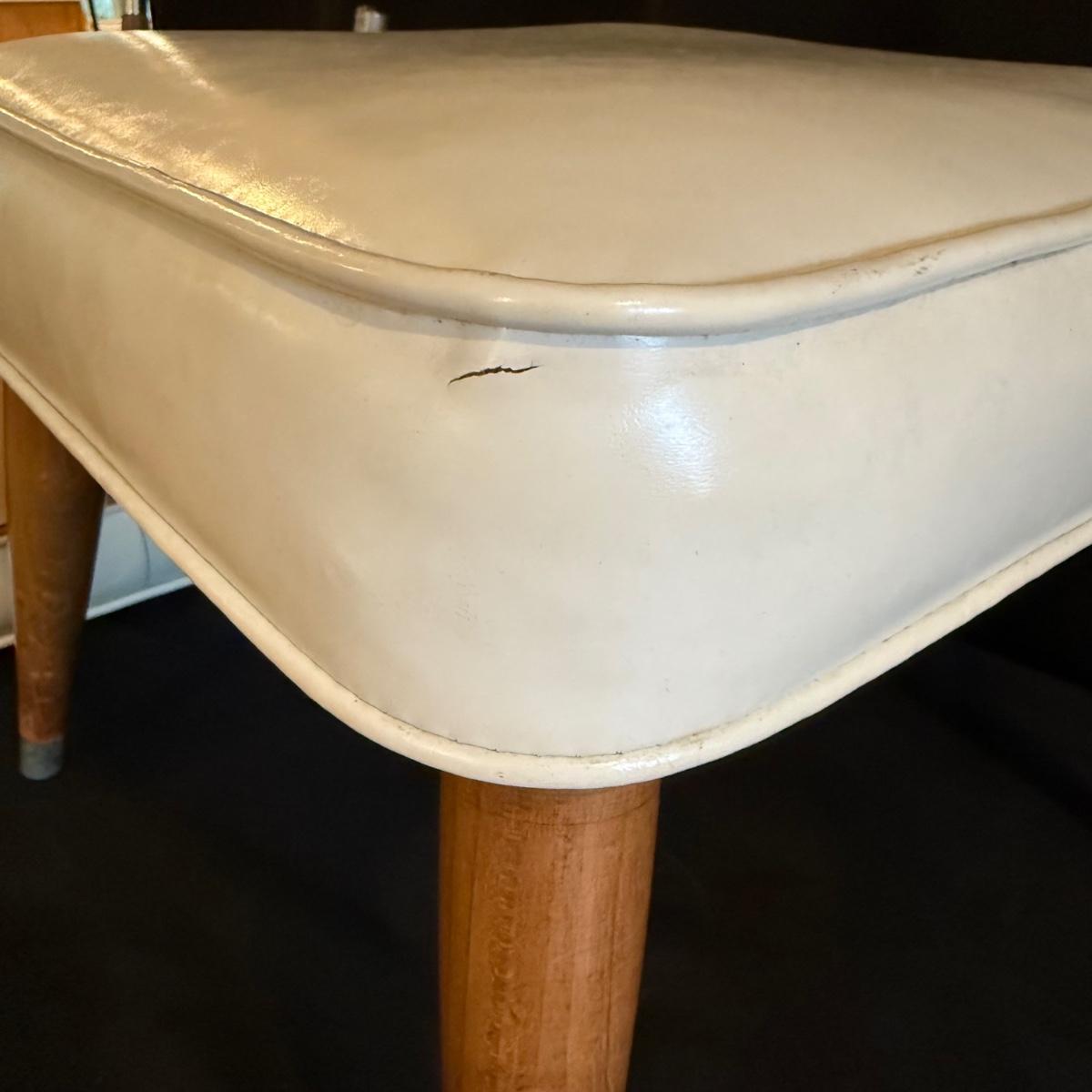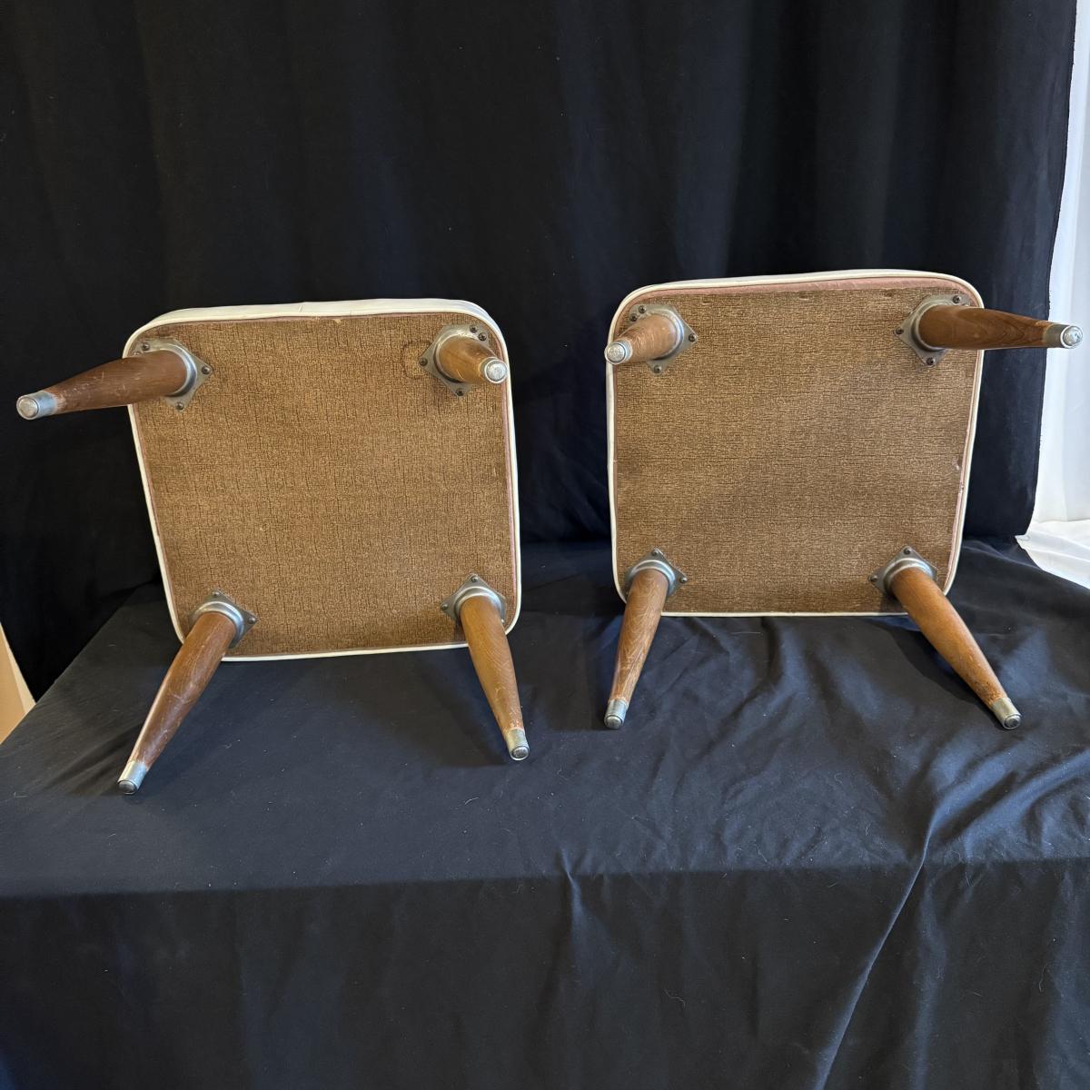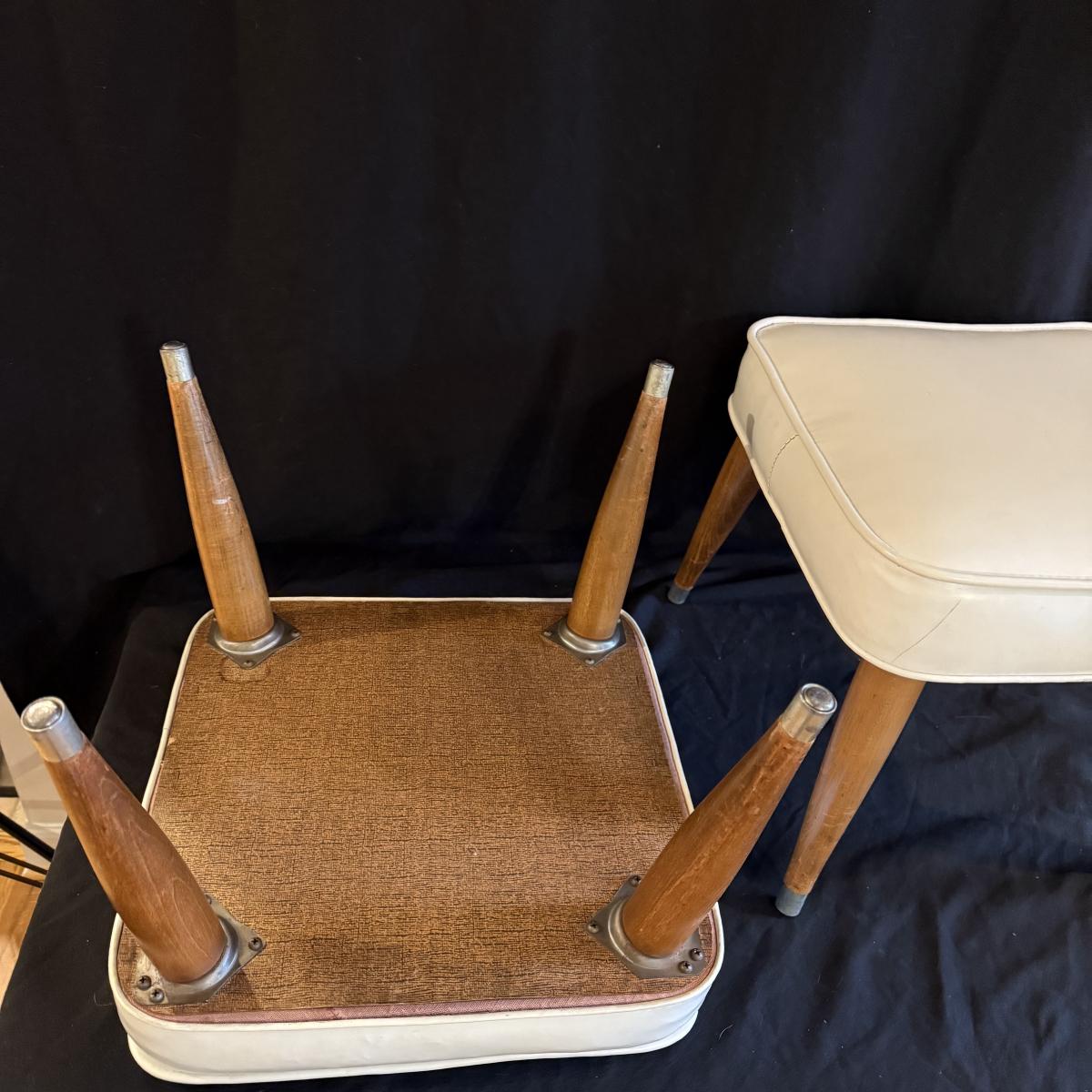 This lot contains a set of matching white stools that appear to be a cream vinyl type upholstery with wooden legs. These groovy guys both measure 16” x 16” x 13”H. The legs attach via screws. There are a few scratches and scuffs in the upholstery. See pictures for details. Neither stool has any identifying marks.