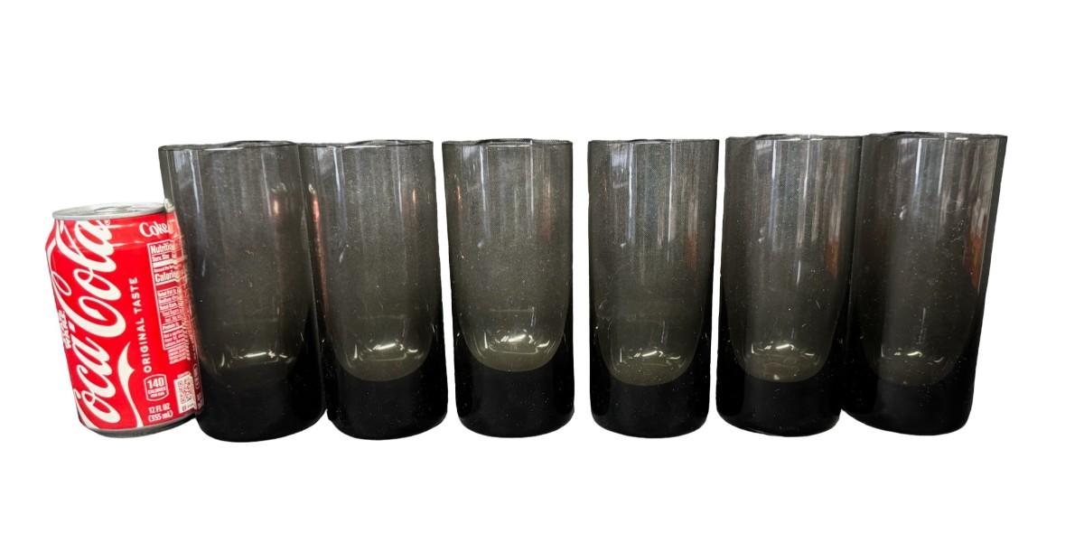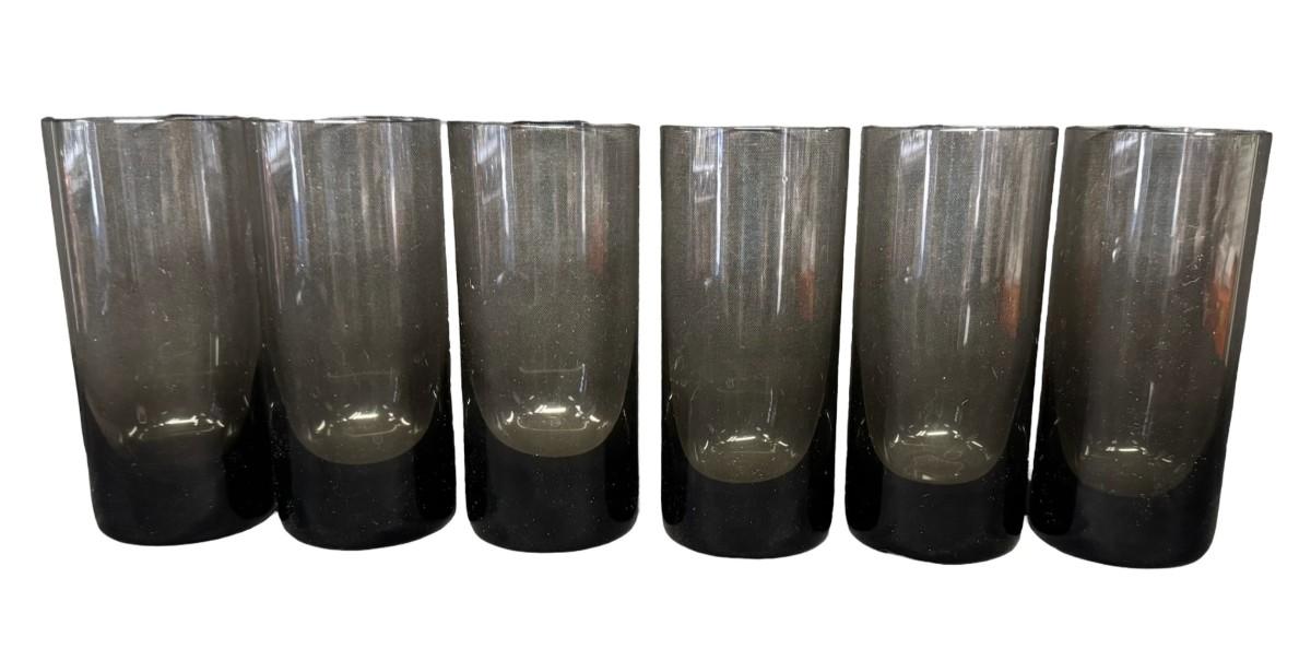 Total of six smoky colored glasses. Made in Czechoslovakia. No obvious chips or cracks. Measurement: 6”H (each). Pre-auction estimate: $200-$300. [RE]