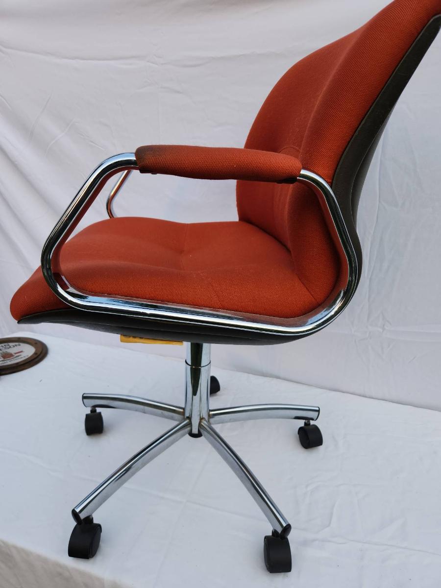 Mid-Century Modern office chair featuring an orange upholstered seat and back, complemented by a chrome metal frame and armrests for a sleek design. The chair is equipped with a five-star chrome base and caster wheels for mobility and an adjustable height mechanism for functionality. Minor surface wear consistent with prior use but in overall good condition.