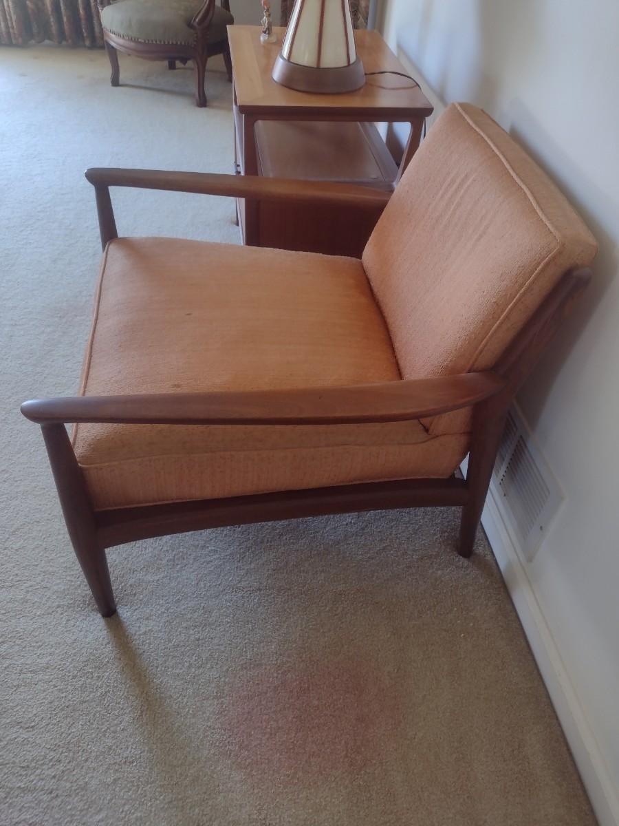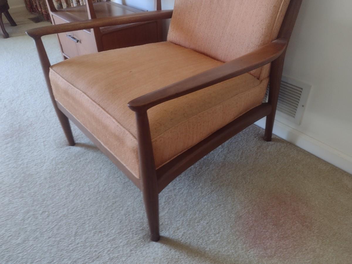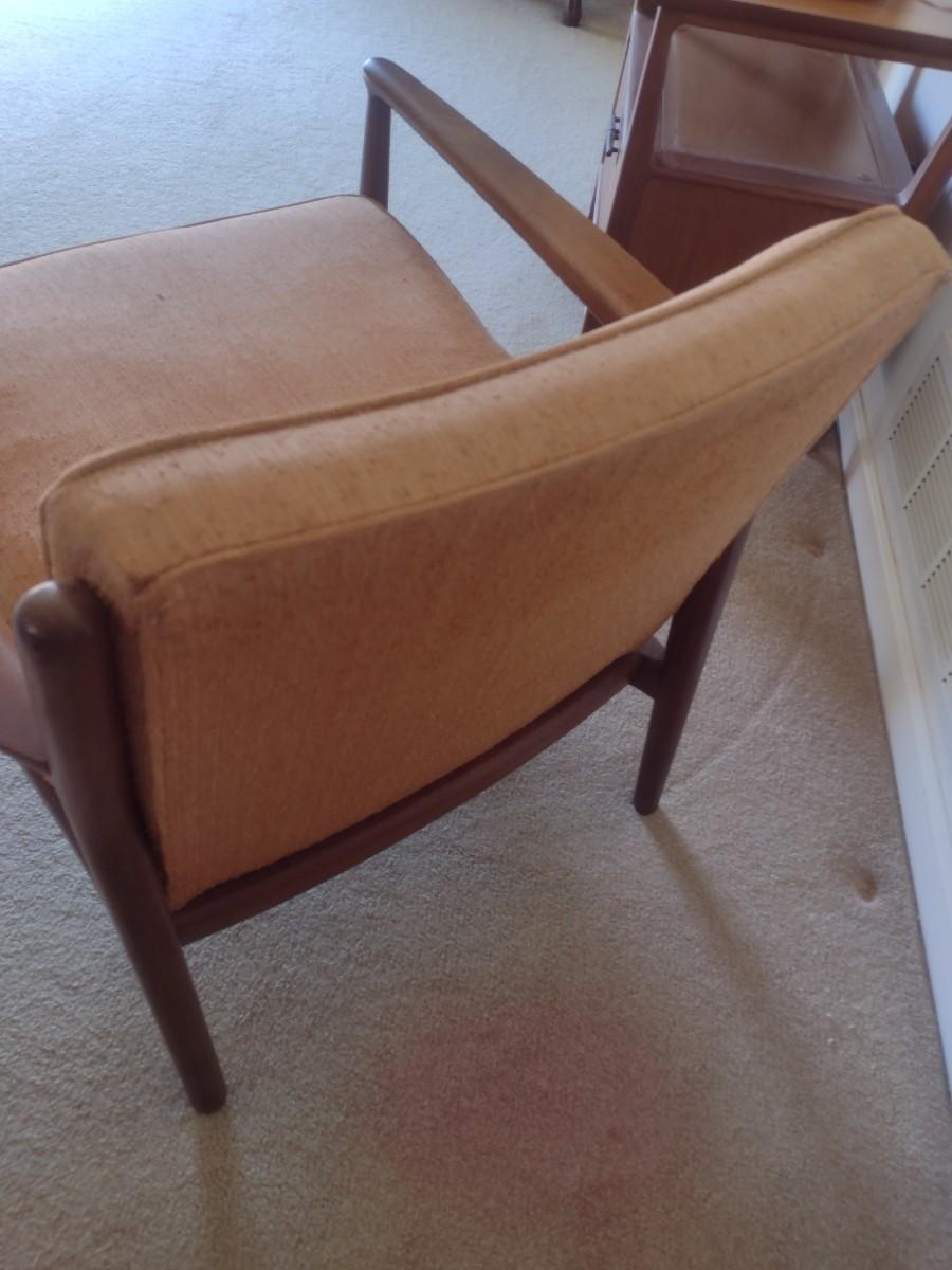 Mid-Century Modern Scandanavian Design Wood Framed Armchair with Upholstered Seat and Back tag is present but obscured by wood stain.