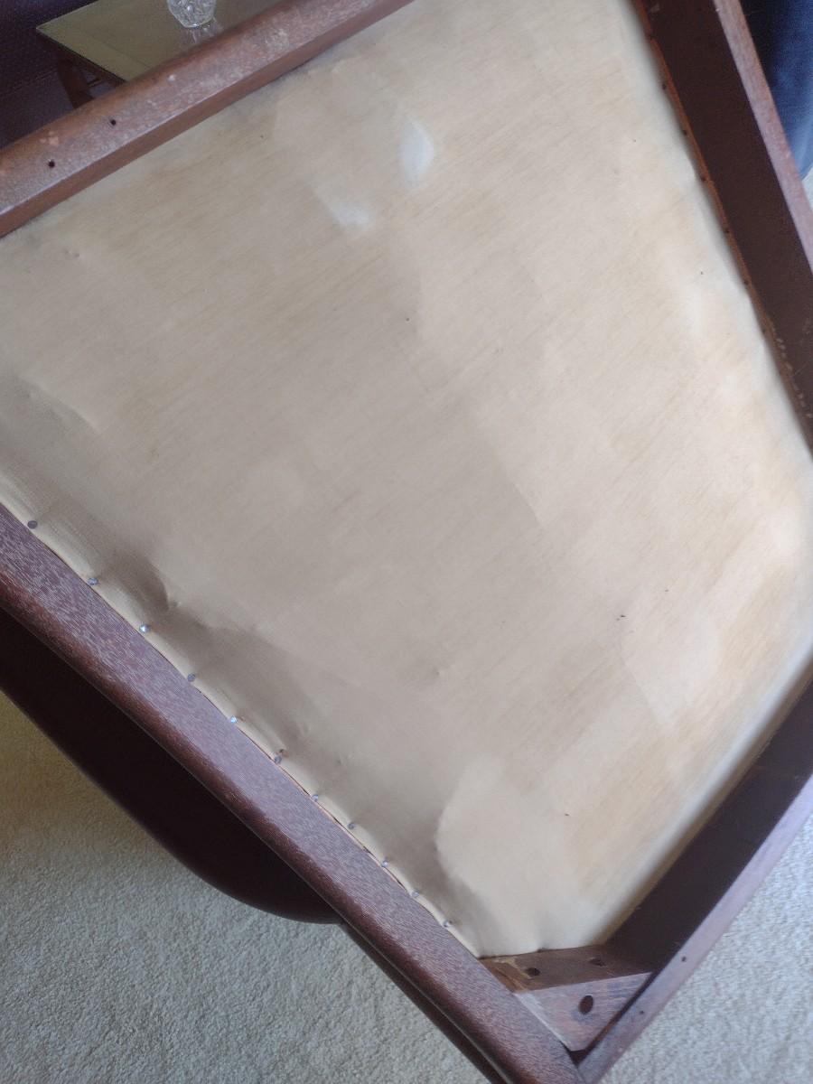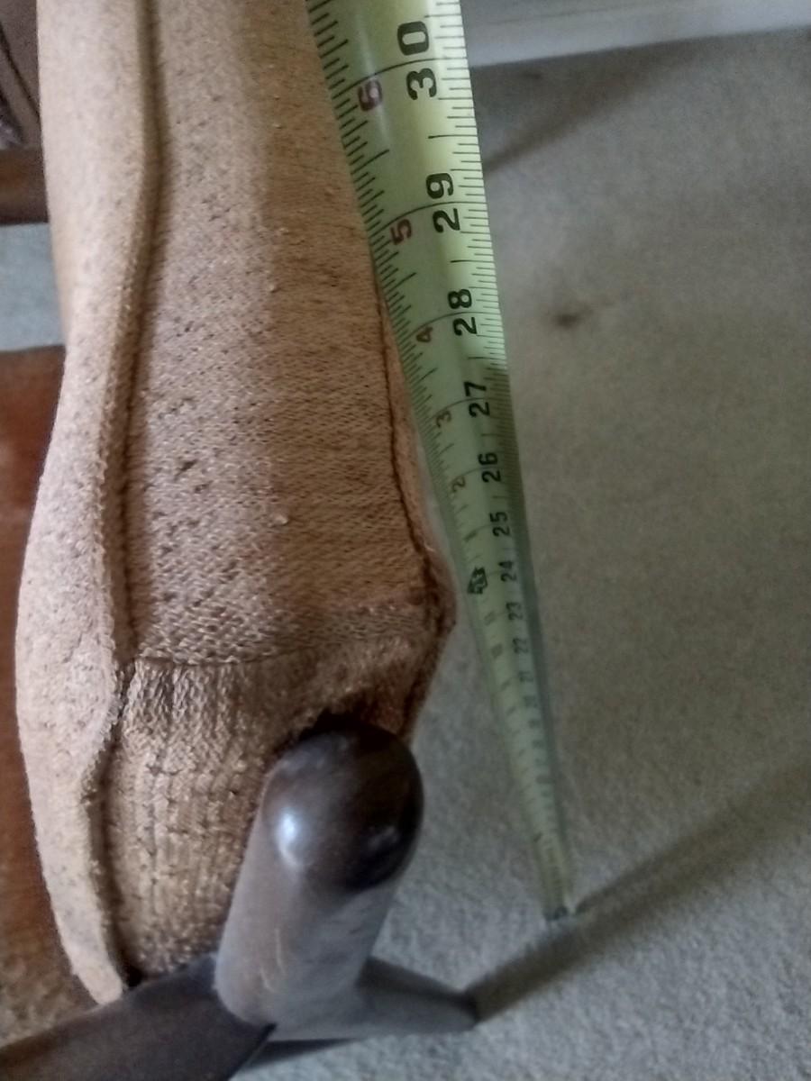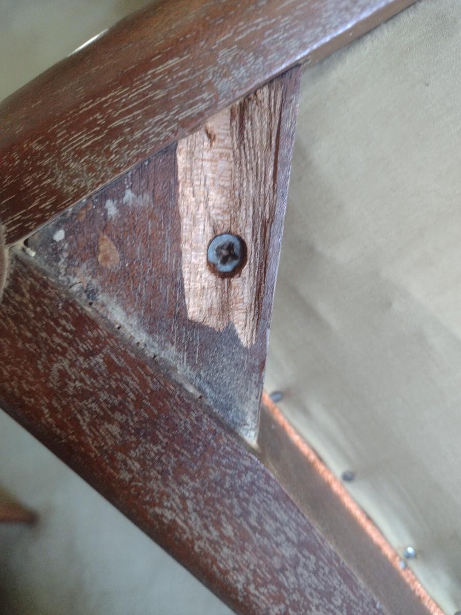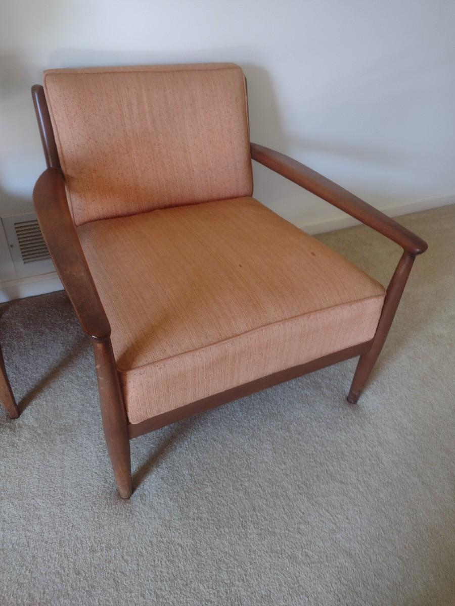 Mid-Century Modern Scandanavian Design Wood Framed Armchair with Upholstered Seat and Back tag is present but obscured by wood stain.