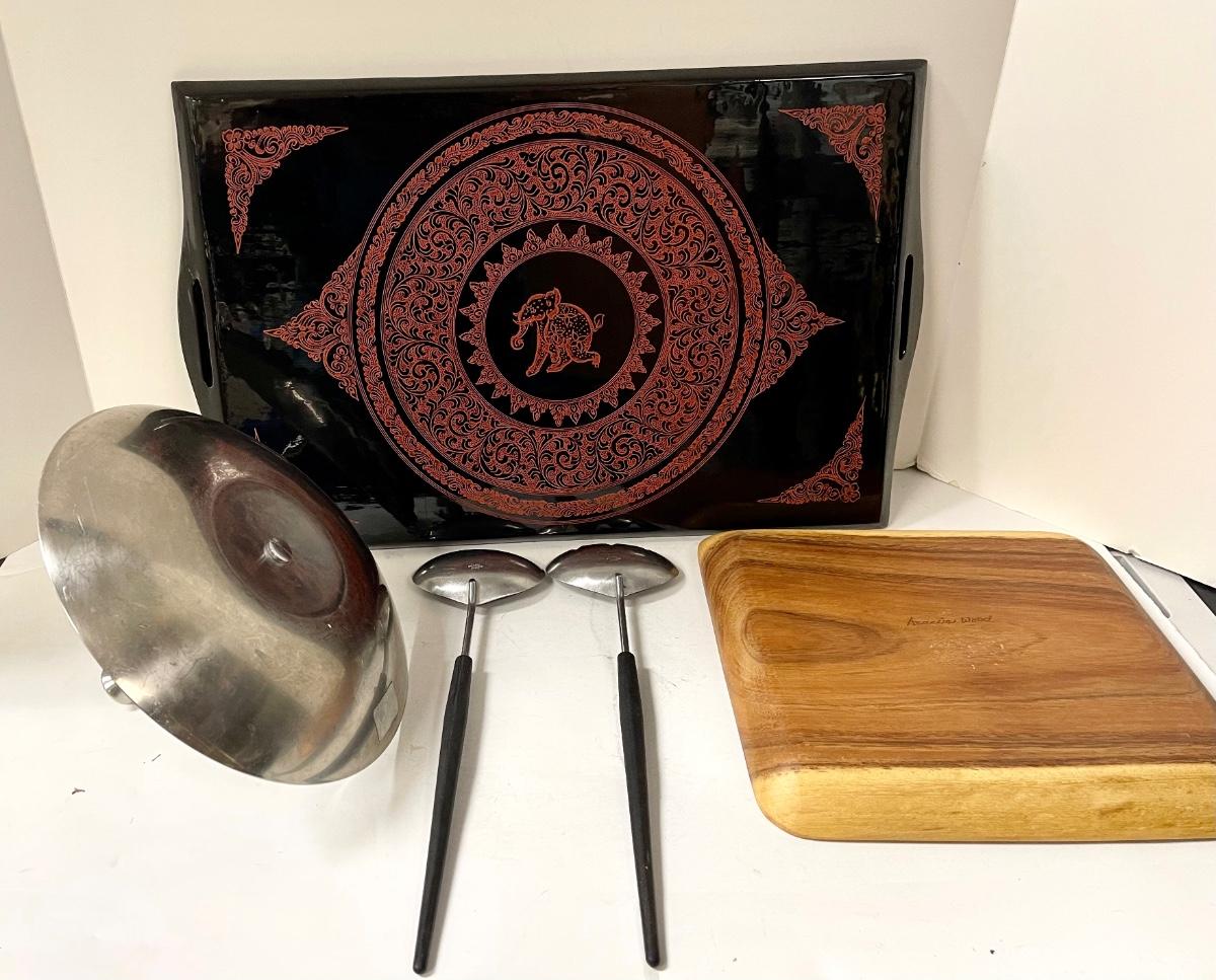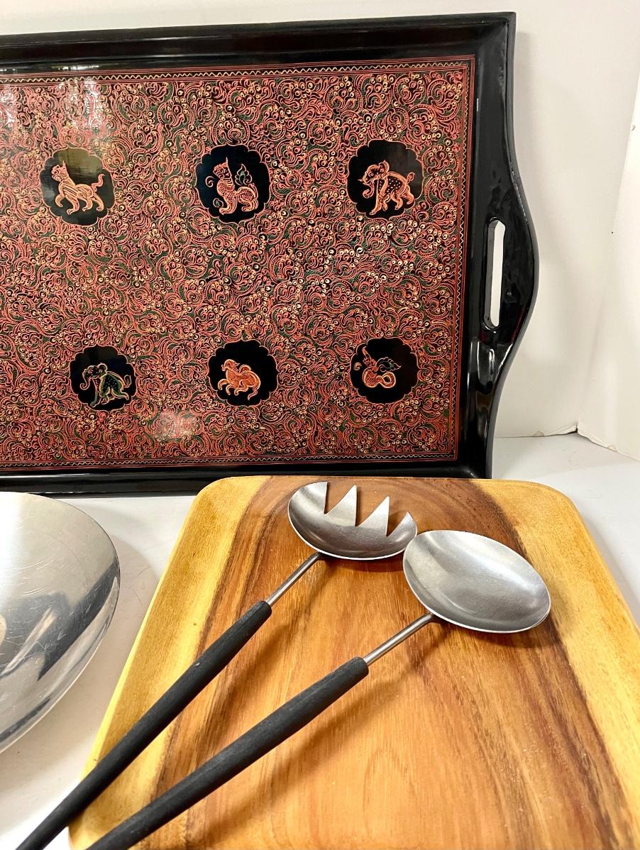 Black. Lacquered Horoscope pattern tray with 2 handles. Square wood tray, round stainless steal bowl with handle, salad utensil salad serving set from Japan. All in good used condition.