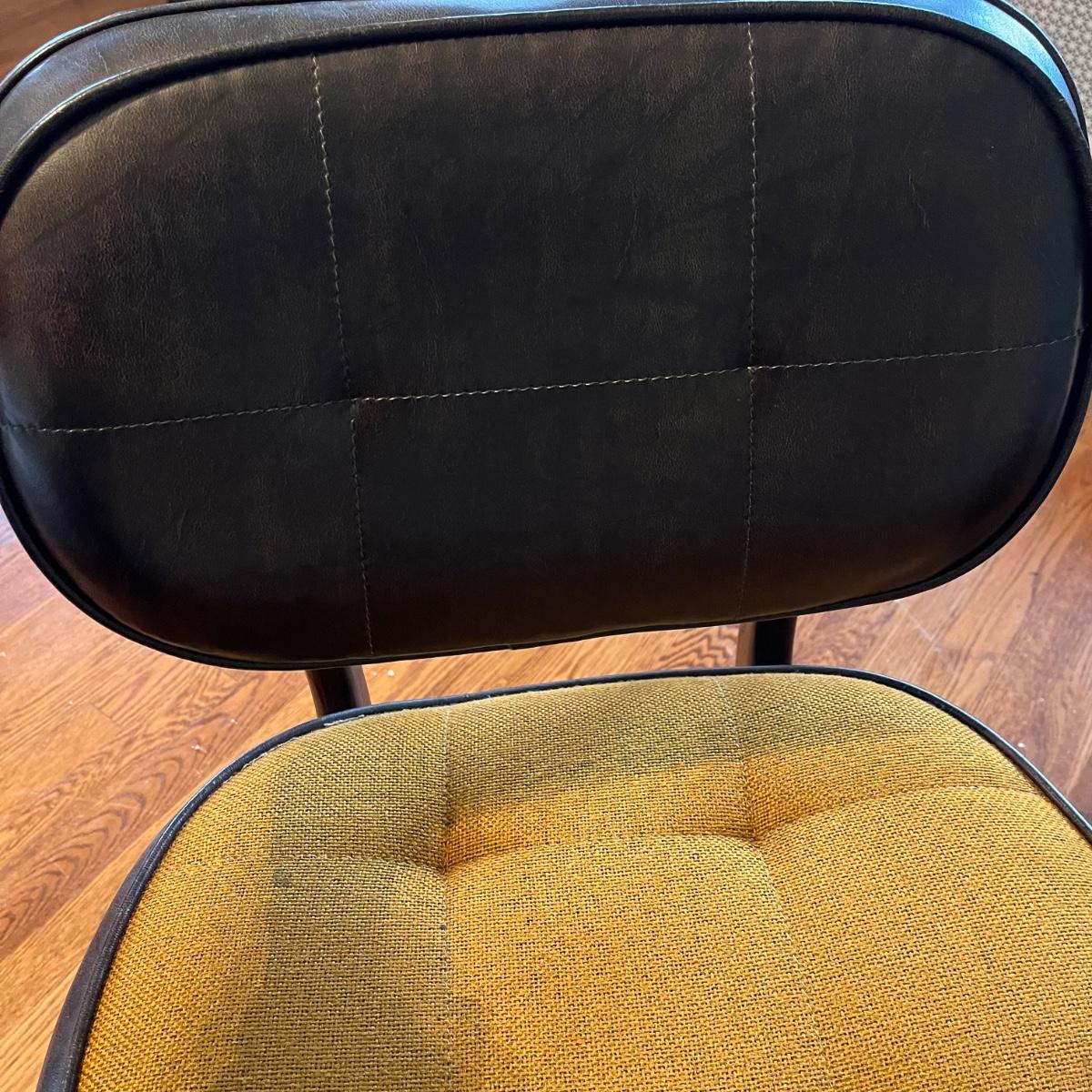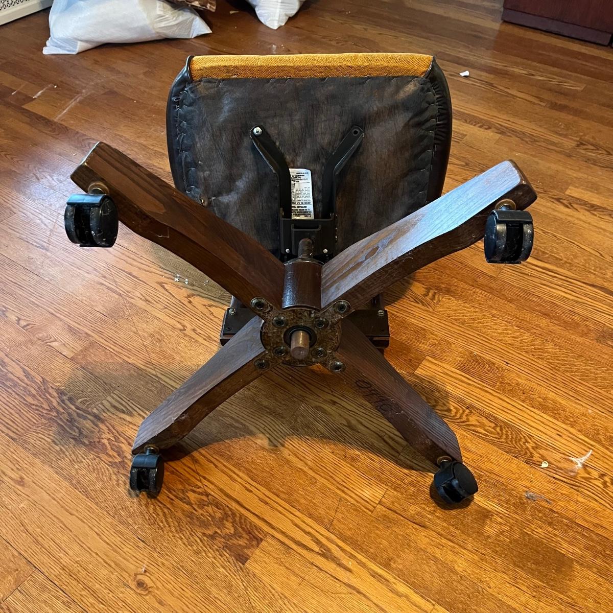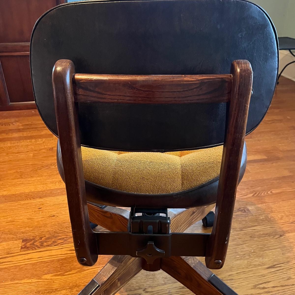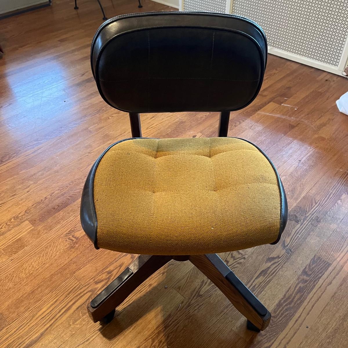 Mid-century modern swivel office chair with a black faux leather back and gold upholstered seat, on a wooden rolling base. Base is 29” x 29”. Chair is 17” x 20” x 32”H. Seat height is 20”.