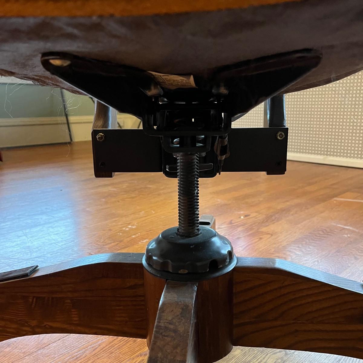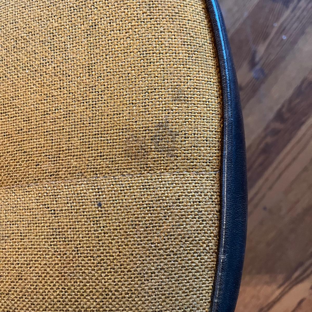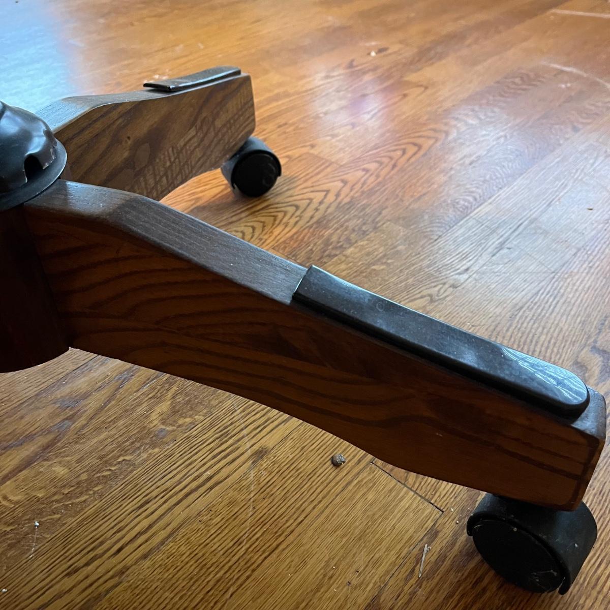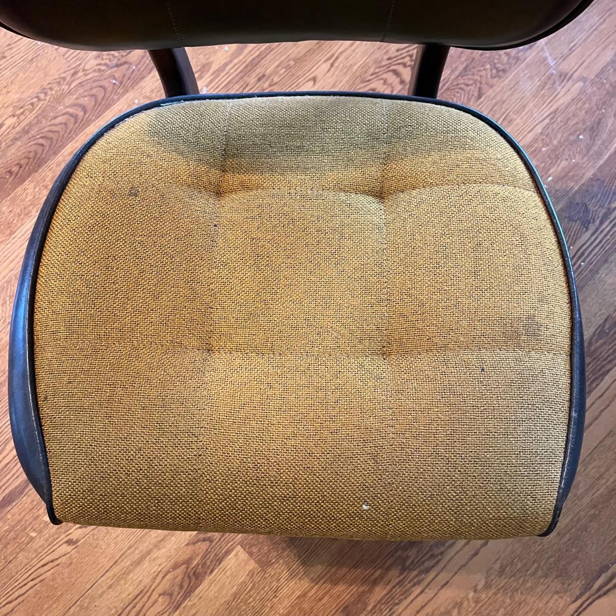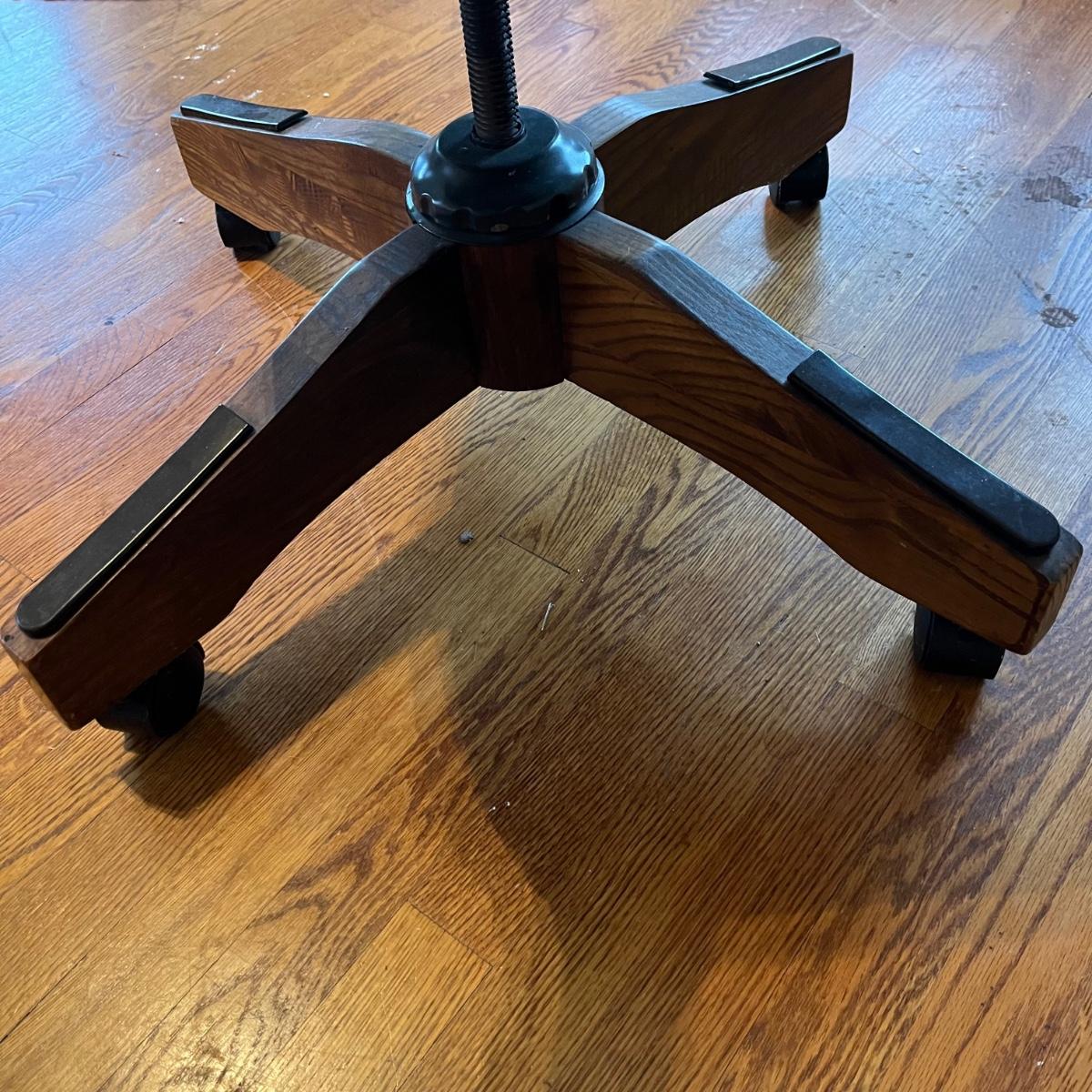 Mid-century modern swivel office chair with a black faux leather back and gold upholstered seat, on a wooden rolling base. Base is 29” x 29”. Chair is 17” x 20” x 32”H. Seat height is 20”.