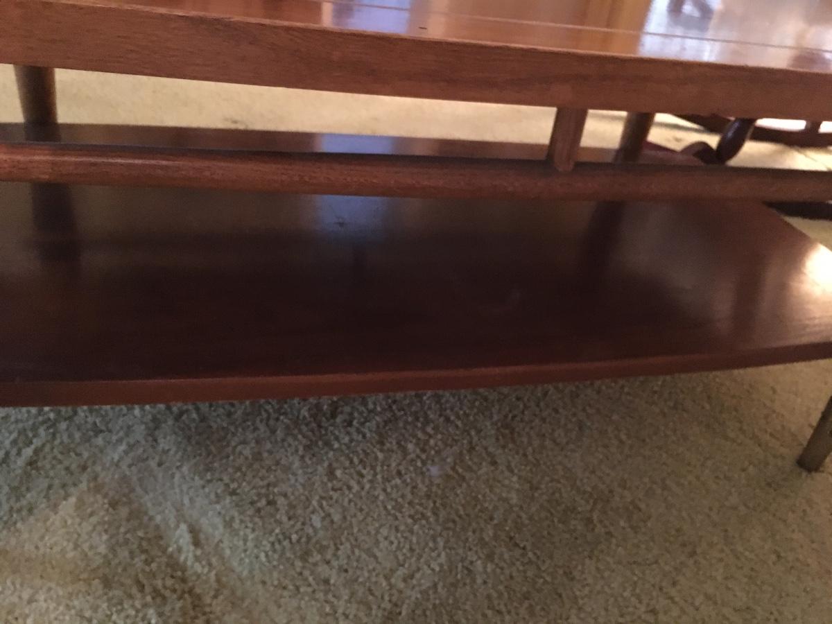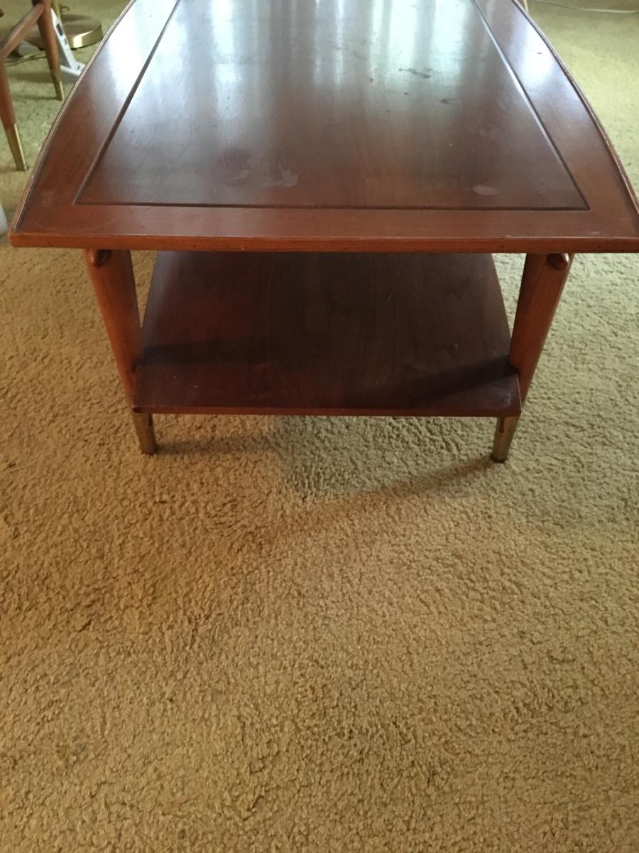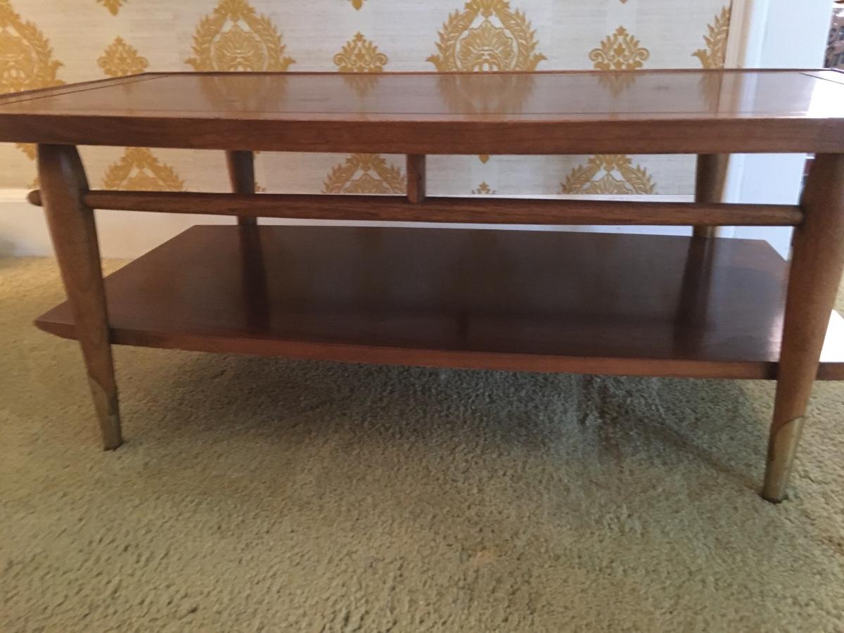 This vintage Lane Furniture coffee table features classic mid-century design, coupling a two-tier construction, tapered legs, added stretchers for support, and a unique wedge style table top. Does have war as shown in photos.