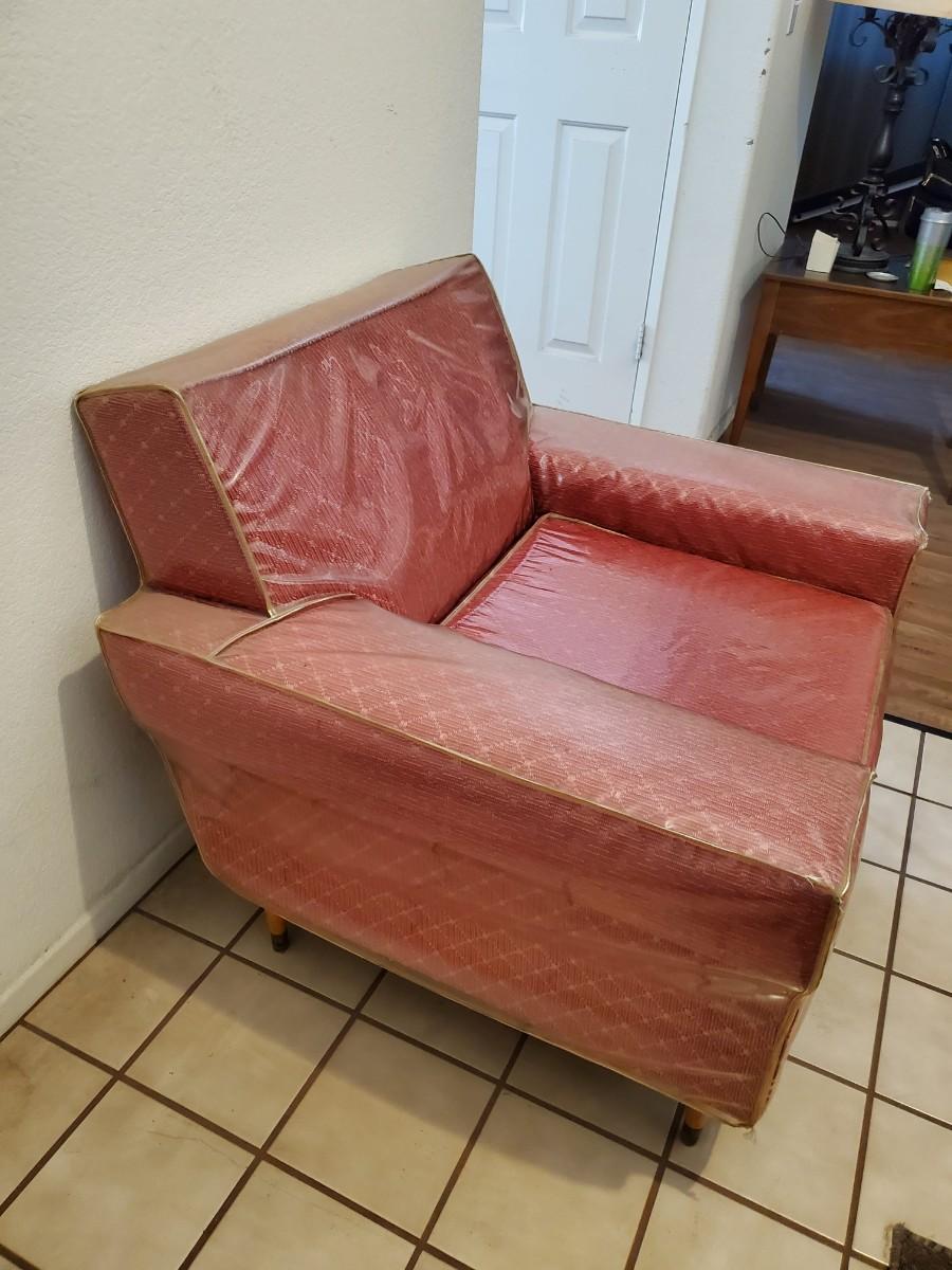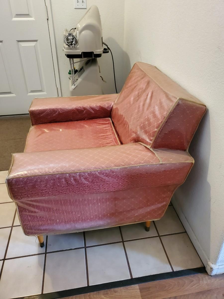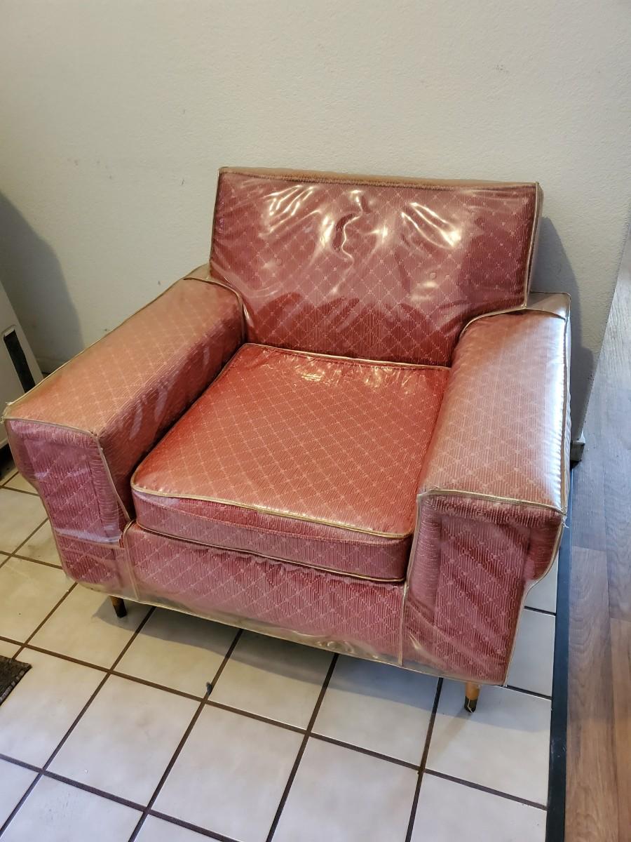 This chair's condition has been preserved with plastic. If you choose to remove the plastic, it will be like opening a gift that was wrapped in the 1960s.