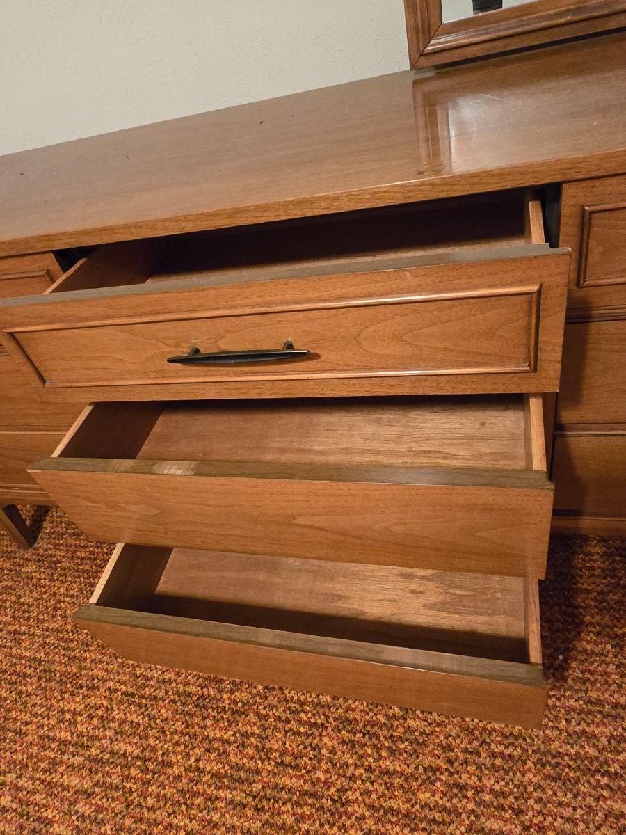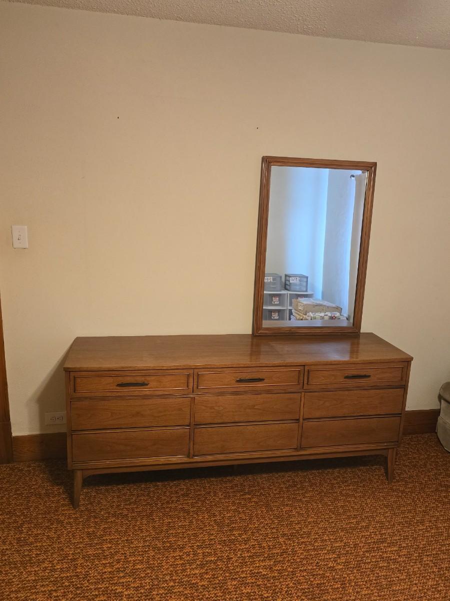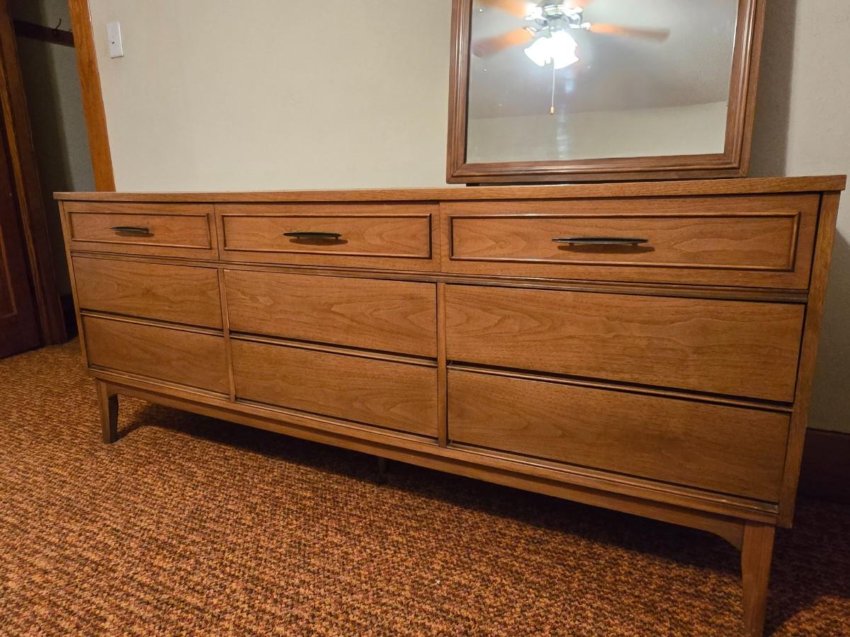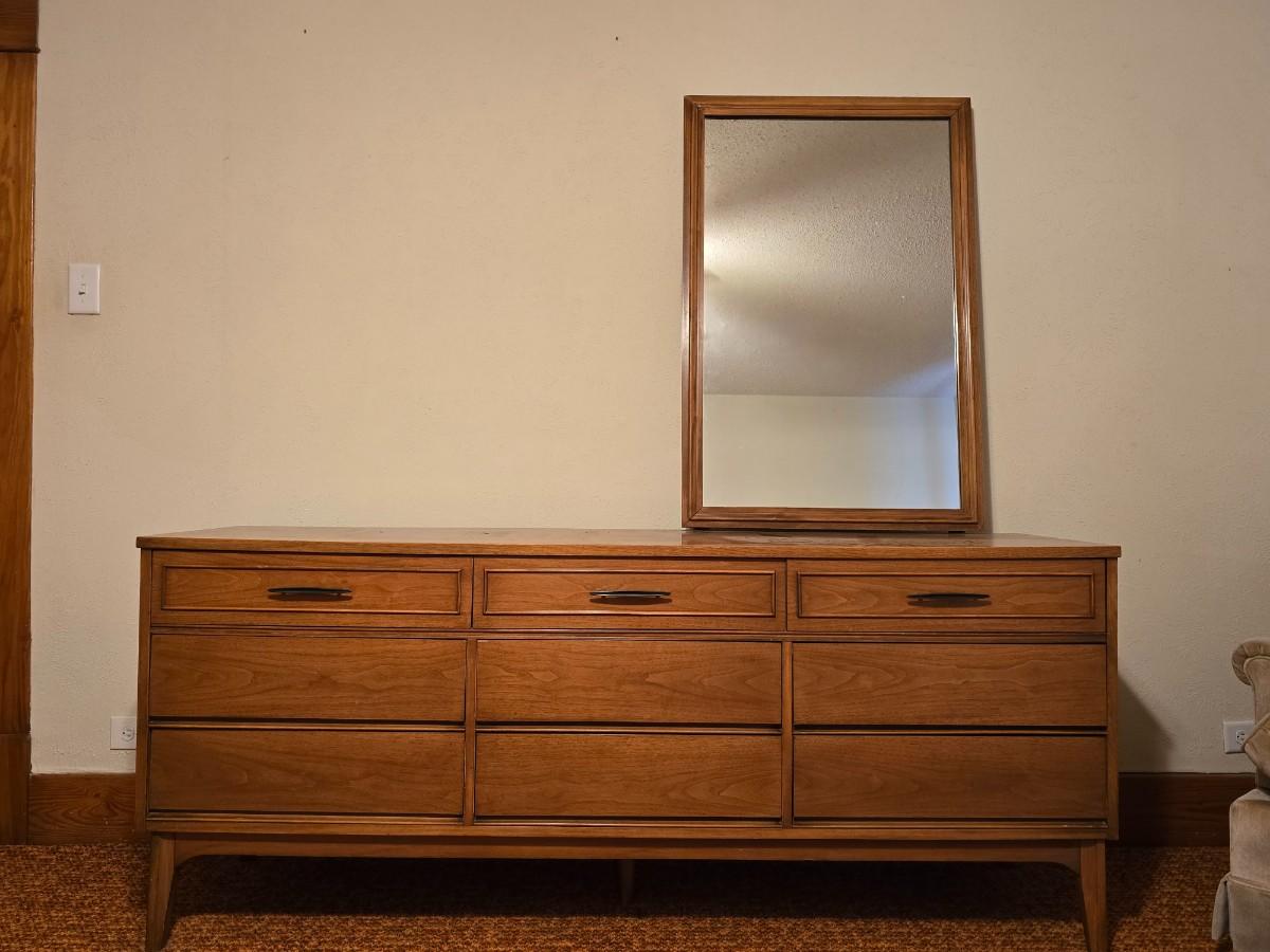 Mid-century modern walnut nine-drawer lowboy dresser by Dixie Furniture Co. with a matching mirror.