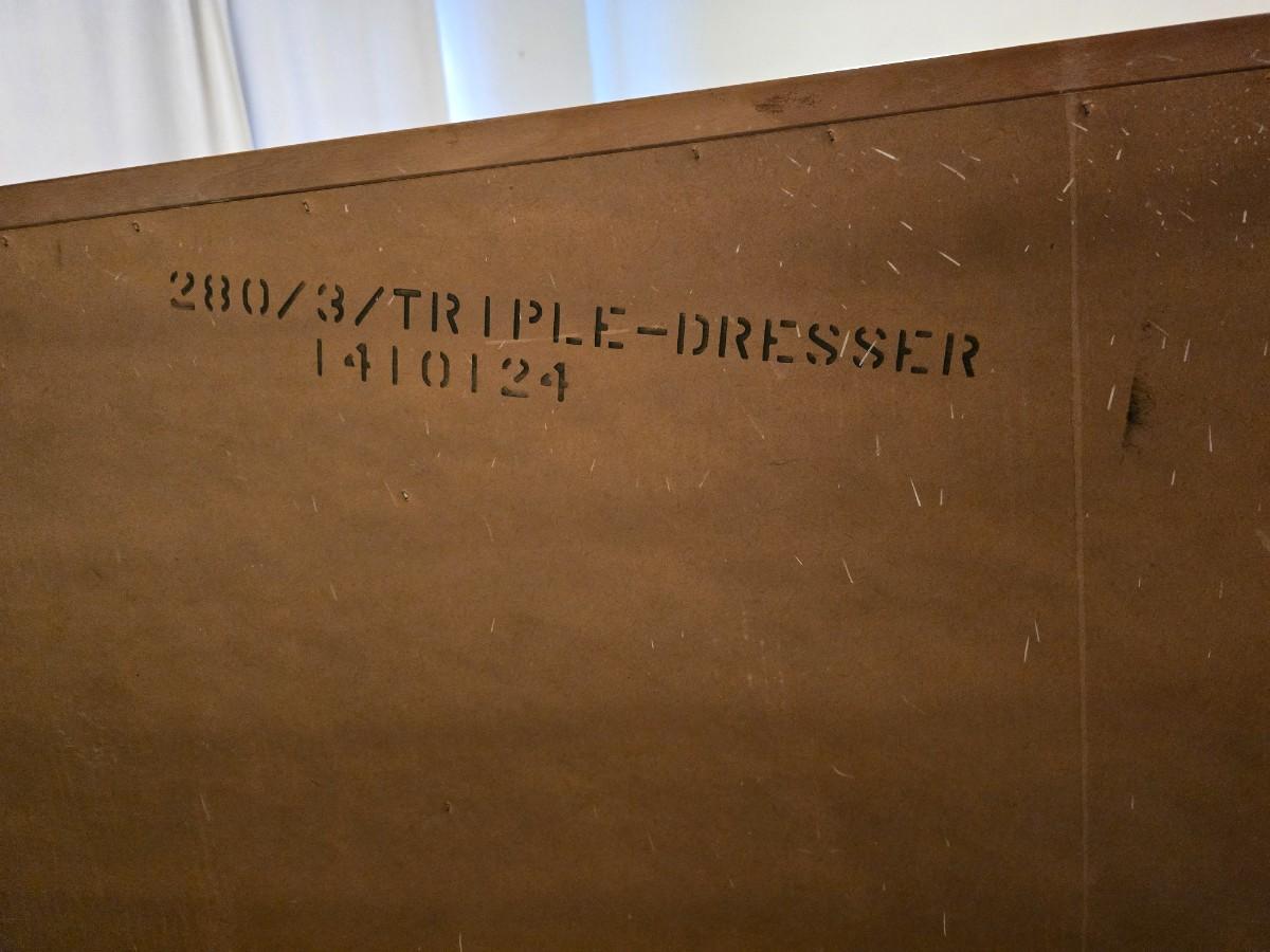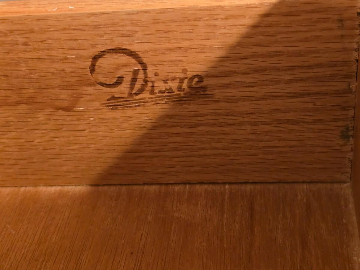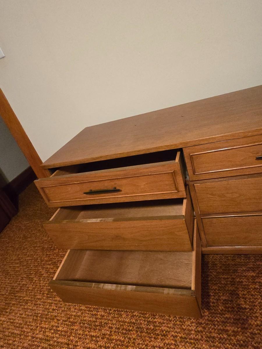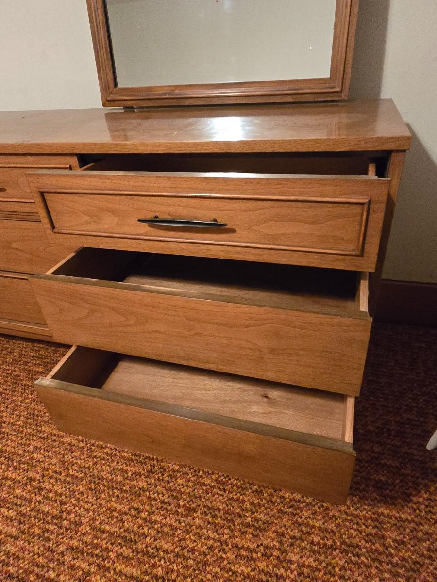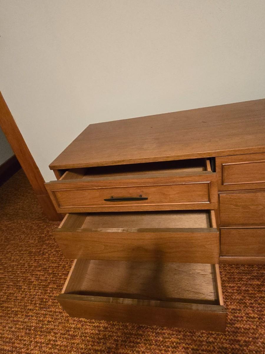 Mid-century modern walnut nine-drawer lowboy dresser by Dixie Furniture Co. with a matching mirror.