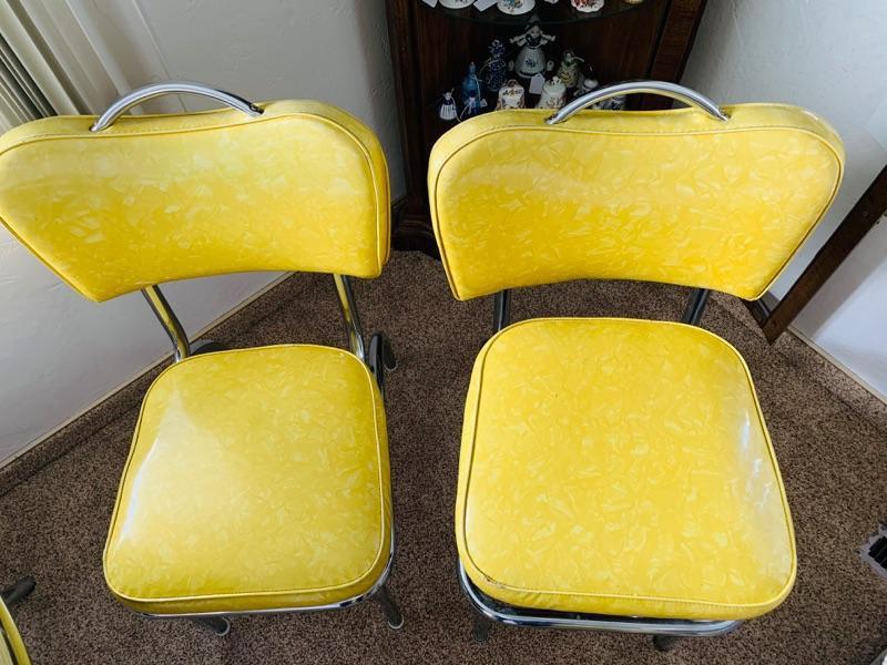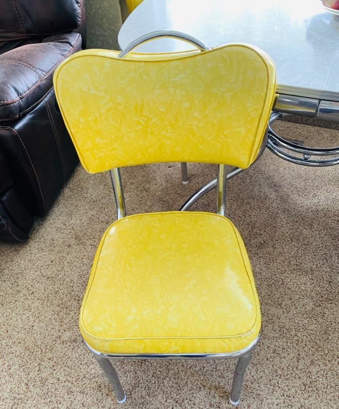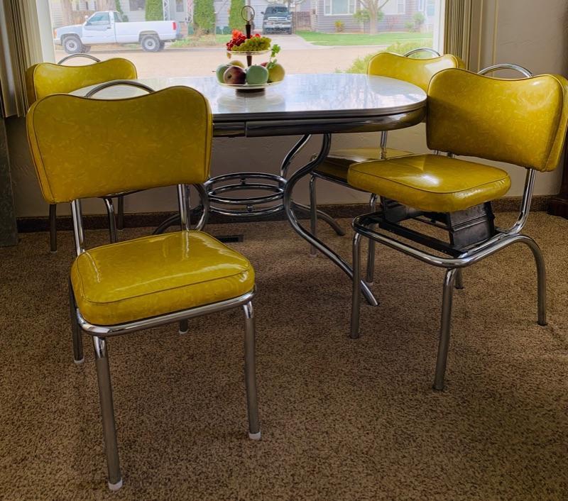 Extremely rare and in truly amazing condition for its age. Comes with 4 chairs (one of the chairs is a "built-in' highchair; it also comes with one leaf). Floral arrangement on top of table is not included.