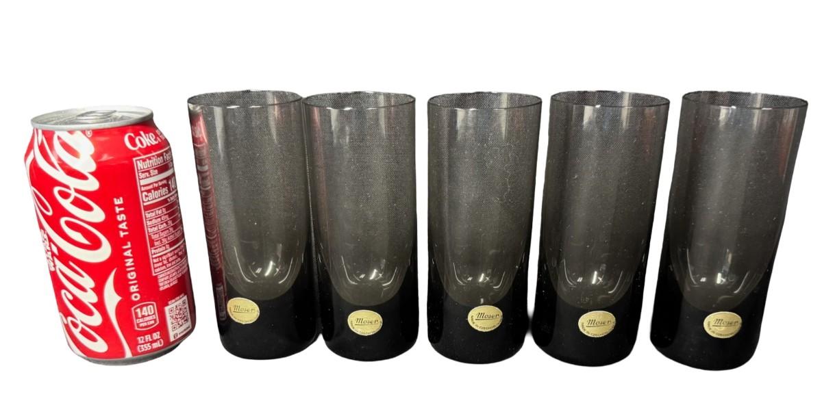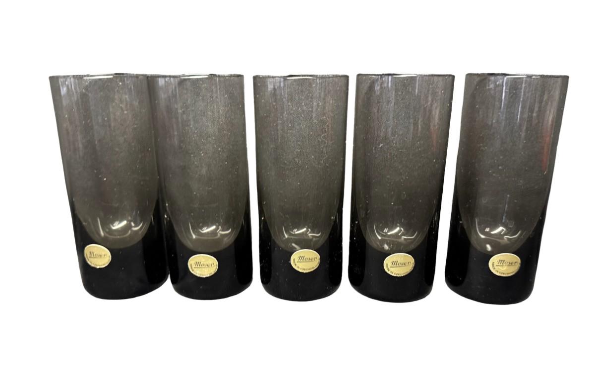 Total of five smoke colored glasses. Made in Czechoslovakia. No obvious chips or cracks. Measurement: 5 1/8”H (each). Pre-auction estimate: $200-$300. [RE]