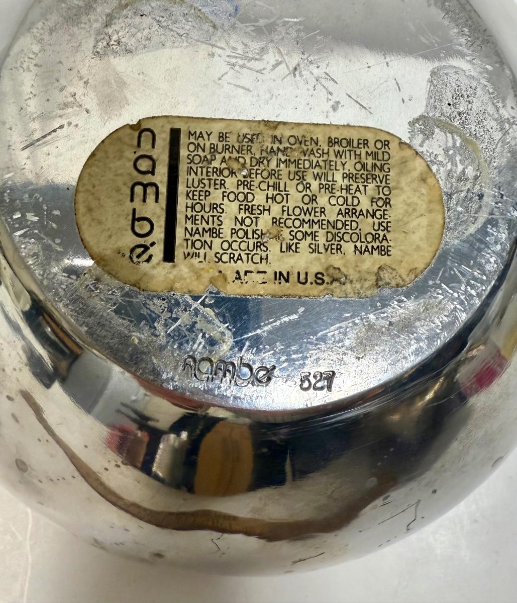 Marked “ Nambe 275” on the base, Solid, trim-corner scalloped bowl. Made of Nambé Alloy. 1.5 Qt., 9"D x 4.25" H. Polished finish.