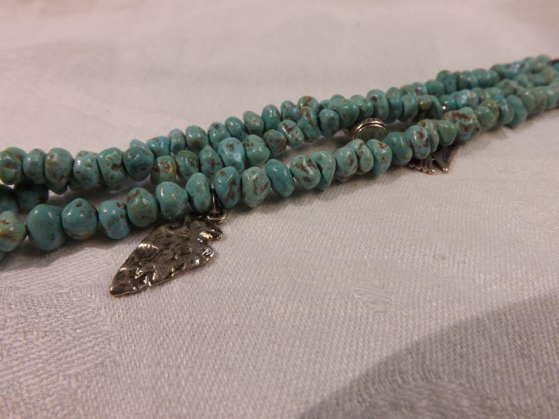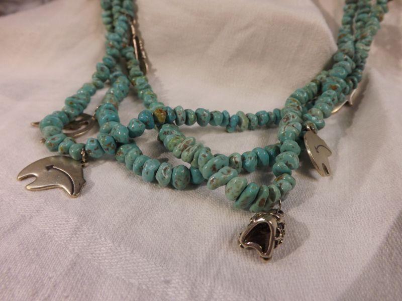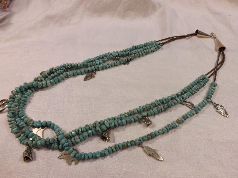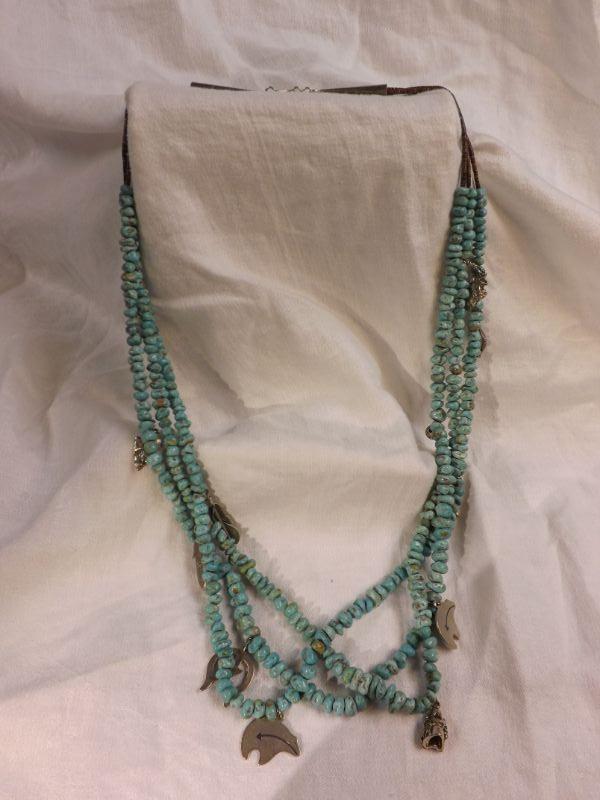 Mid-Century Native American necklace, multi-strand fetish necklace made with turquoise stones, sterling silver clasps and fetish charms. Weighs over 111 grams. 28" long **Please read Terms and Conditions before placing a bid. Pick up is Wednesday, September 25 from 4pm to 7pm and Saturday, September 28 from 9am to 1pm in Williamstown, NJ. All sales are final. All sales are as is, where is. Please review all photos. Any props included in photos are not included in listing. All measurements are approximate.