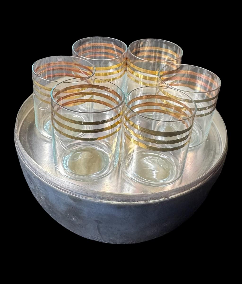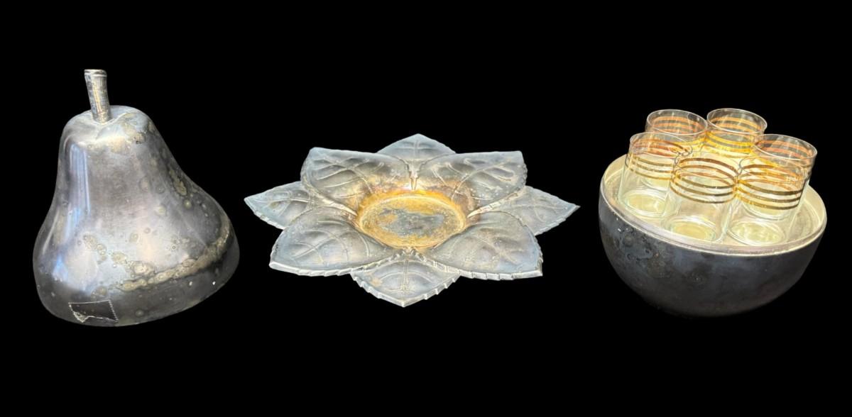 This is a metal pear mini bar with leaf tray and shot glasses. Measurement: 6”H. Pre-auction estimate: $75-$125. [RE]