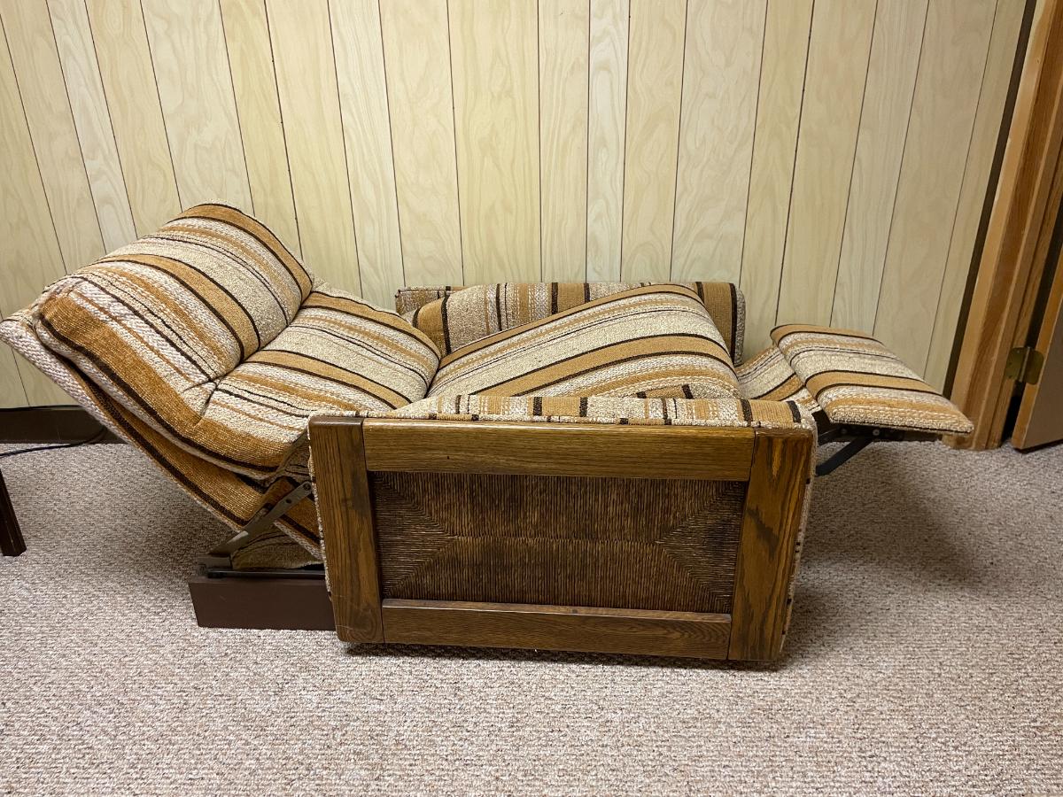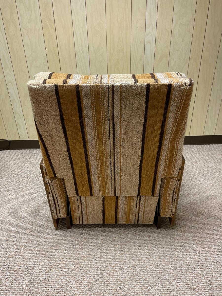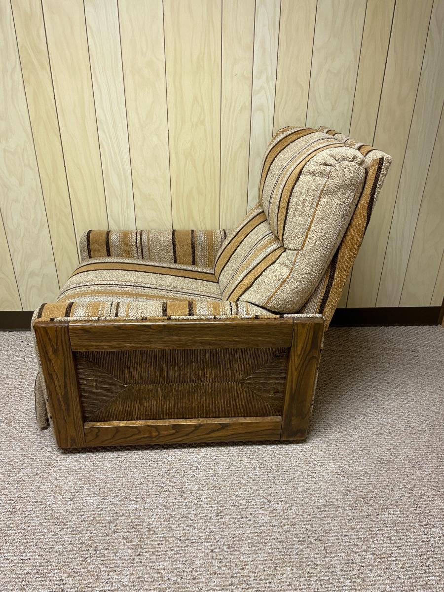 Adjustable recliner featuring a sturdy wooden frame and textured striped fabric upholstery in earth-toned hues. Includes a reclining mechanism for enhanced comfort. Dimensions: 3'7" wide, 27" seat depth, and 42" overall height. The chair is in good condition with wear consistent with use.