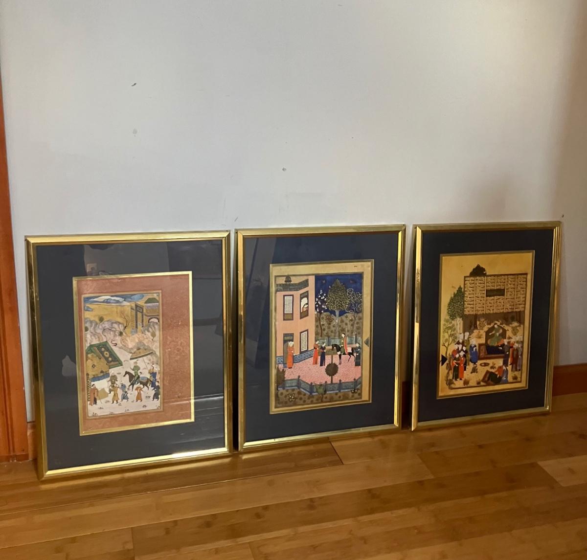 Mid-Century Set of 3 Framed Mughal-Style Indian Miniature Paintings on Rice Paper - 17x21" Framed