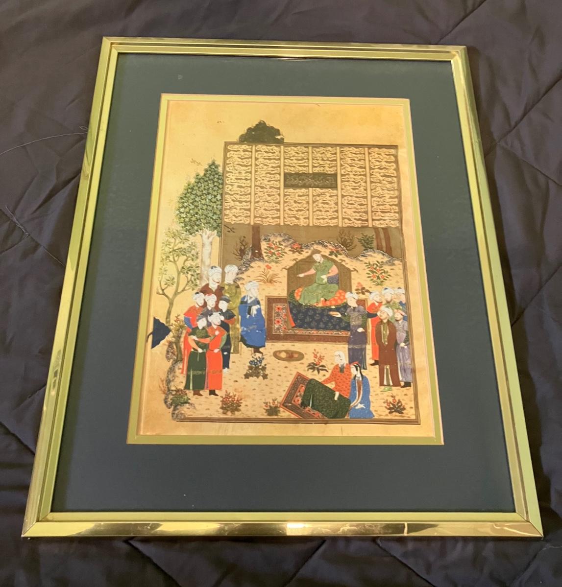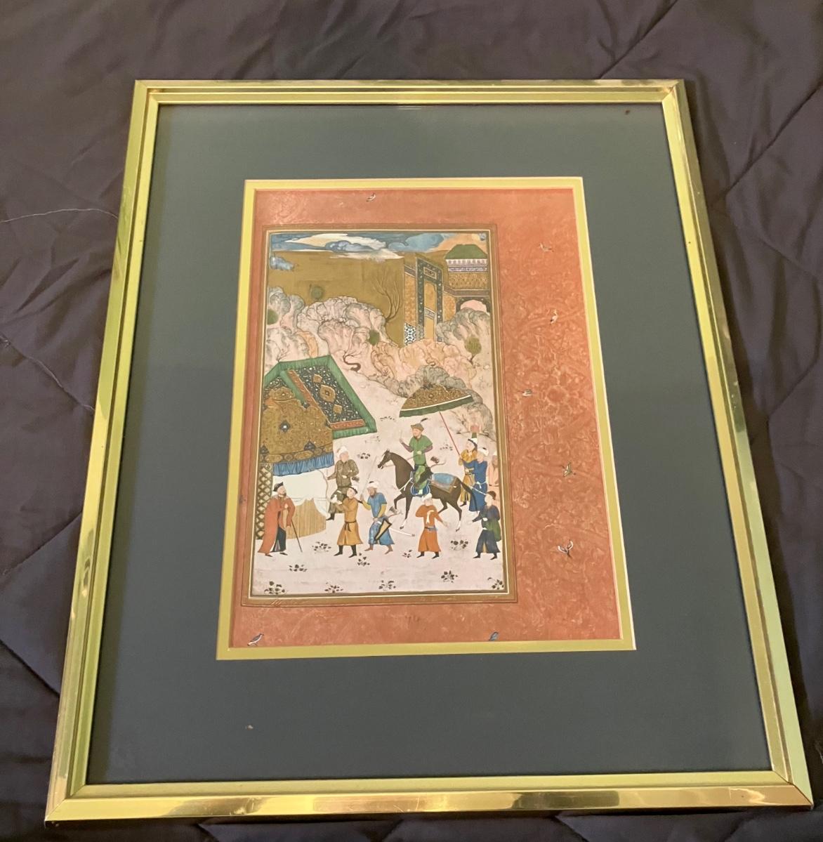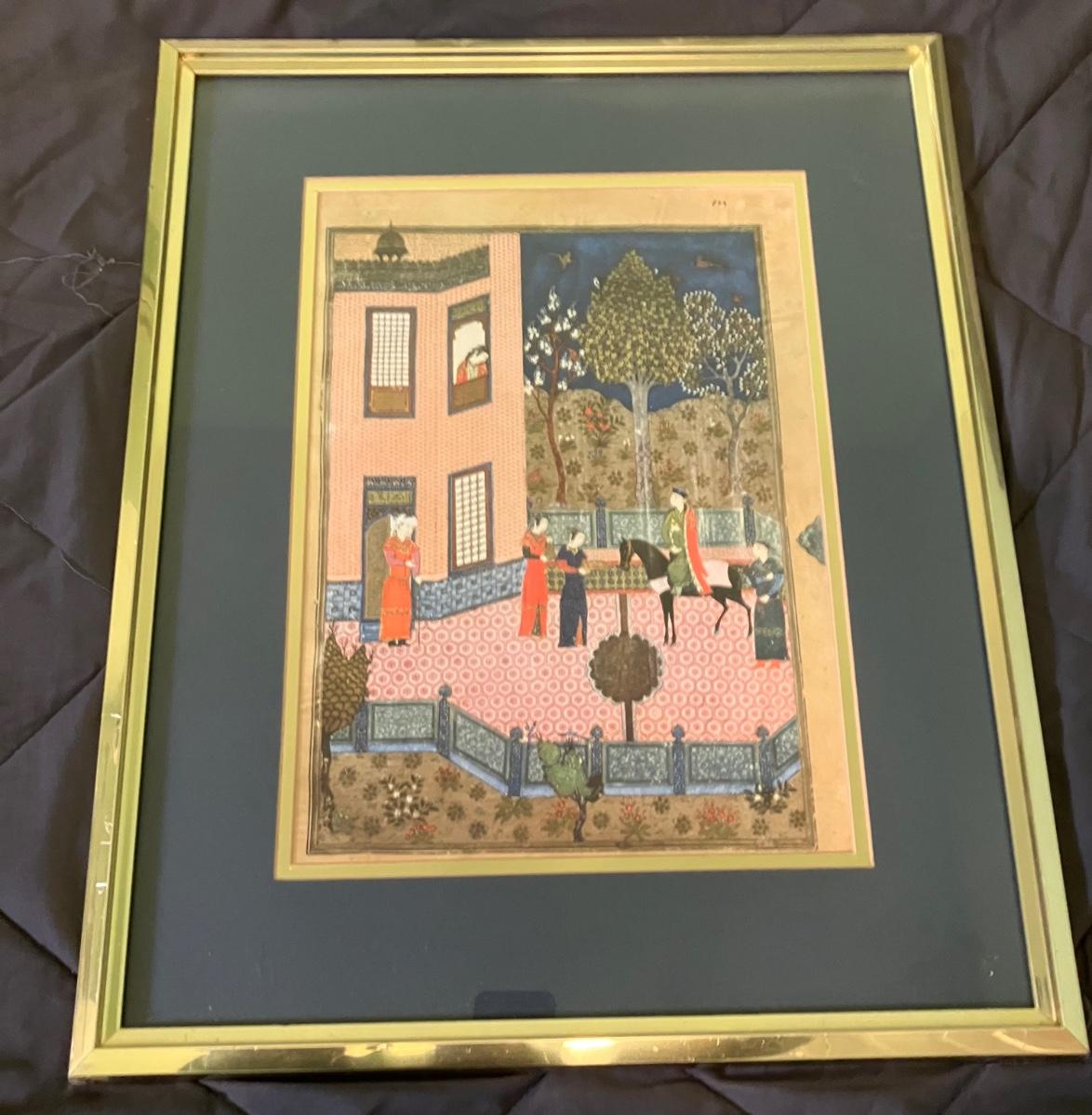Elevate your space with this enchanting trio of vintage framed miniature paintings, handcrafted in the timeless Mughal style from mid-20th century India. Rendered in vibrant gouache on delicate rice paper, these reproductions capture the opulent essence of 16th-18th century royal court life—think processions of elegant figures on horseback, lively courtyard gatherings under arched pavilions, and intimate storytelling scenes with richly robed attendants. Each piece bursts with intricate details: gold-leaf accents, floral borders, and harmonious jewel tones of crimson, sapphire, emerald, and saffron against soft terracotta grounds.