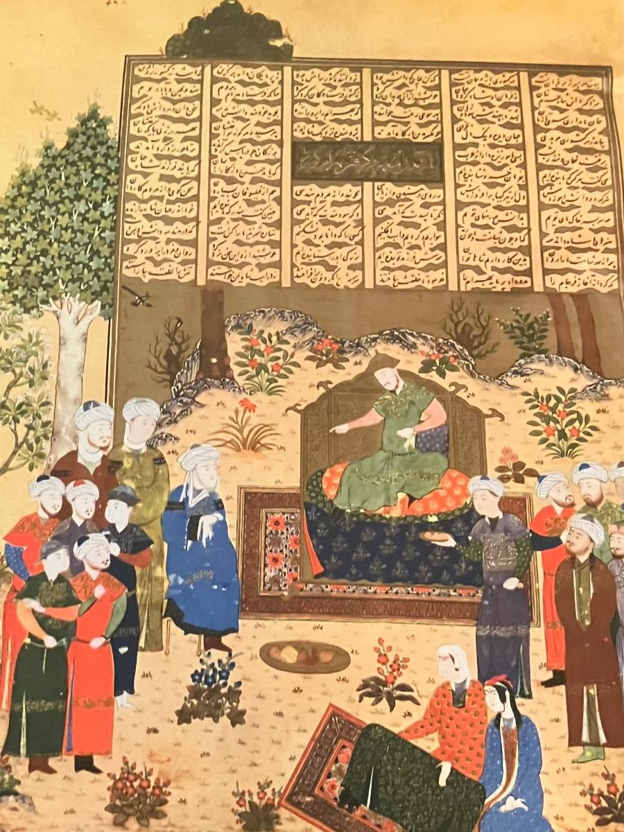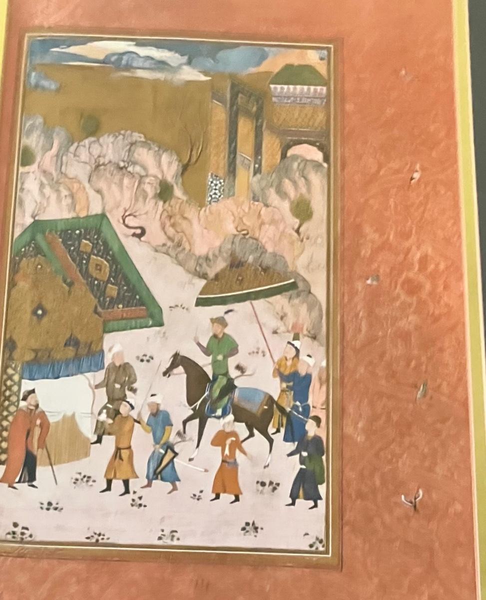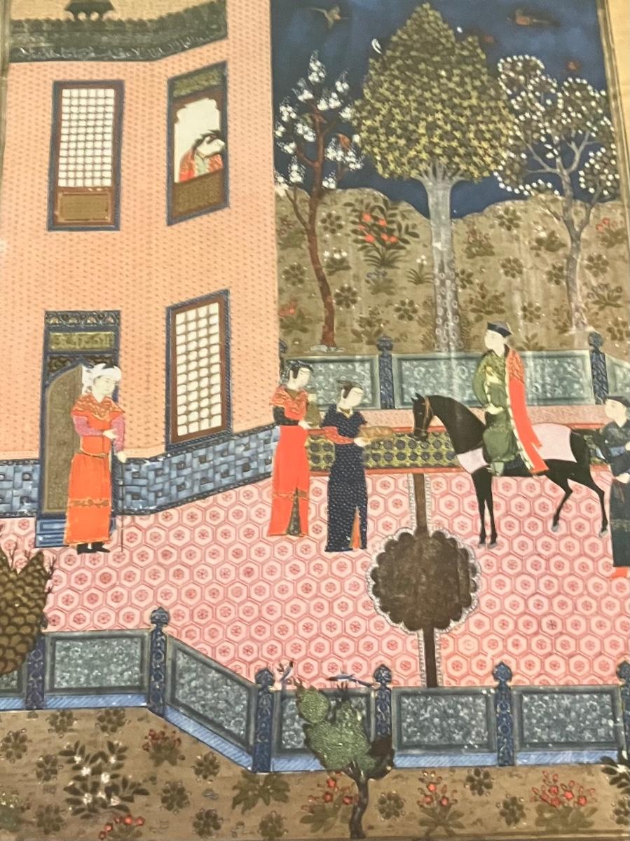 Elevate your space with this enchanting trio of vintage framed miniature paintings, handcrafted in the timeless Mughal style from mid-20th century India. Rendered in vibrant gouache on delicate rice paper, these reproductions capture the opulent essence of 16th-18th century royal court life—think processions of elegant figures on horseback, lively courtyard gatherings under arched pavilions, and intimate storytelling scenes with richly robed attendants. Each piece bursts with intricate details: gold-leaf accents, floral borders, and harmonious jewel tones of crimson, sapphire, emerald, and saffron against soft terracotta grounds.