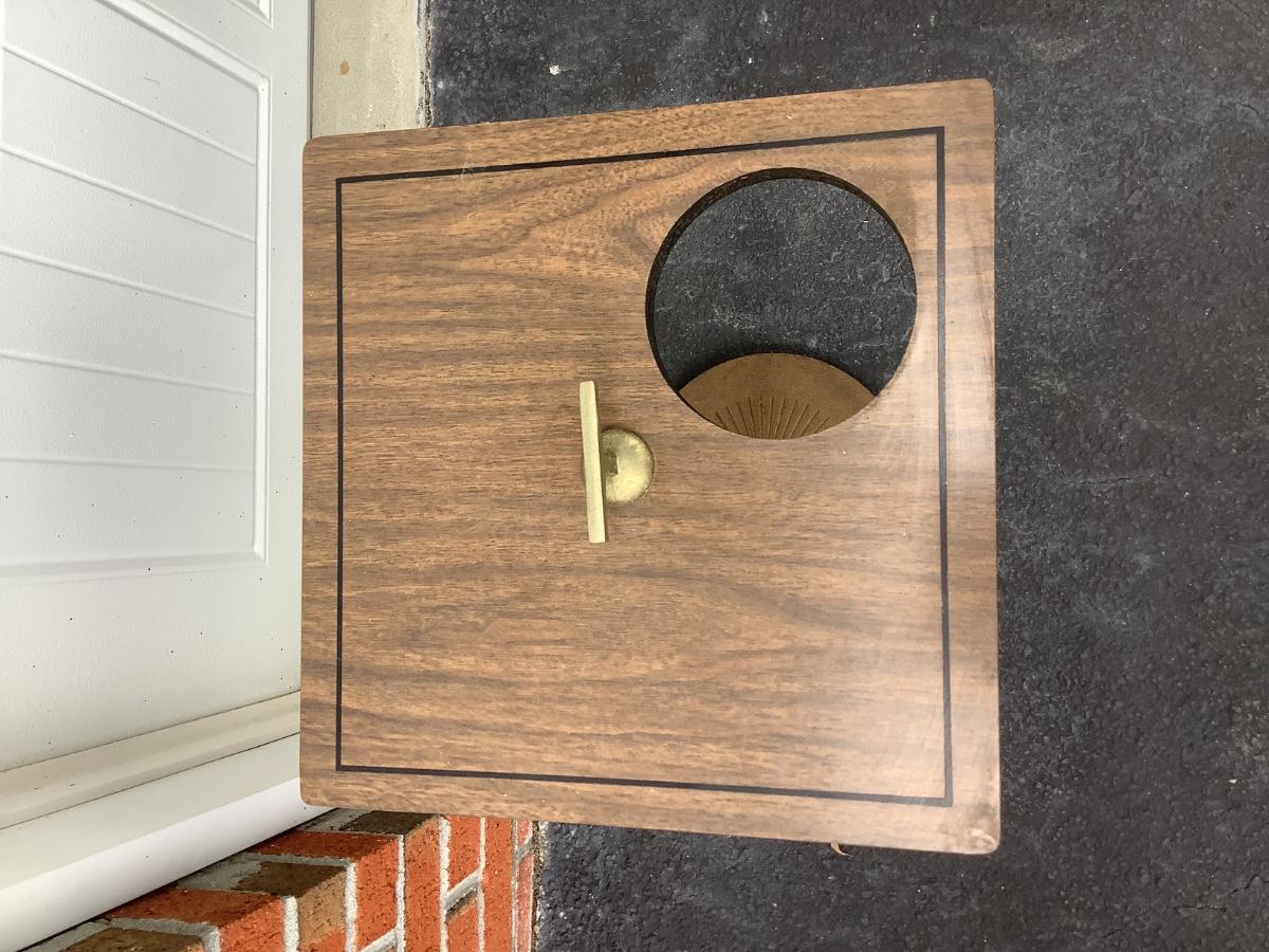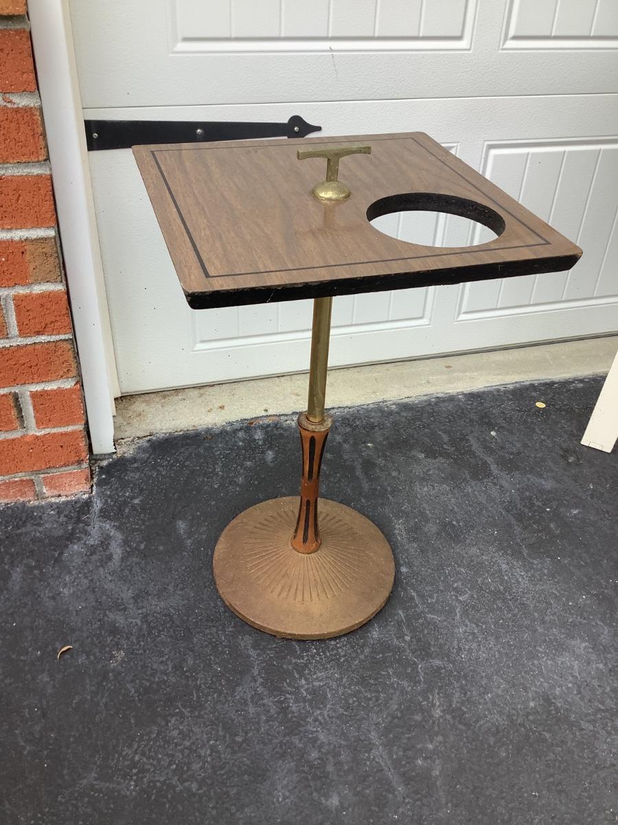 MId-century side table with ashtray opening, metal base, wooden part of the leg, vinyl covered top 21"H 15"x15"