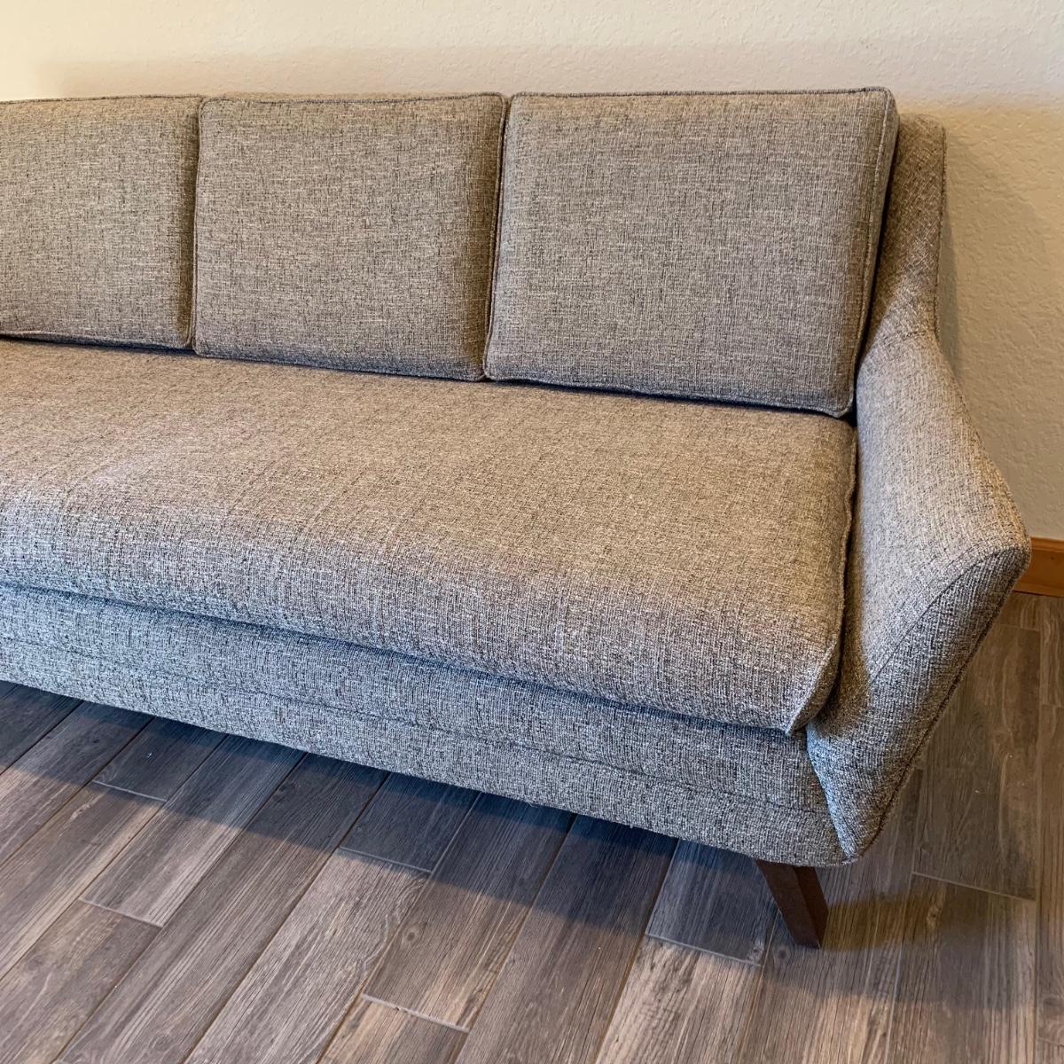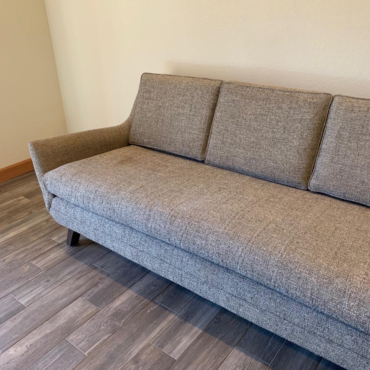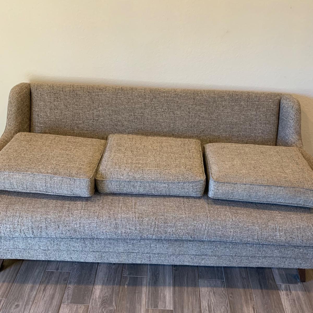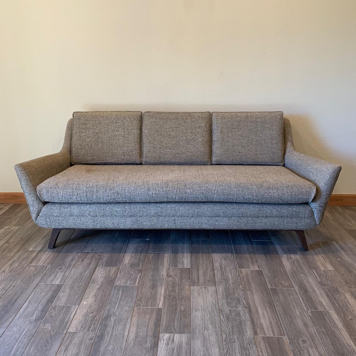 Mid-century style sofa with winged armrests that sits atop wooden feet. Sofa is a light gray color in a tweed like fabric. At its widest point the sofa measures 85” x 37” x 33”. There is some discoloration on one part of the seat and the wood feet have some slight mildew that is easily cleanable. Otherwise this sofa appears to be in good condition, although it could use some cleaning. All cushion covers are removable.