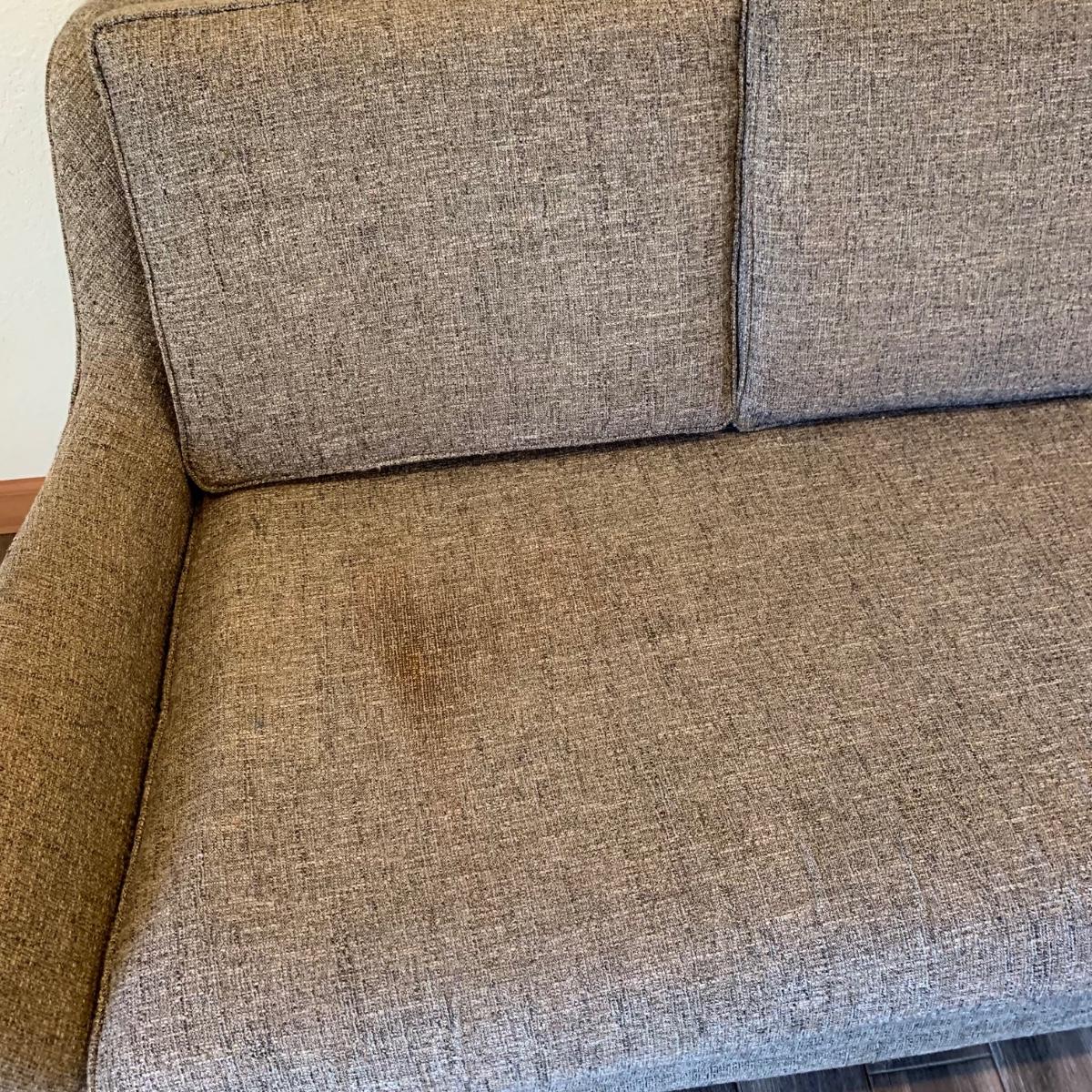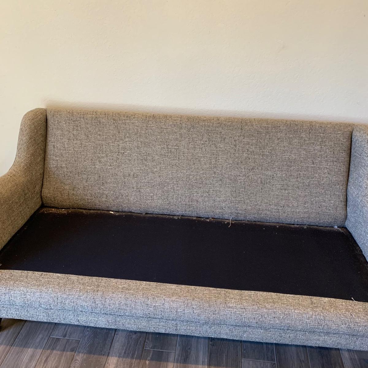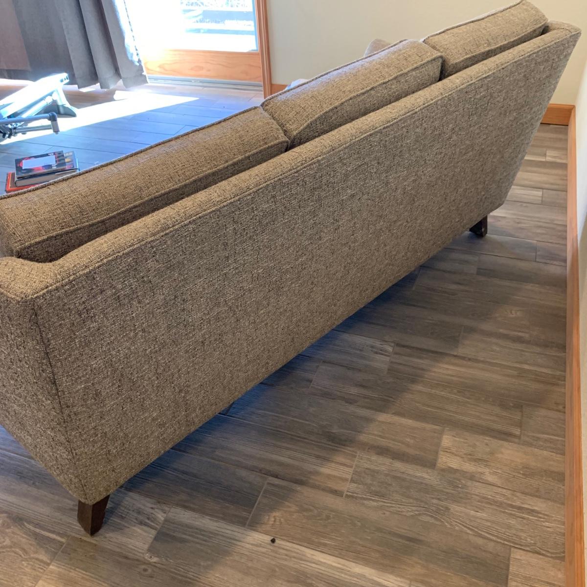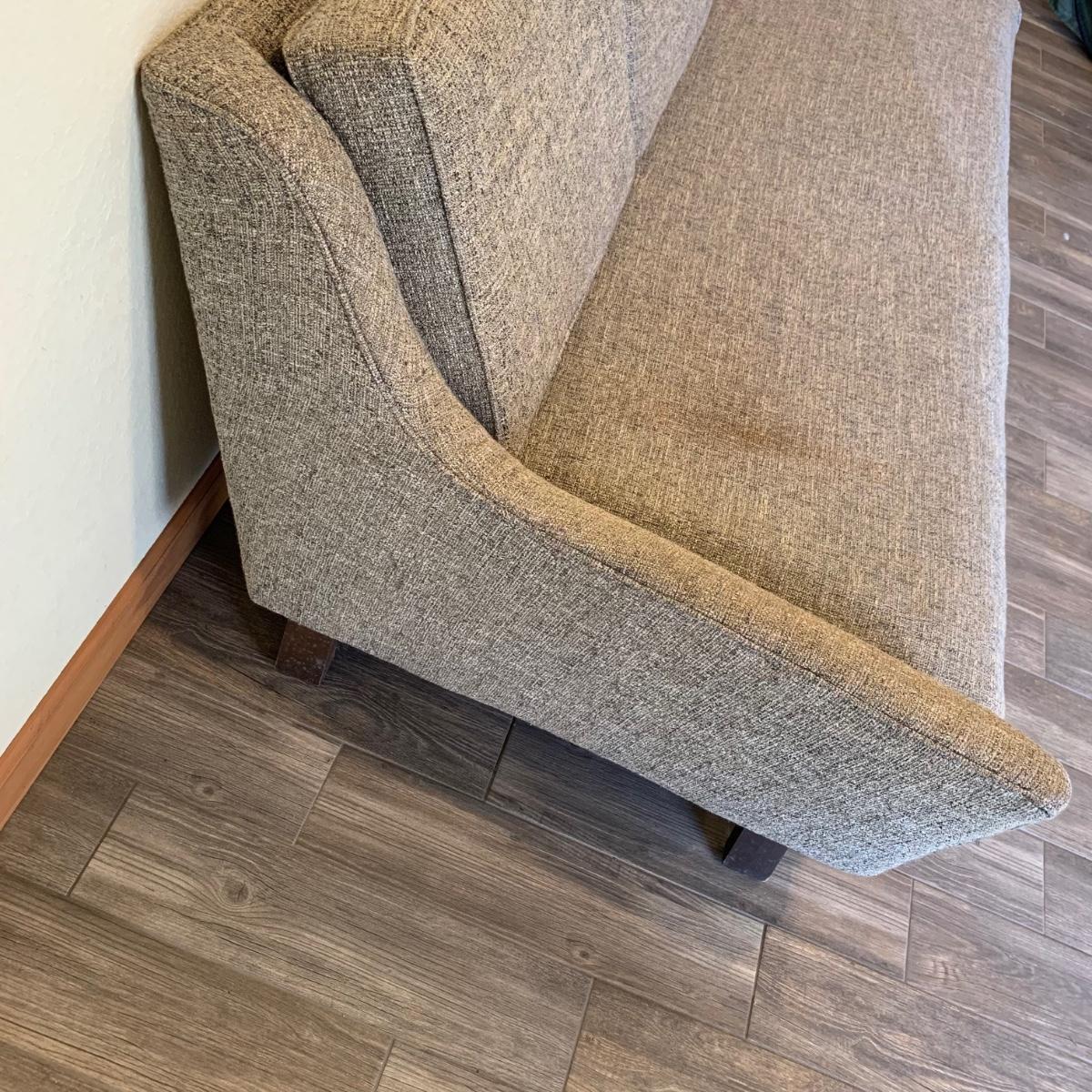 Mid-century style sofa with winged armrests that sits atop wooden feet. Sofa is a light gray color in a tweed like fabric. At its widest point the sofa measures 85” x 37” x 33”. There is some discoloration on one part of the seat and the wood feet have some slight mildew that is easily cleanable. Otherwise this sofa appears to be in good condition, although it could use some cleaning. All cushion covers are removable.
