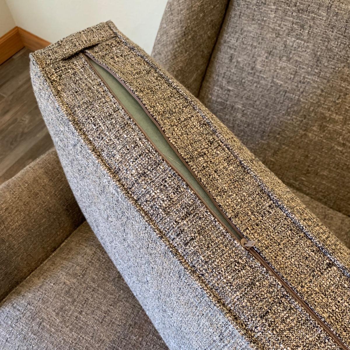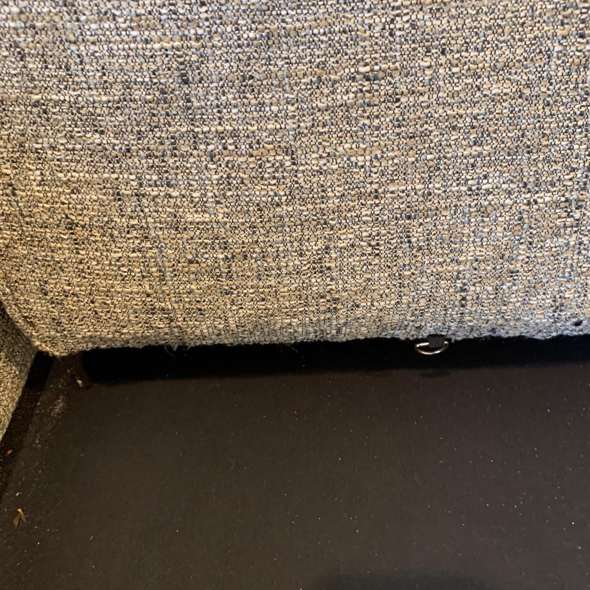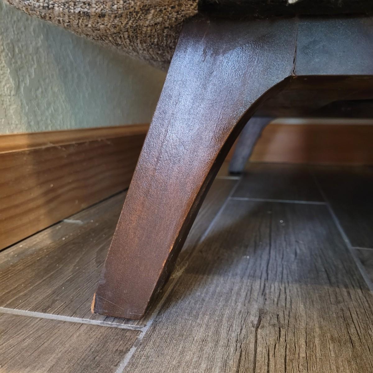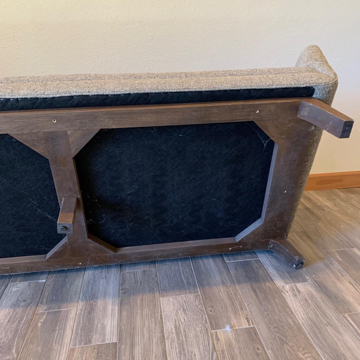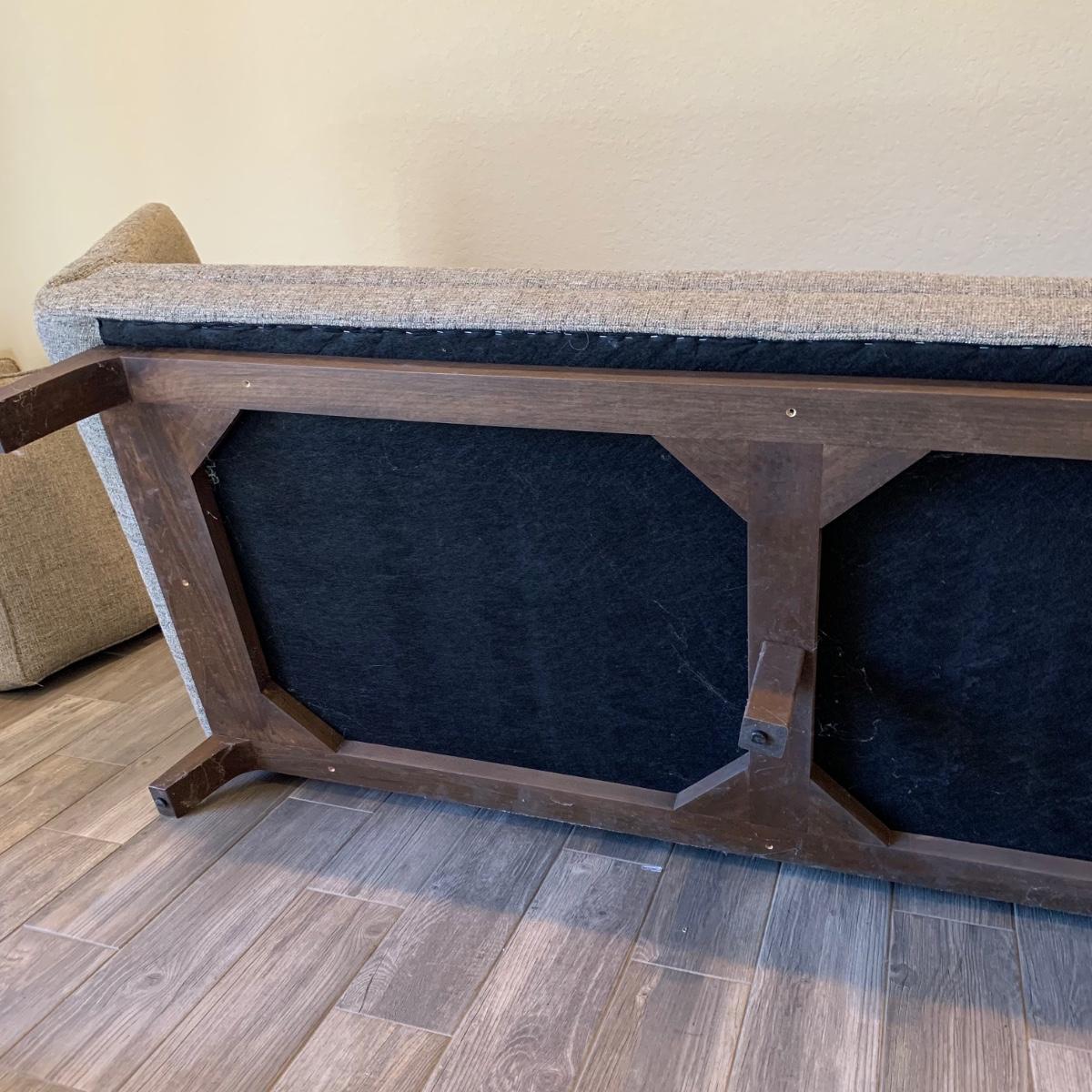 Mid-century style sofa with winged armrests that sits atop wooden feet. Sofa is a light gray color in a tweed like fabric. At its widest point the sofa measures 85” x 37” x 33”. There is some discoloration on one part of the seat and the wood feet have some slight mildew that is easily cleanable. Otherwise this sofa appears to be in good condition, although it could use some cleaning. All cushion covers are removable.
