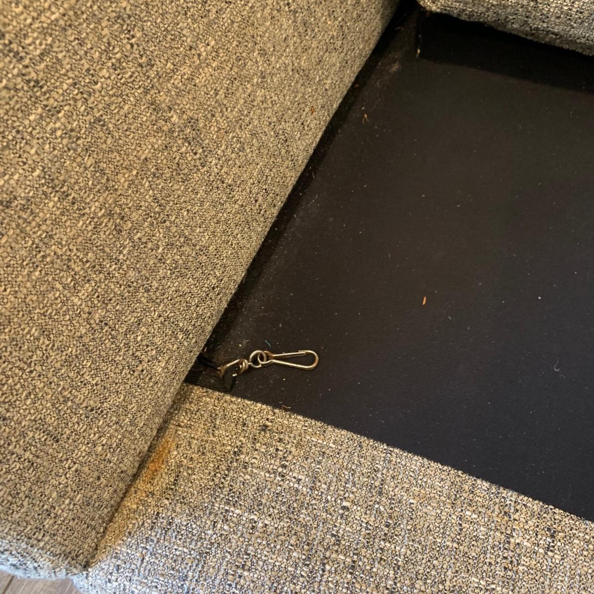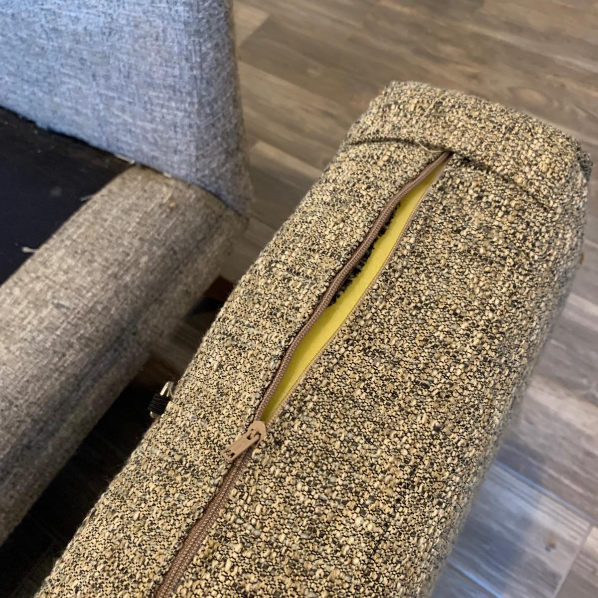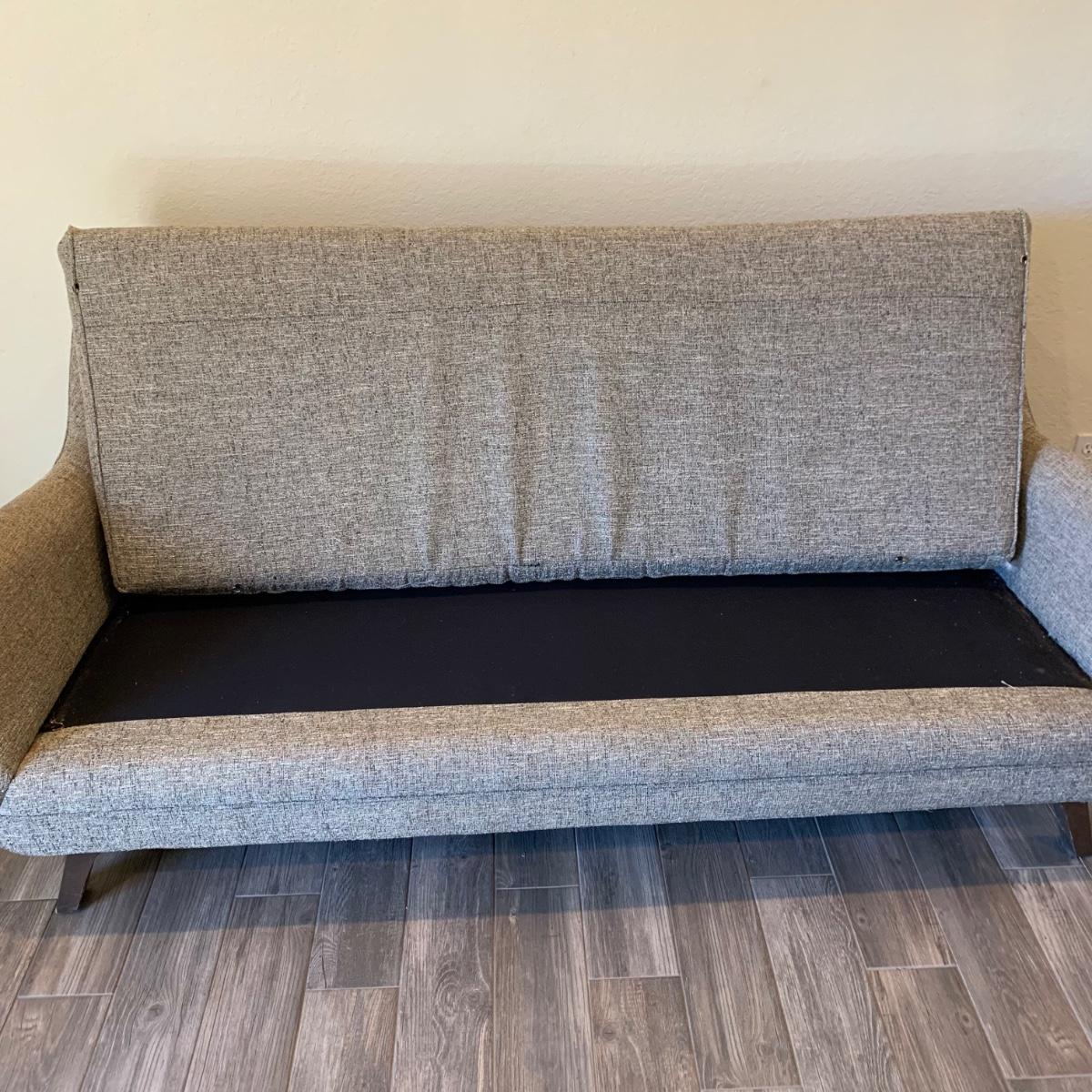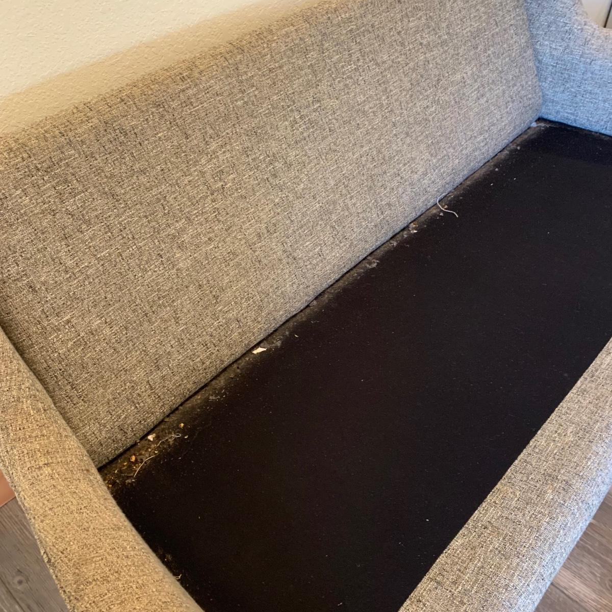 Mid-century style sofa with winged armrests that sits atop wooden feet. Sofa is a light gray color in a tweed like fabric. At its widest point the sofa measures 85” x 37” x 33”. There is some discoloration on one part of the seat and the wood feet have some slight mildew that is easily cleanable. Otherwise this sofa appears to be in good condition, although it could use some cleaning. All cushion covers are removable.