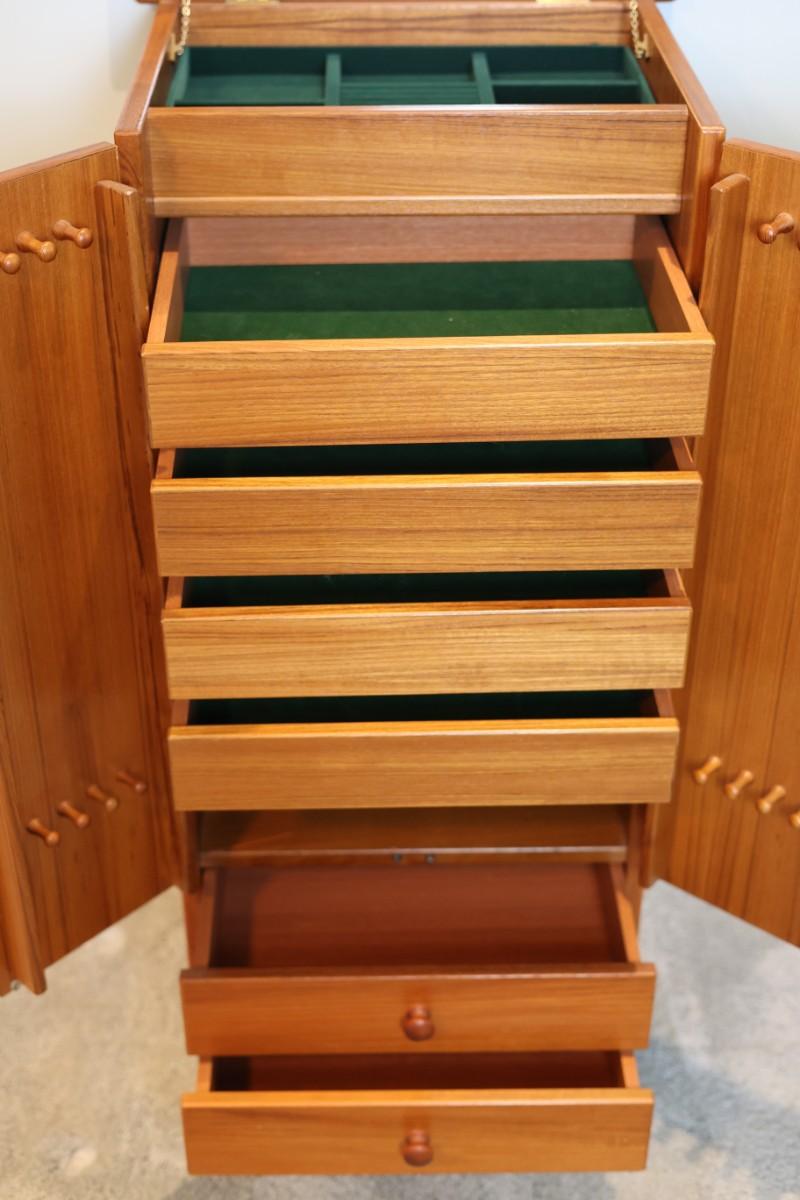 Wooden jewelry cabinet with two front doors, interior jewelry drawers, and flip-up mirror inside top compartment. Two lower exterior drawers for additional storage. Stands on tapered legs. No maker’s mark observed.