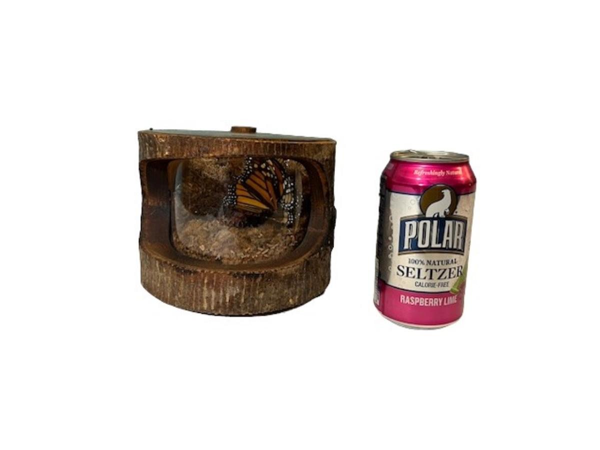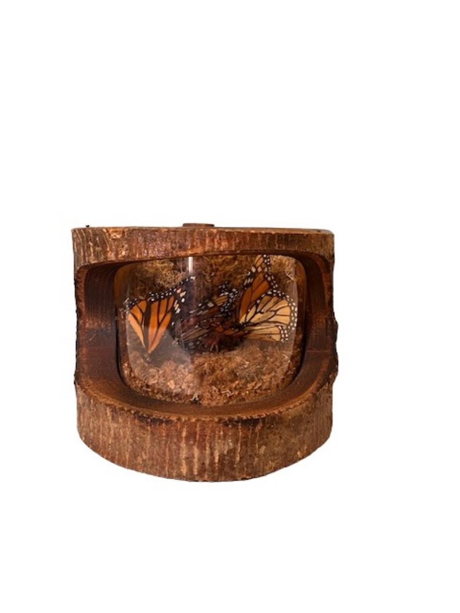 Hollowed out log. Has butterflies, and more. Measurement: 5.5"H x 7"W.