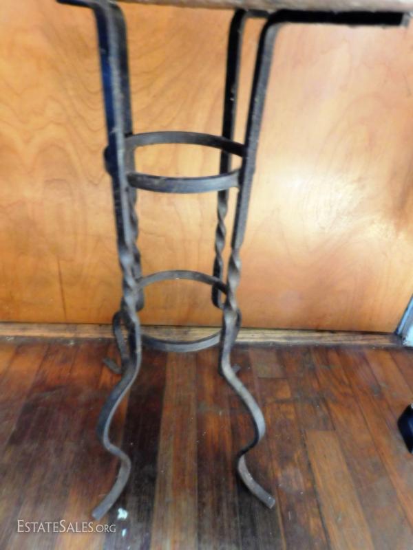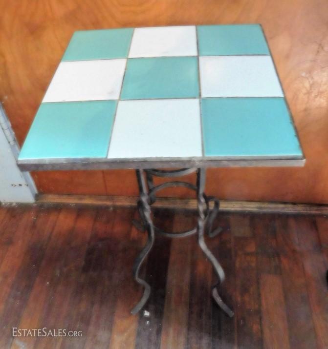 Mid-Century tiled patio table with aqua and white square tiles attached to heavy wrought iron base and legs. Good condition. Needs some cleaning. Nice, heavy piece..