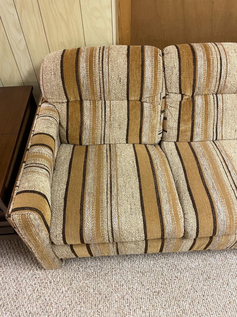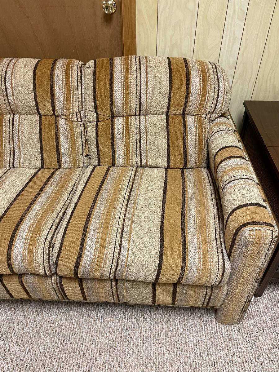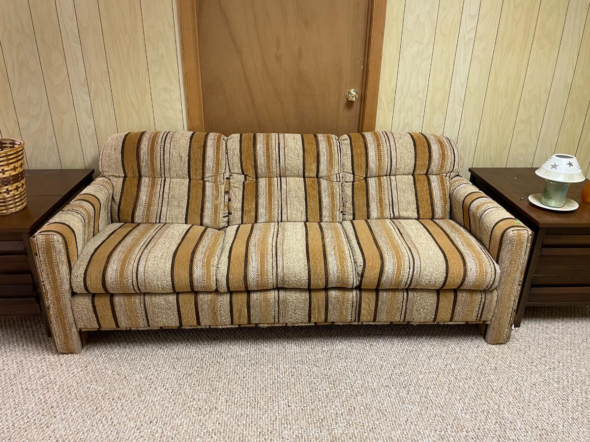 Mid-century sofa featuring a striped beige, brown, and cream upholstery design with tufted back cushions. The sofa measures approximately 5'7" wide, 3'4" deep, and 30" high. Accented with wooden side panels featuring a textured design. Appears to be a sturdy and functional piece; condition may include minor wear consistent with age. Ideal for living spaces or retro-themed interiors.