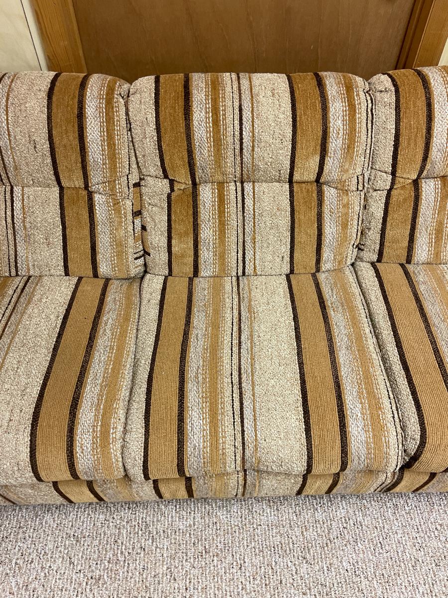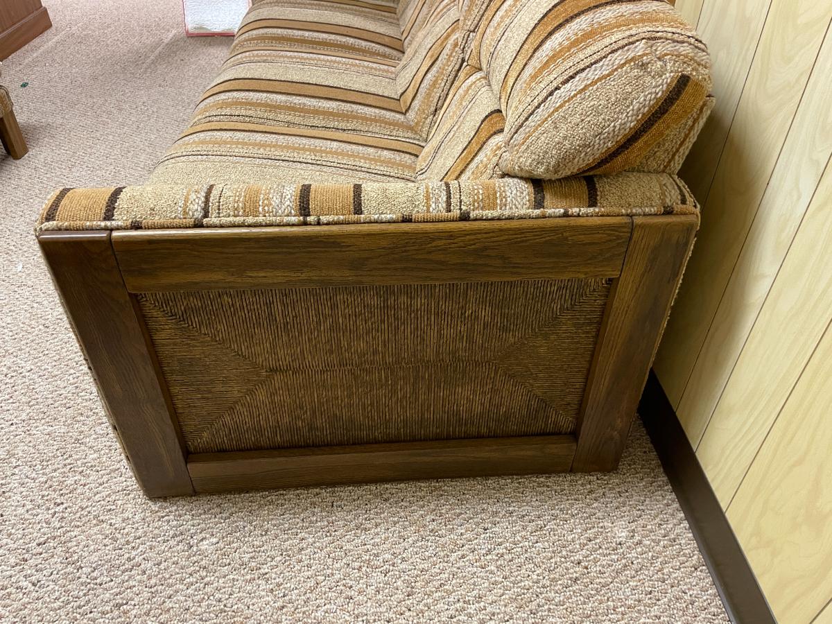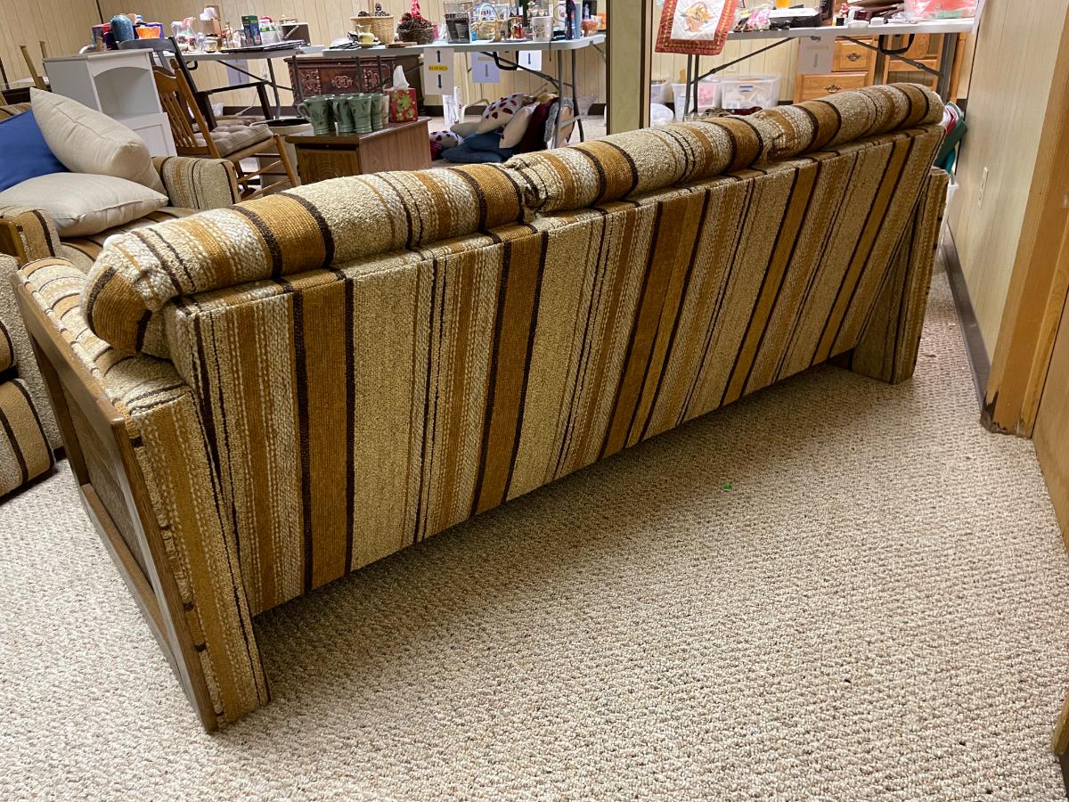 Mid-century sofa featuring a striped beige, brown, and cream upholstery design with tufted back cushions. The sofa measures approximately 5'7" wide, 3'4" deep, and 30" high. Accented with wooden side panels featuring a textured design. Appears to be a sturdy and functional piece; condition may include minor wear consistent with age. Ideal for living spaces or retro-themed interiors.