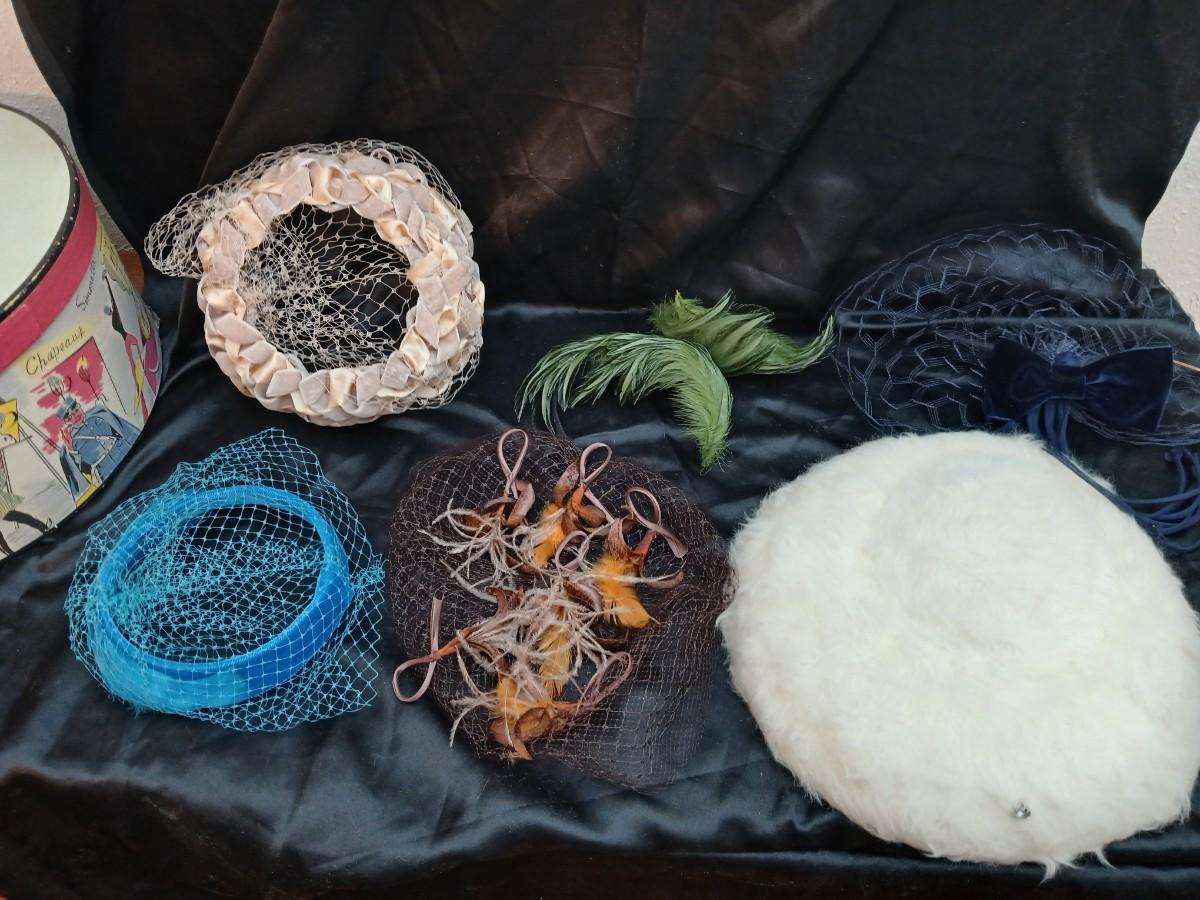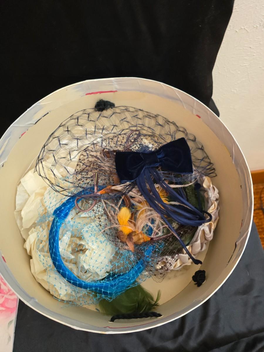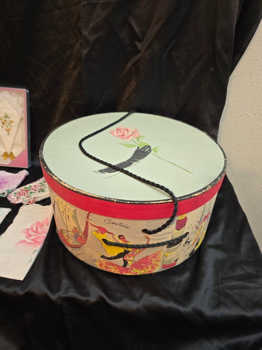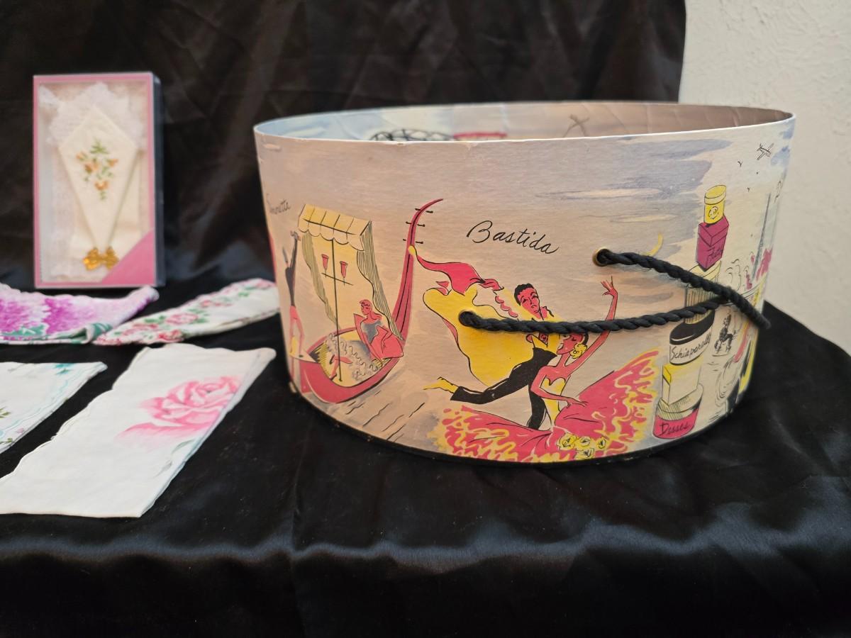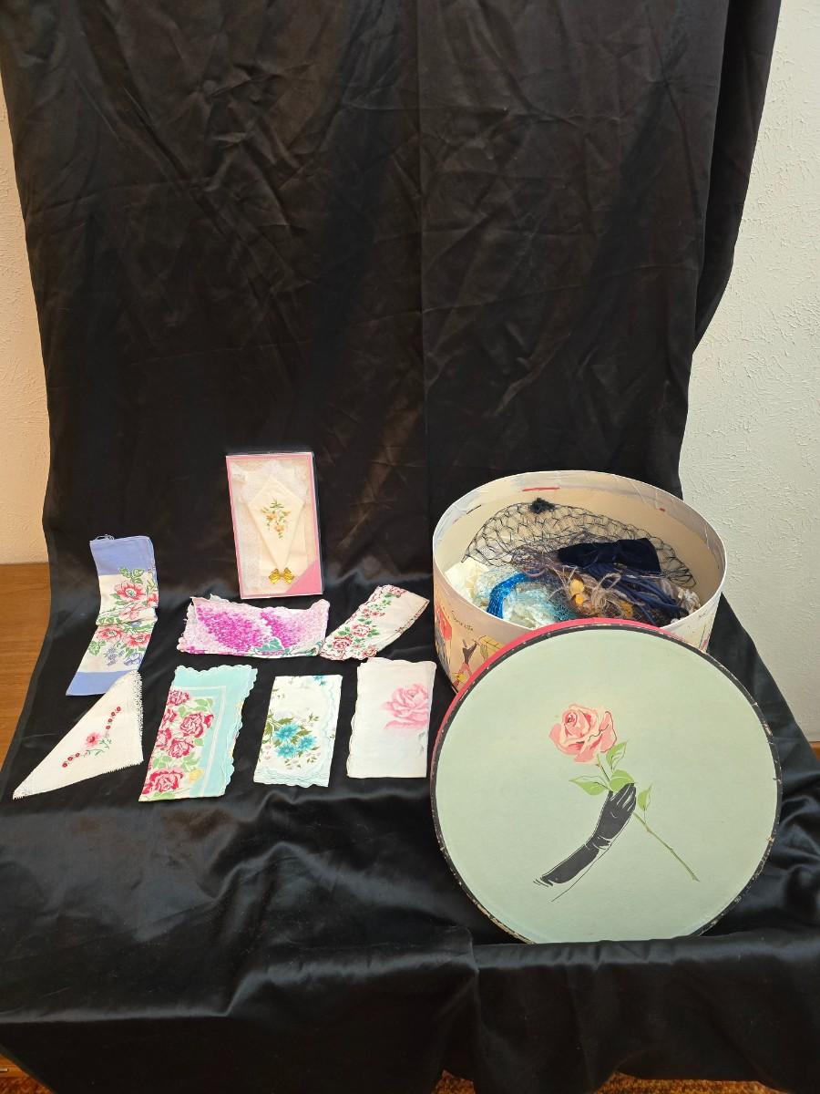 Mid-Century Vintage Hat Box with an assortment of Women's Collectible hats / veils & Vintage linen handkerchiefs.
