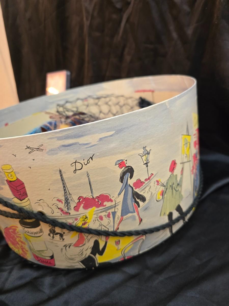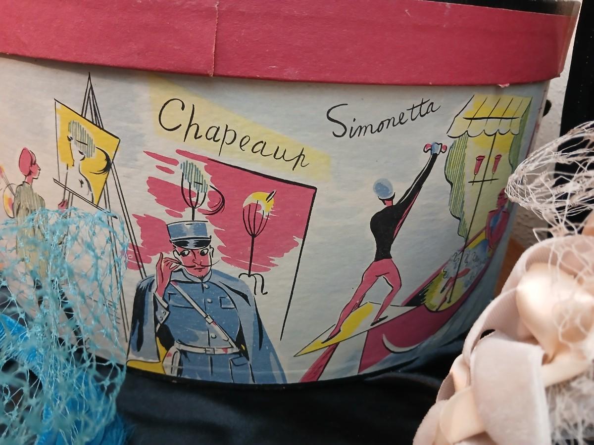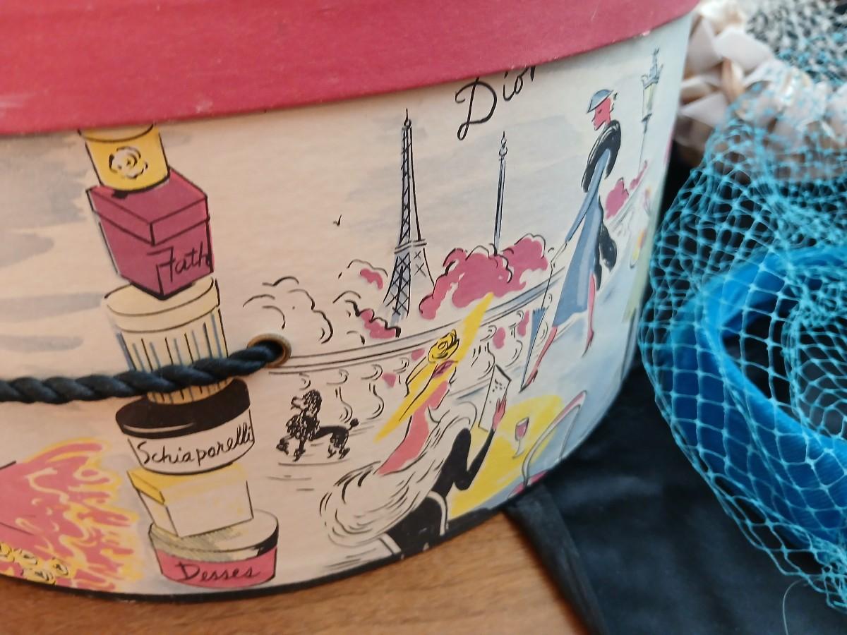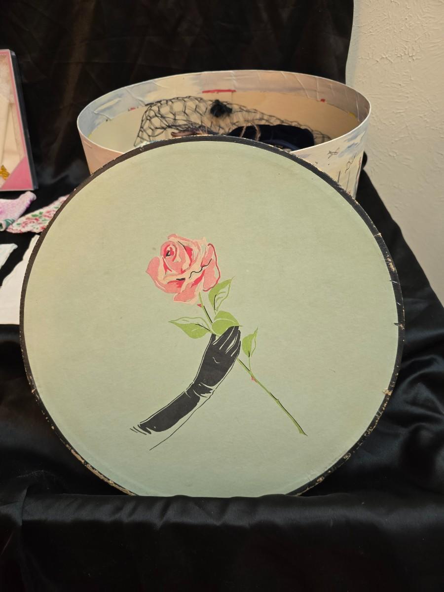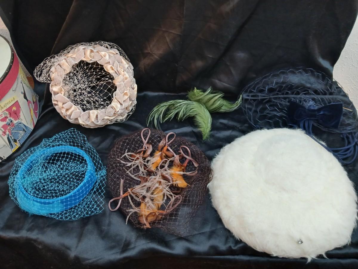 Mid-Century Vintage Hat Box with an assortment of Women's Collectible hats / veils & Vintage linen handkerchiefs.
