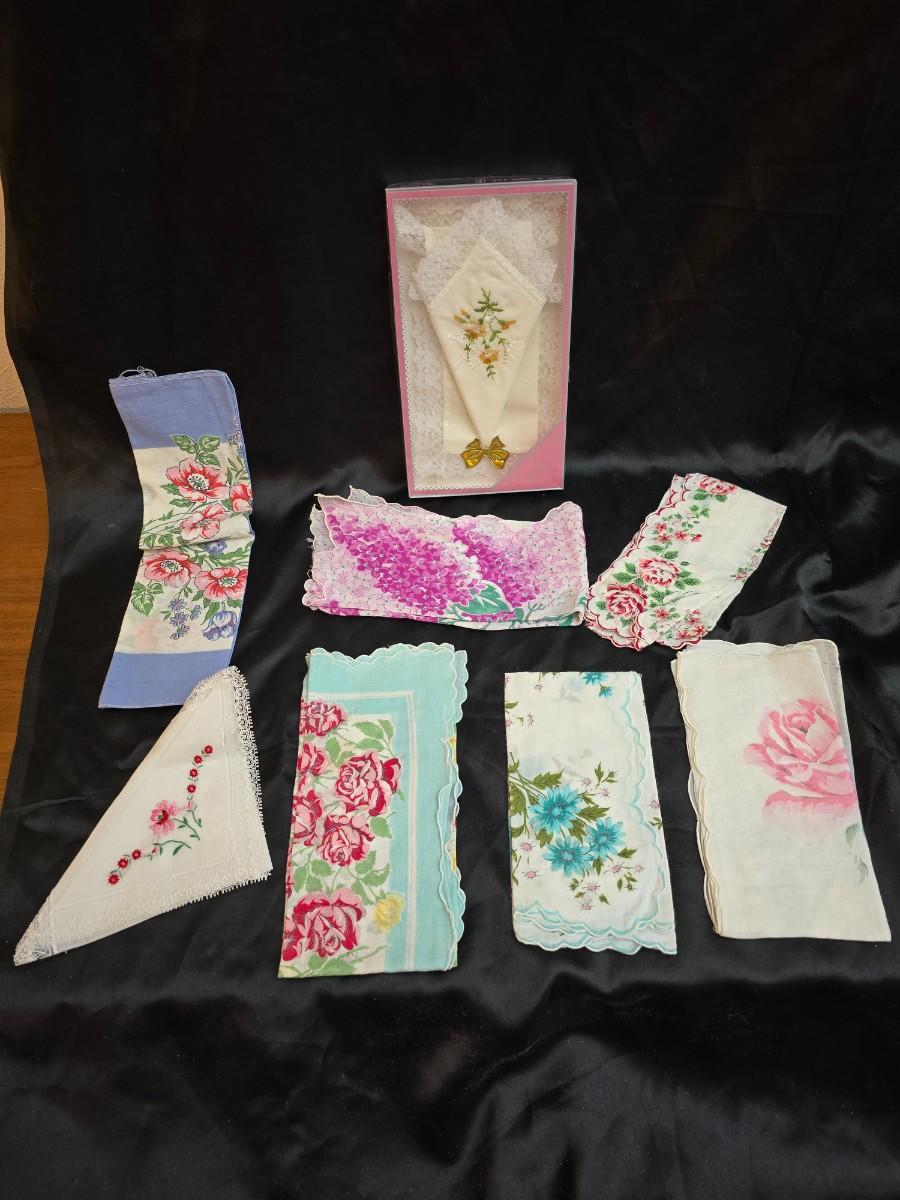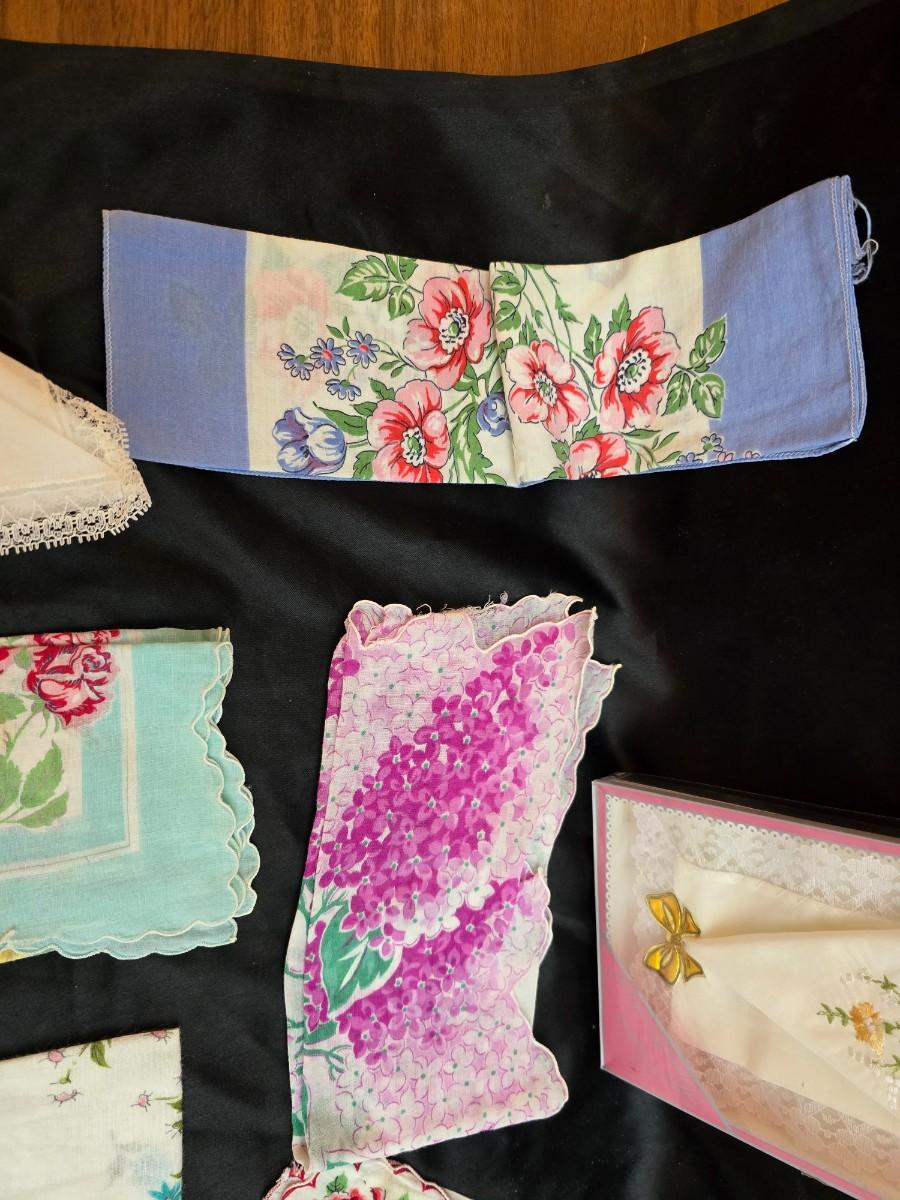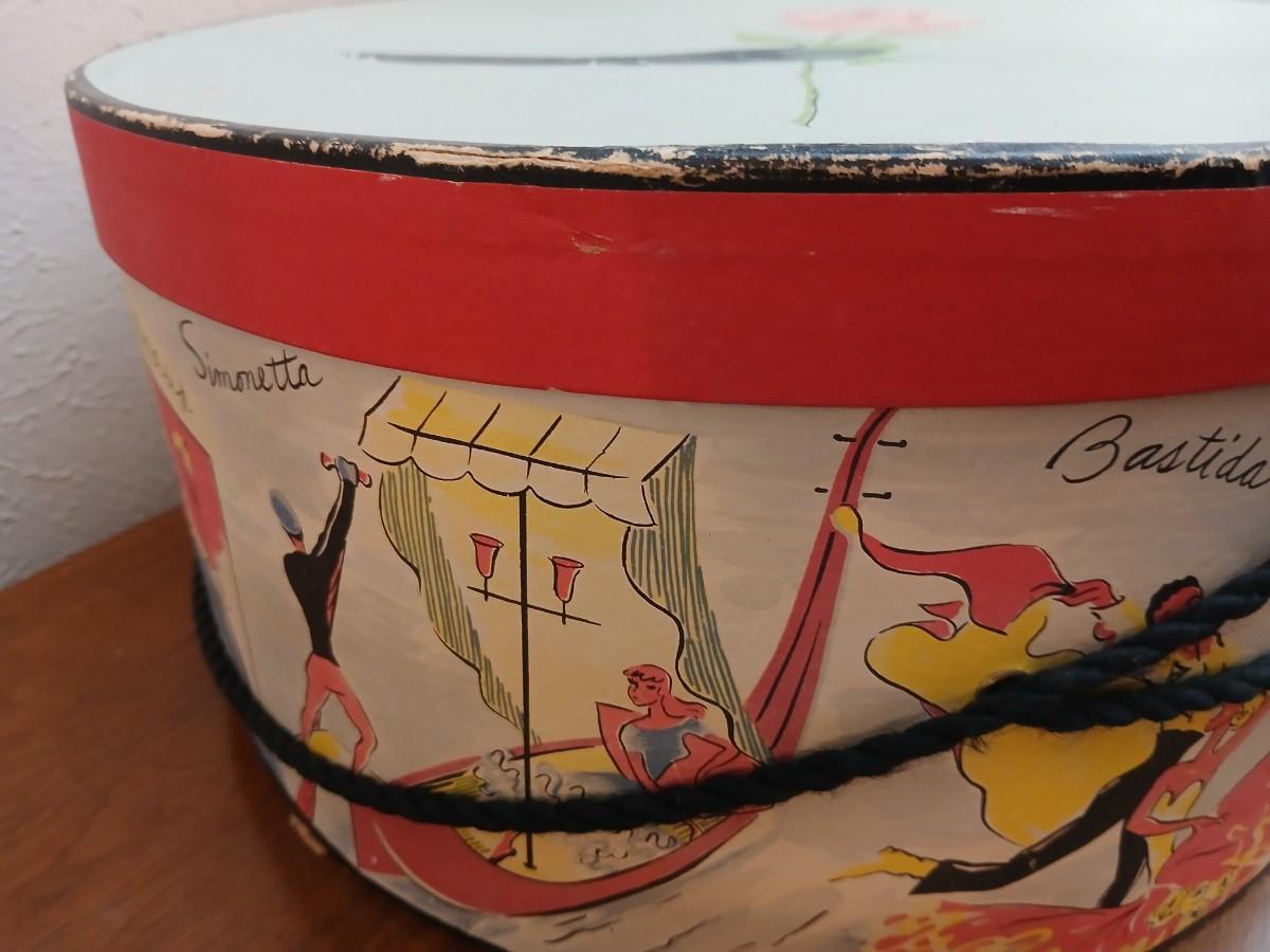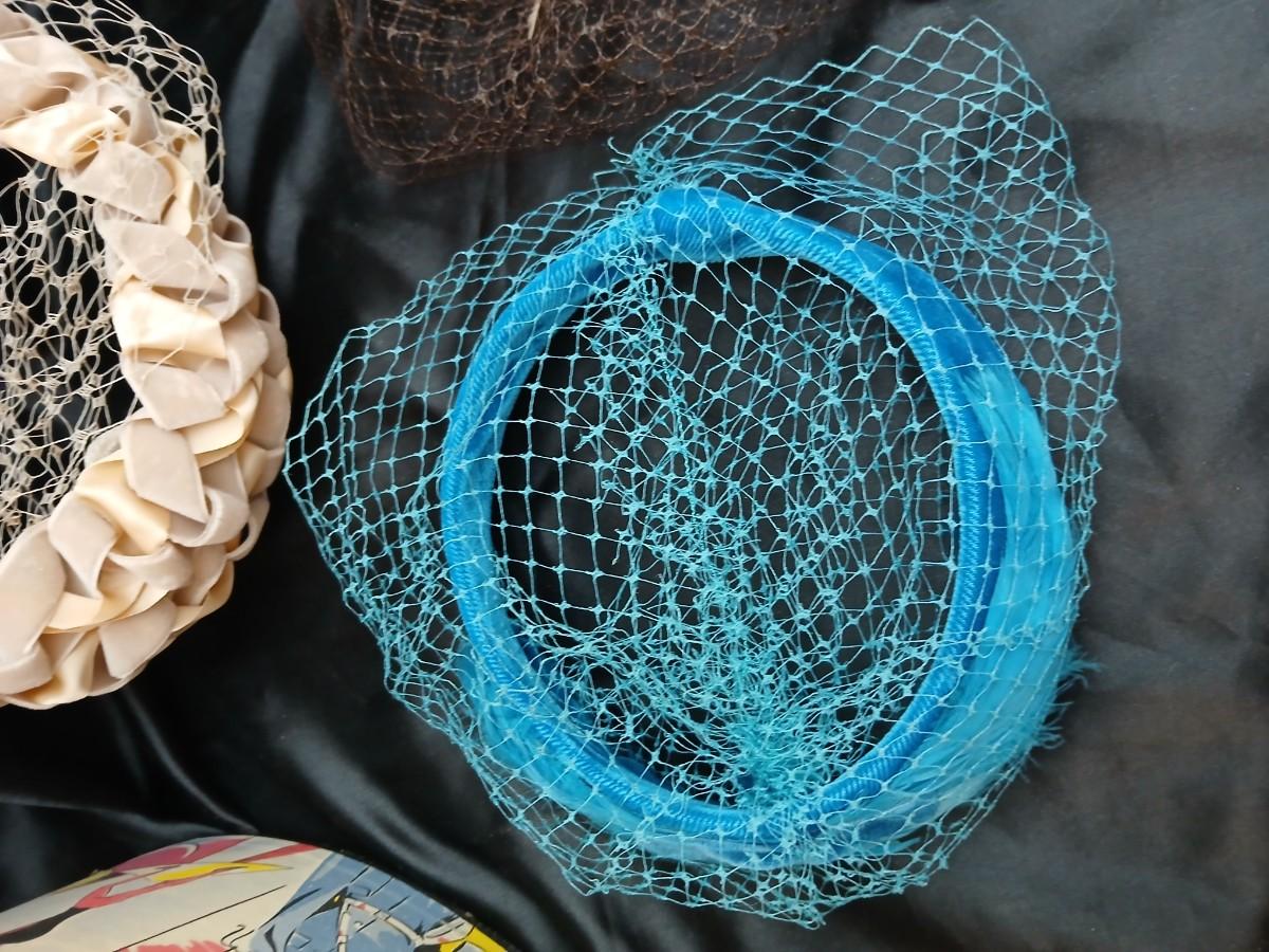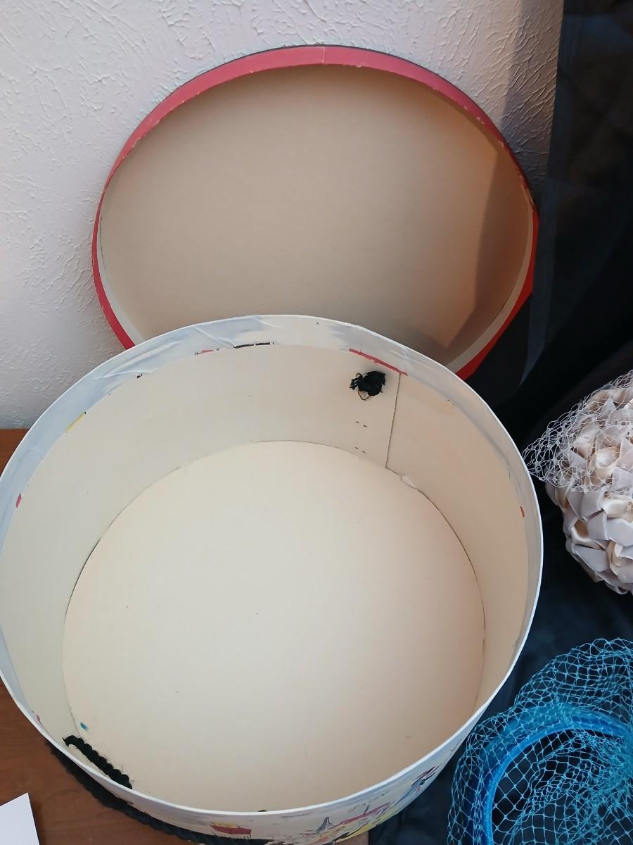Mid-Century Vintage Hat Box with an assortment of Women's Collectible hats / veils & Vintage linen handkerchiefs.