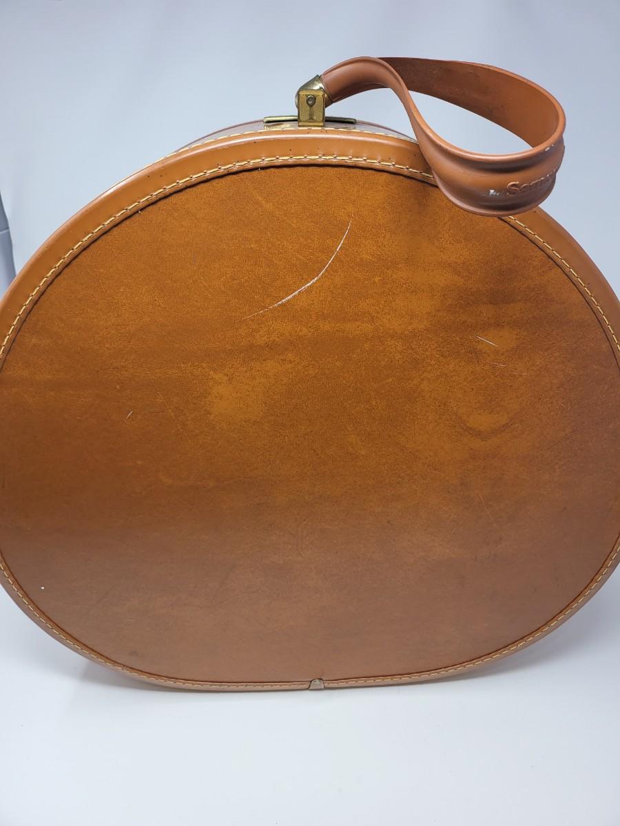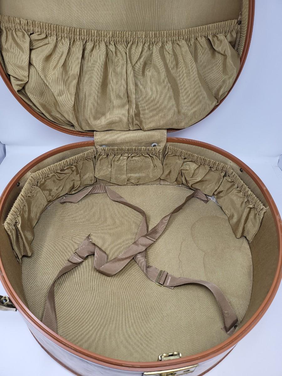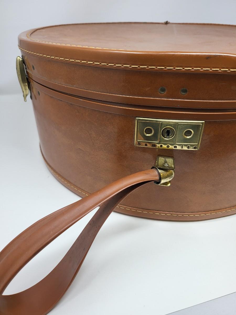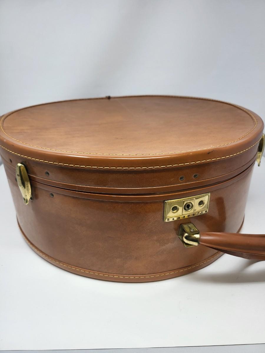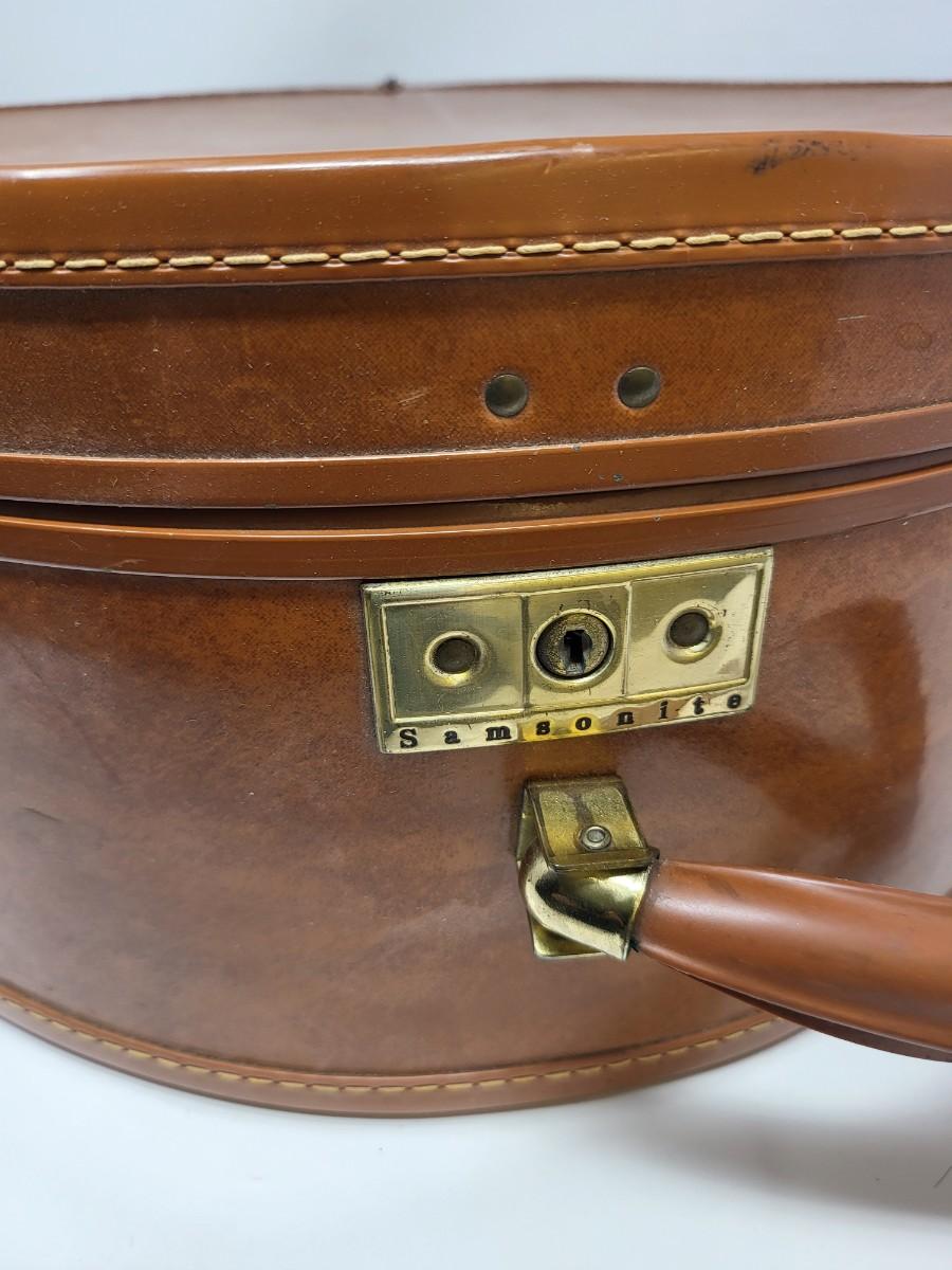 Vintage women's carry-on, round Samsonite luggage, suitcase. Perfect for ladies' accessories, cosmetics & under garments. Measures 18" long x 16" tall x 7" deep. Hand strap. Camel brown. Very good condition.