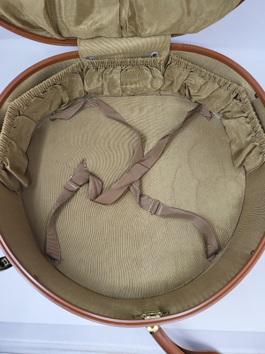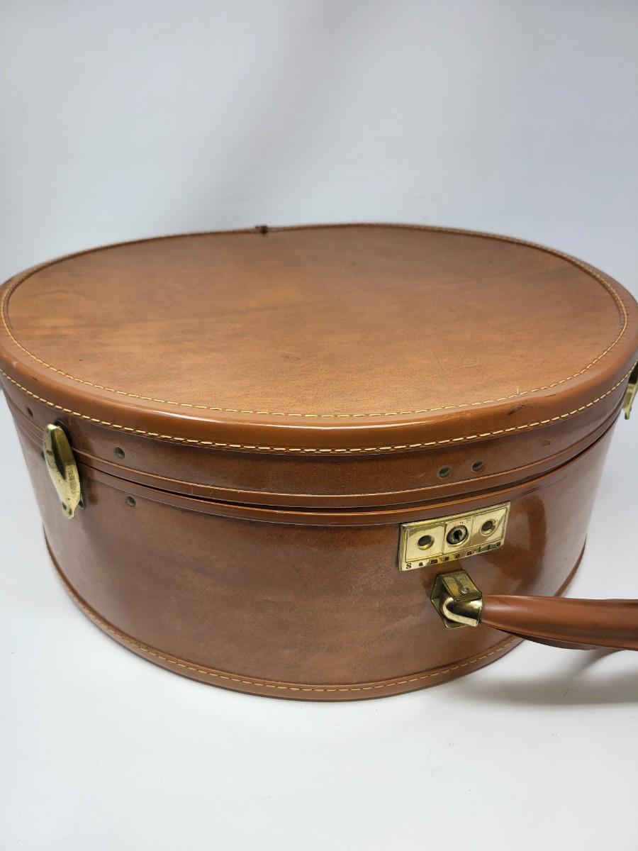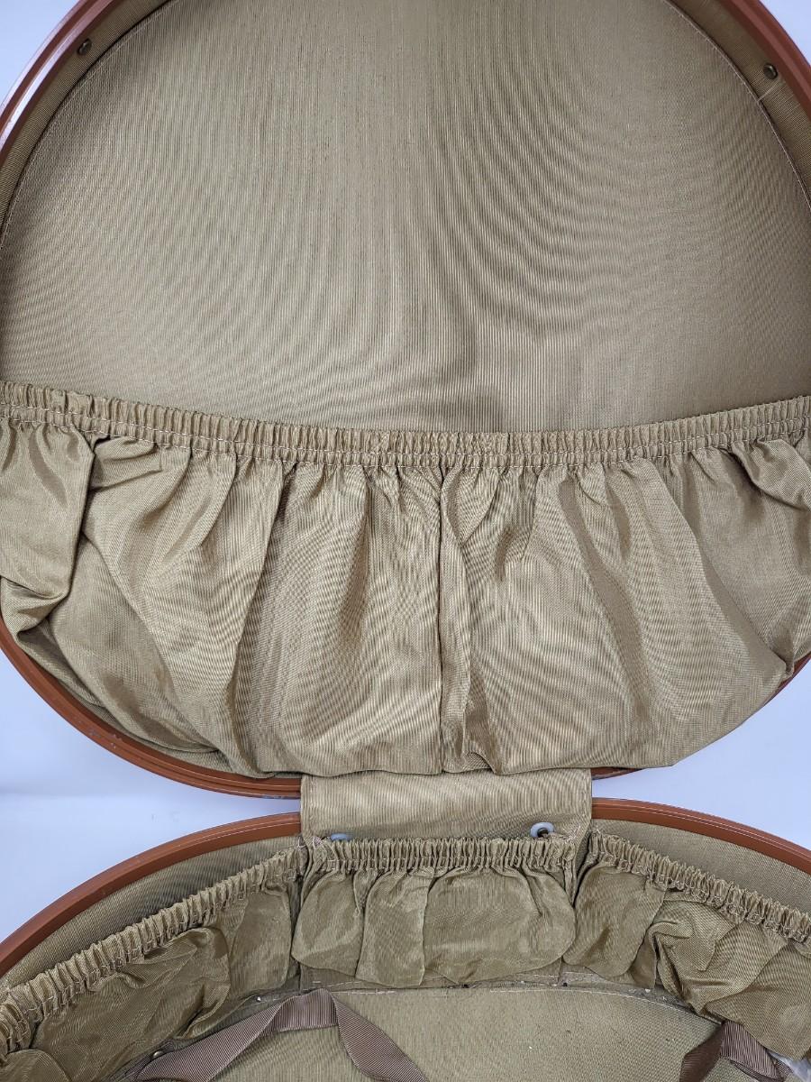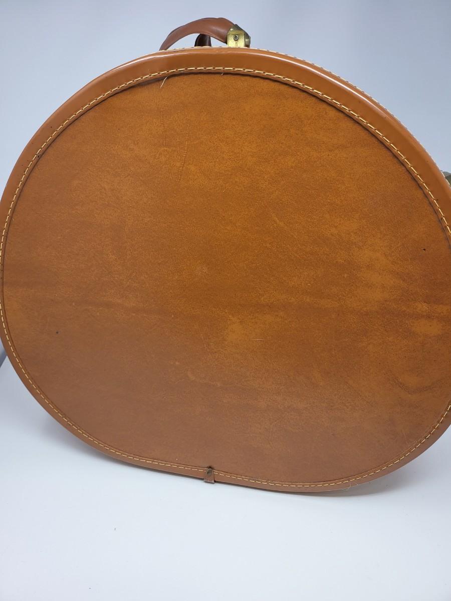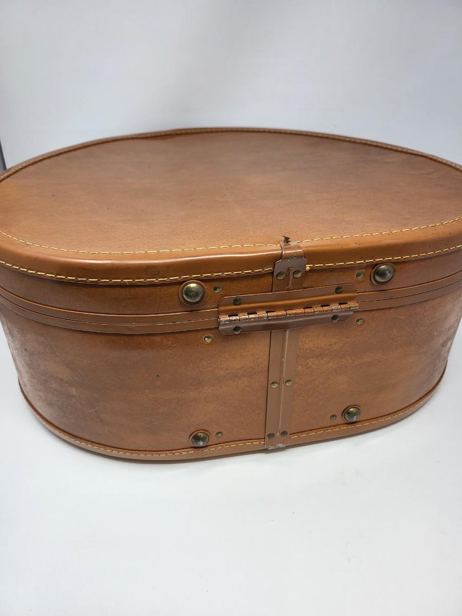 Vintage women's carry-on, round Samsonite luggage, suitcase. Perfect for ladies' accessories, cosmetics & under garments. Measures 18" long x 16" tall x 7" deep. Hand strap. Camel brown. Very good condition.
