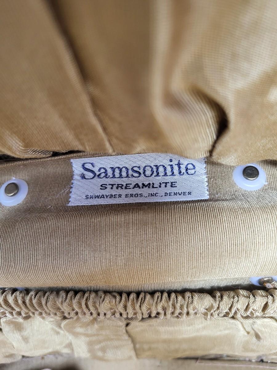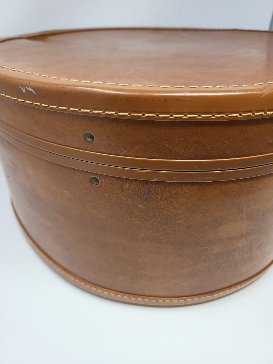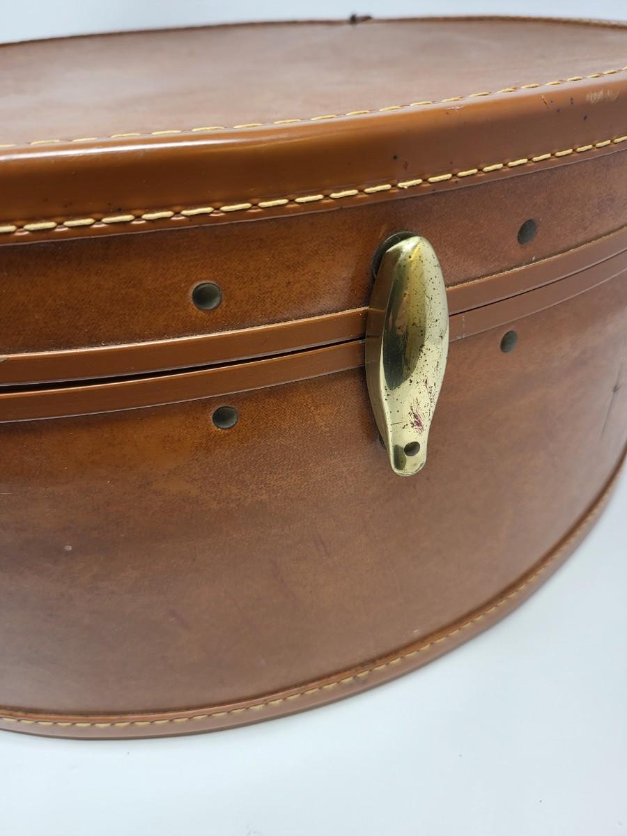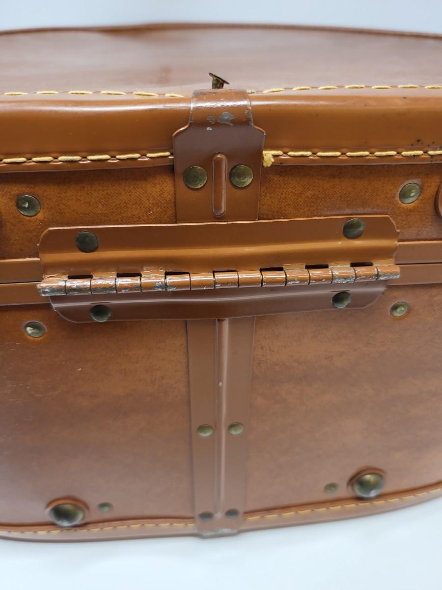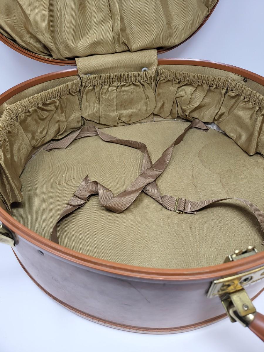 Vintage women's carry-on, round Samsonite luggage, suitcase. Perfect for ladies' accessories, cosmetics & under garments. Measures 18" long x 16" tall x 7" deep. Hand strap. Camel brown. Very good condition.