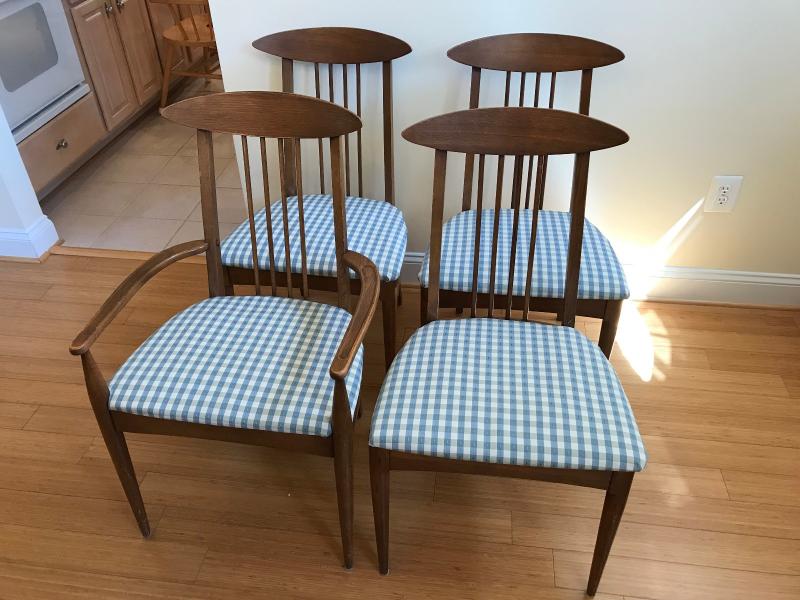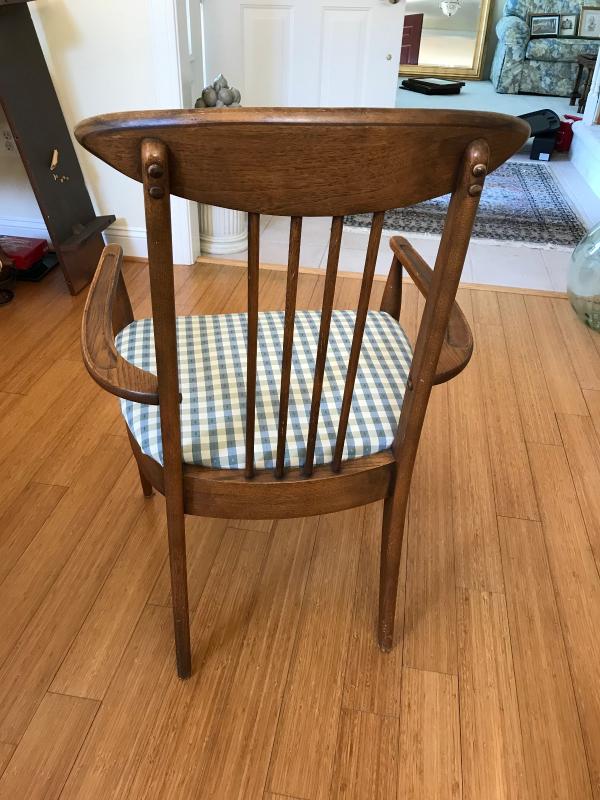 Very nice walnut mid-century dining extension table with four matching chairs by Lenoir Chair Company of Lenoir, North Carolina for the Broyhill Sculptra Collection. Table is a rounded rectangle shape with one extension leaf and turned tapered legs. One arm chair and three side dining chairs. Chairs feature a football shaped back rail is supported by turned spindles, while turned tapered legs support the upholstered seat with a green, blue, and cream check fabric. Arm chair 21 1/2" x 22" x 36"H. Table with leaf 42" x 54" x 30"H