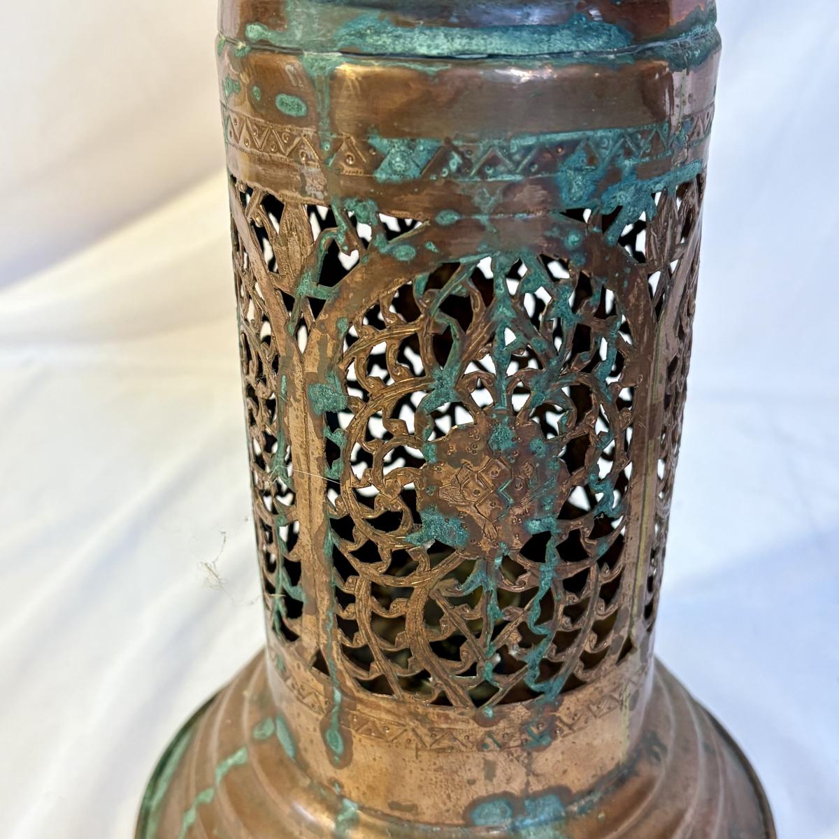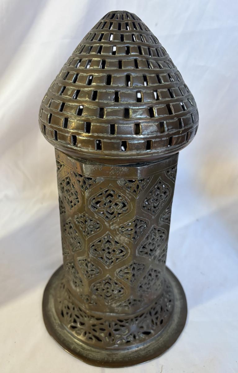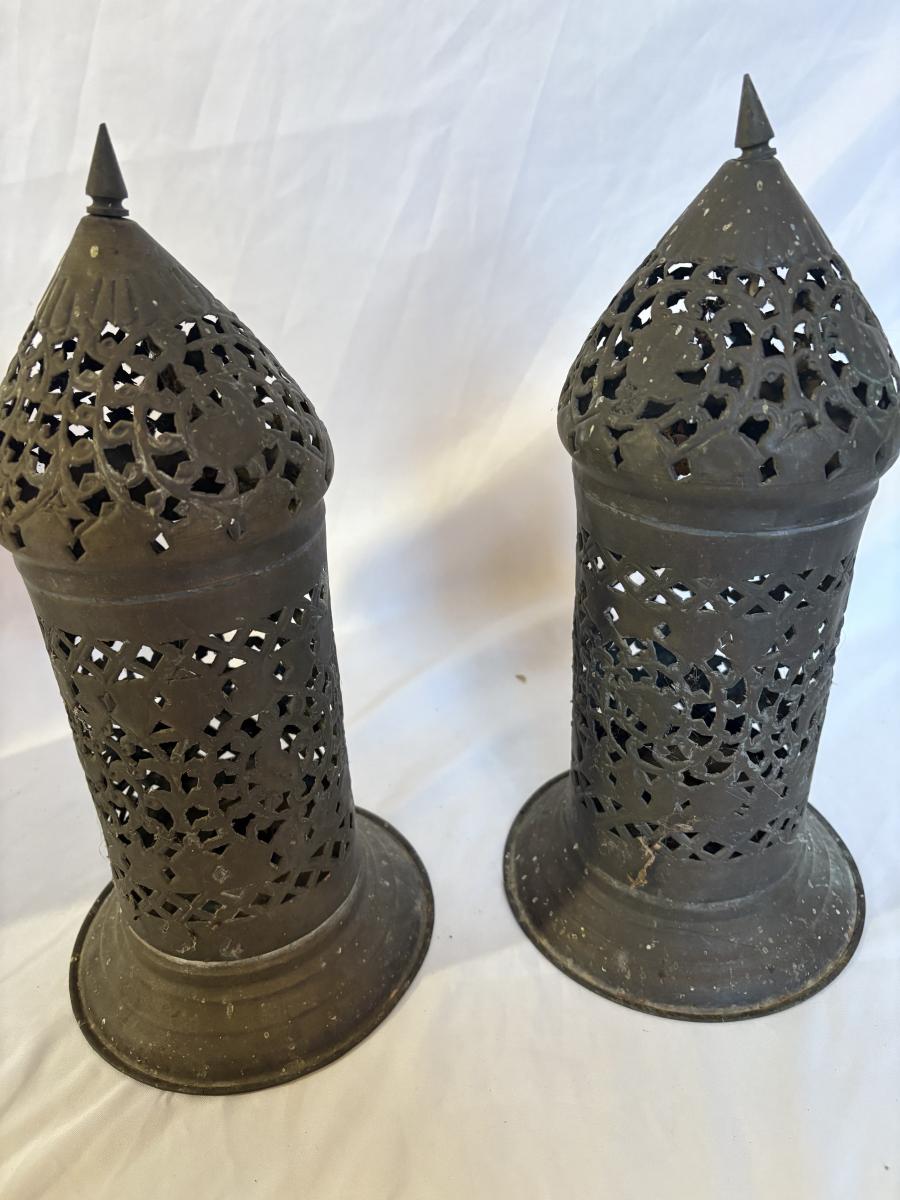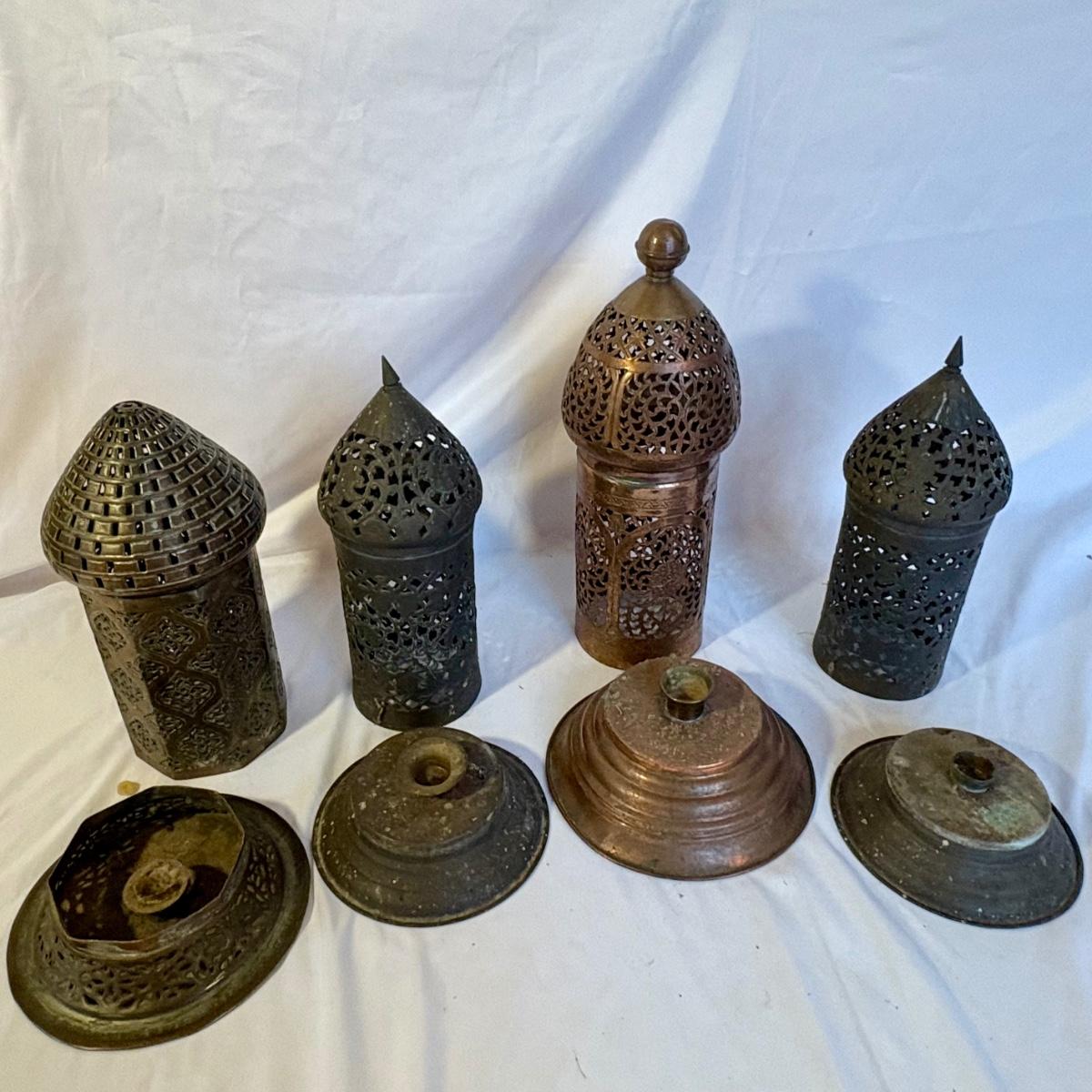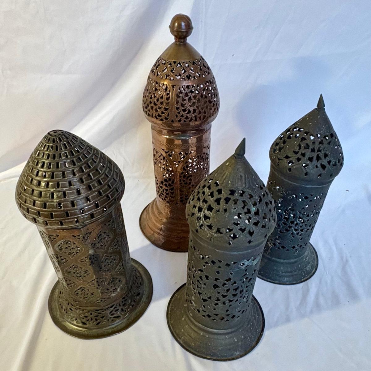 Four metal lanterns are beautifully weathered. Copper lantern is 7.25”D at base x 16.5”H. The other three are all about 13”H. Items are light weight.