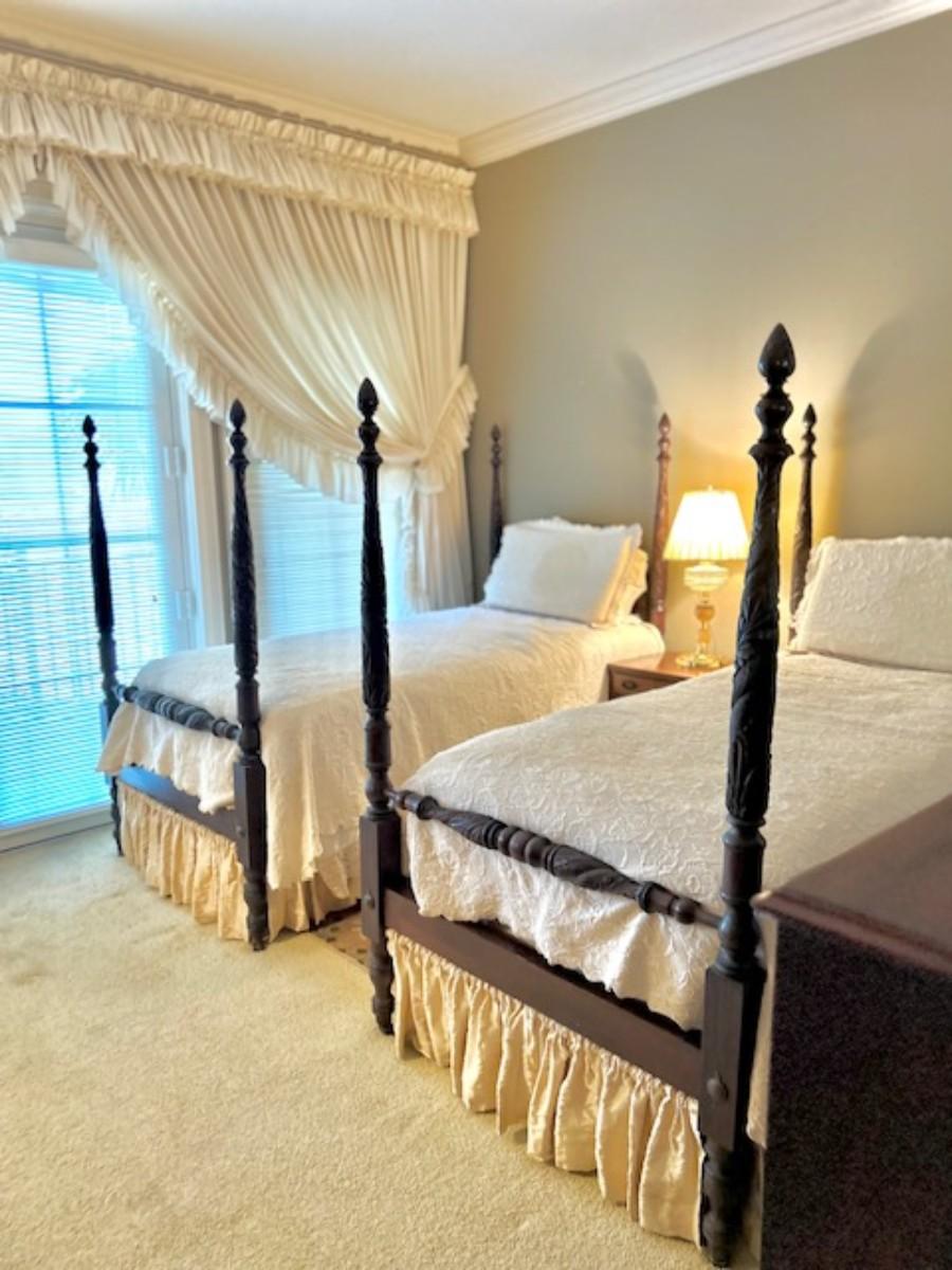 Turned post with tobacco leaf banding, paneled headboards with scroll tops, vase feet. Fair condition, need some shoring up and light refinishing. These twin beds were part of the Lane Middleton estate and used as templets for the Baker Furniture Historic Charleston Foundation Collection. Appraised by Read & Mullin for $2200.
