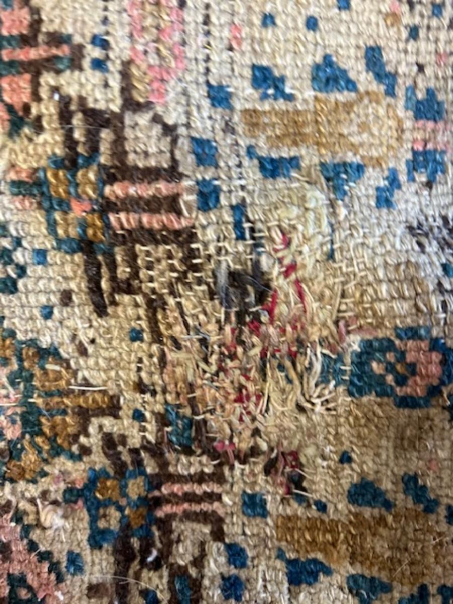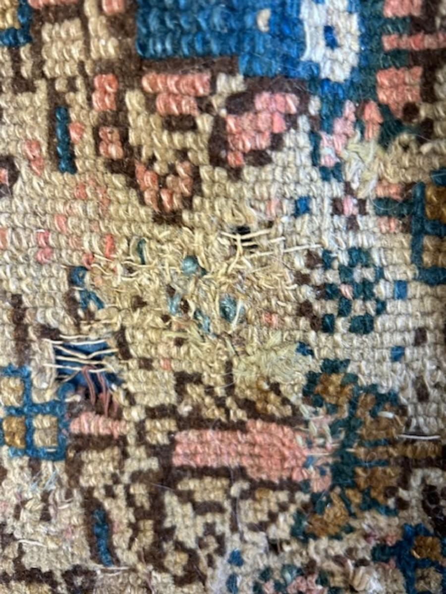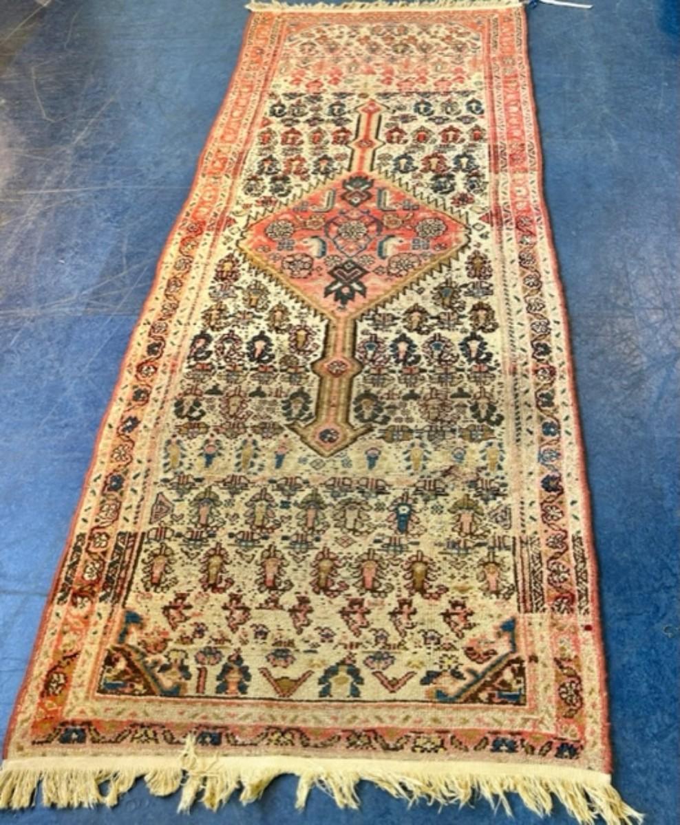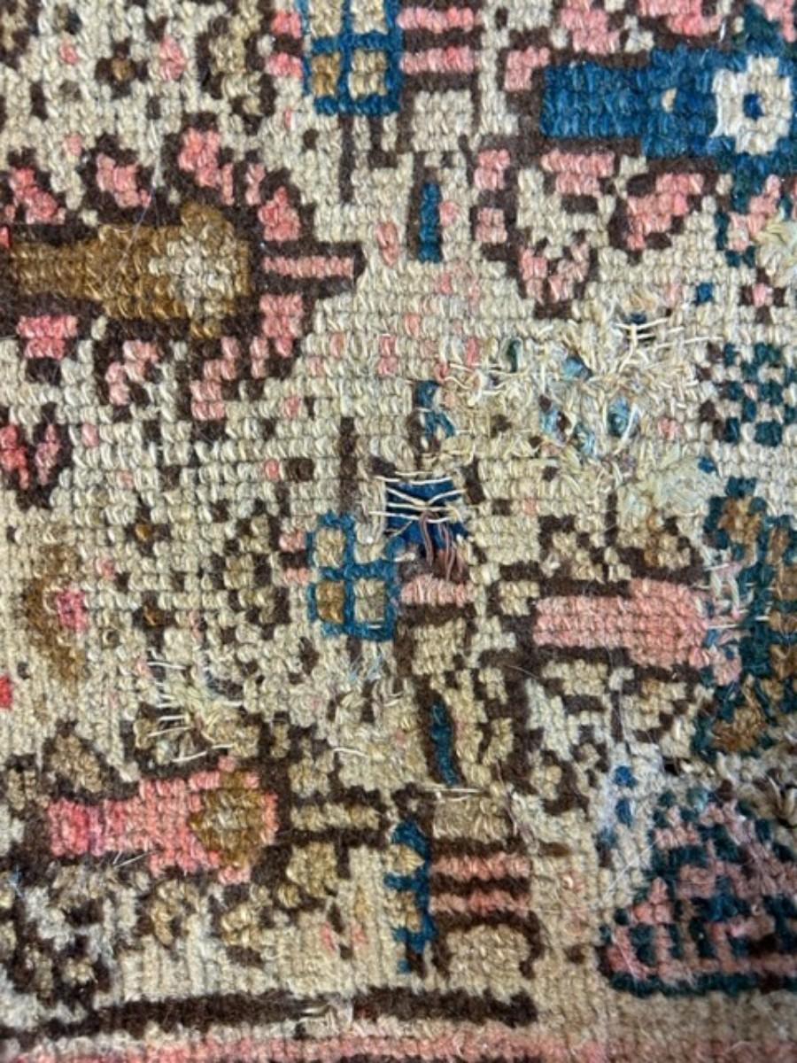 Beautiful coloring. A central bar medallion on red/pink ground on an ivory field with mir bothehs, red/pink main and ivory guard borders. Age and wear with a small hole. When rug is flat on floor the hole is not visible. This rug was part of the Lane Middleton Estate. This rug was appraised for $850 by Read & Mullin LLC.